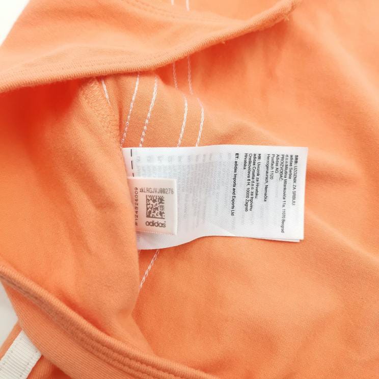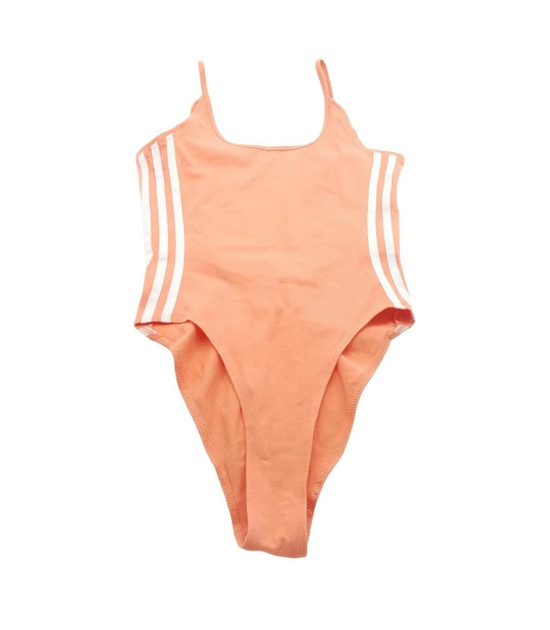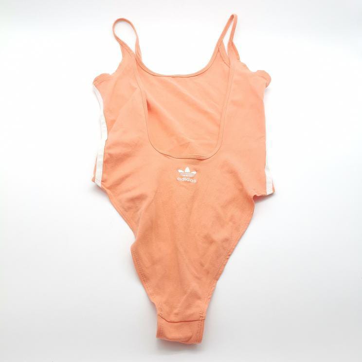 Bodysuit in 93% cotton and elastane, orangey pink. White bands on the sides and brand logo on the back side. Size Small.