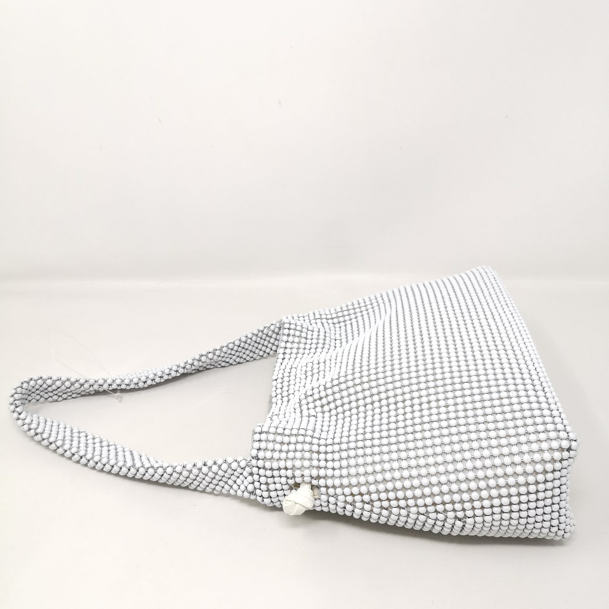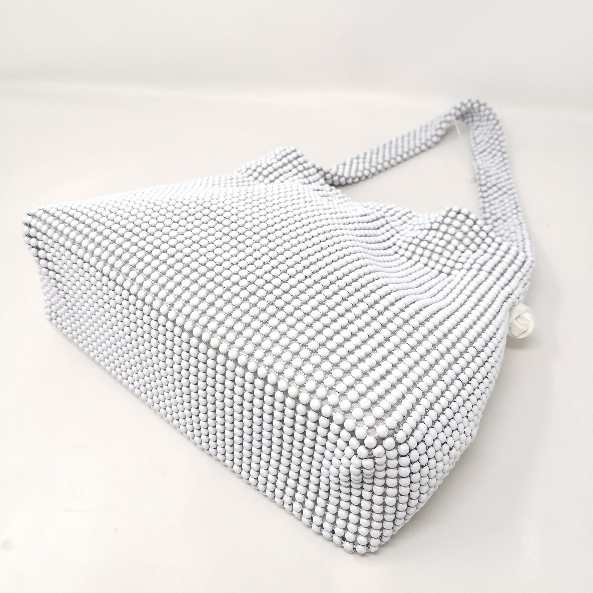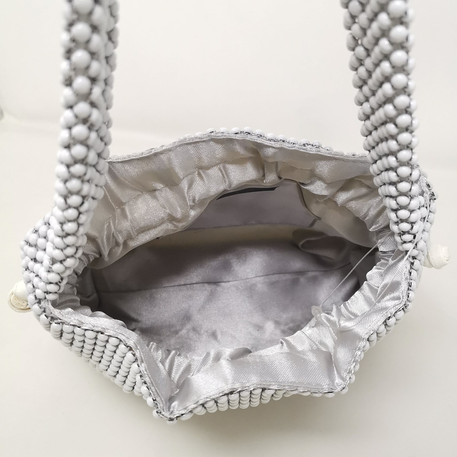 Handbag with white beads, single handle and drawstring closure. Satin interior with small pocket. 21x17x6 cm. Handle height 20 cm. Made in Italy.