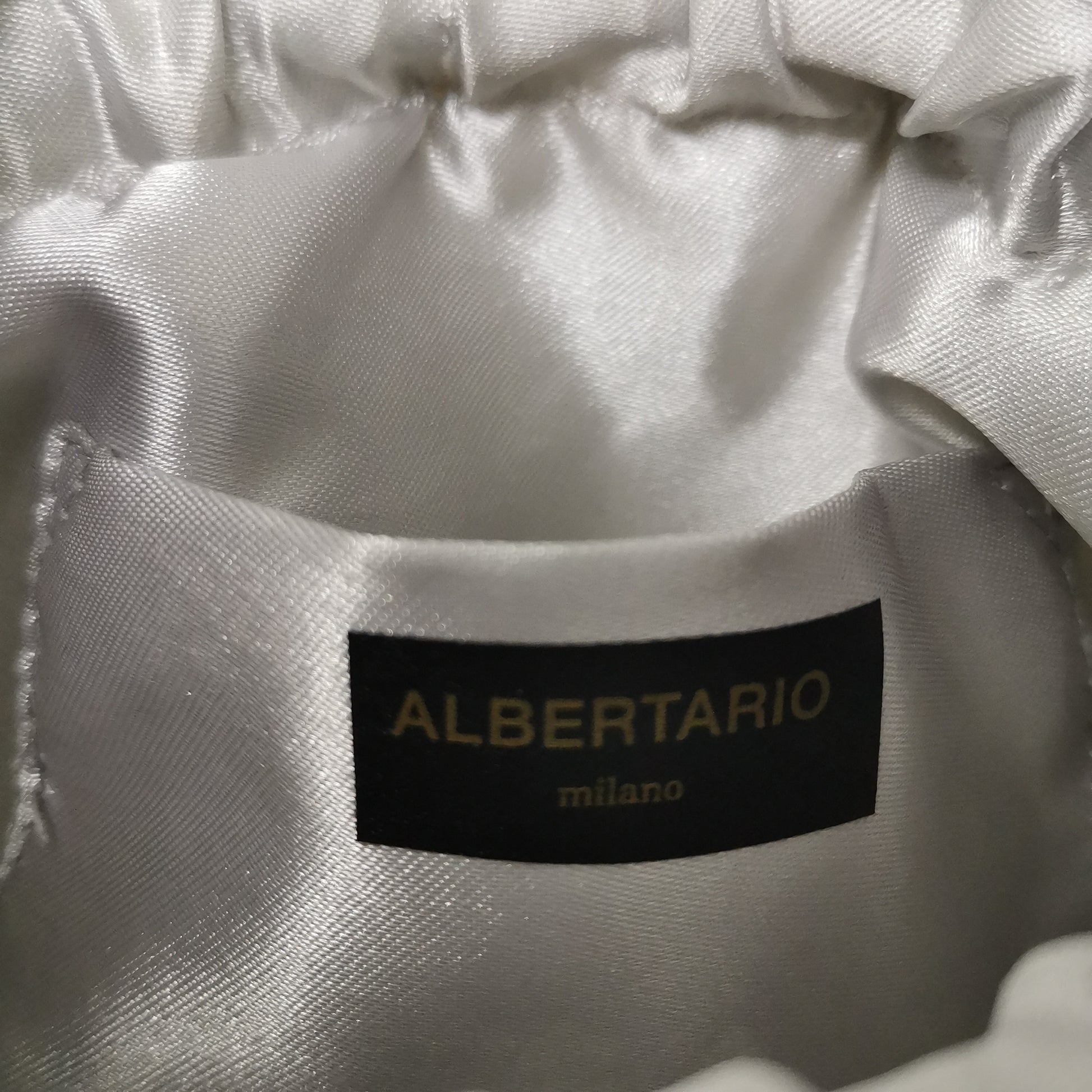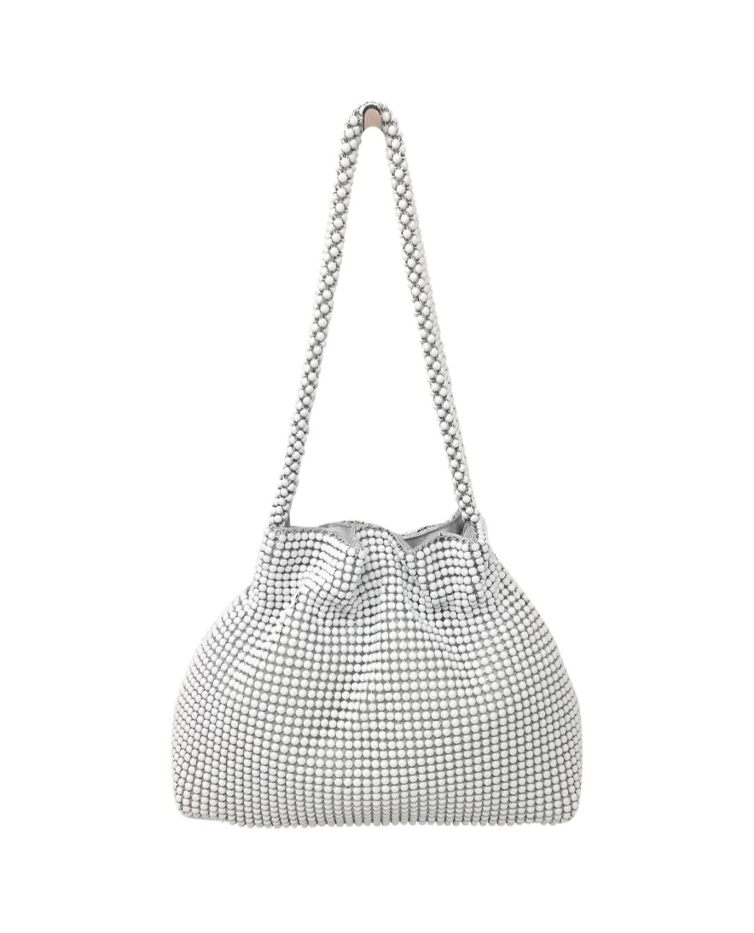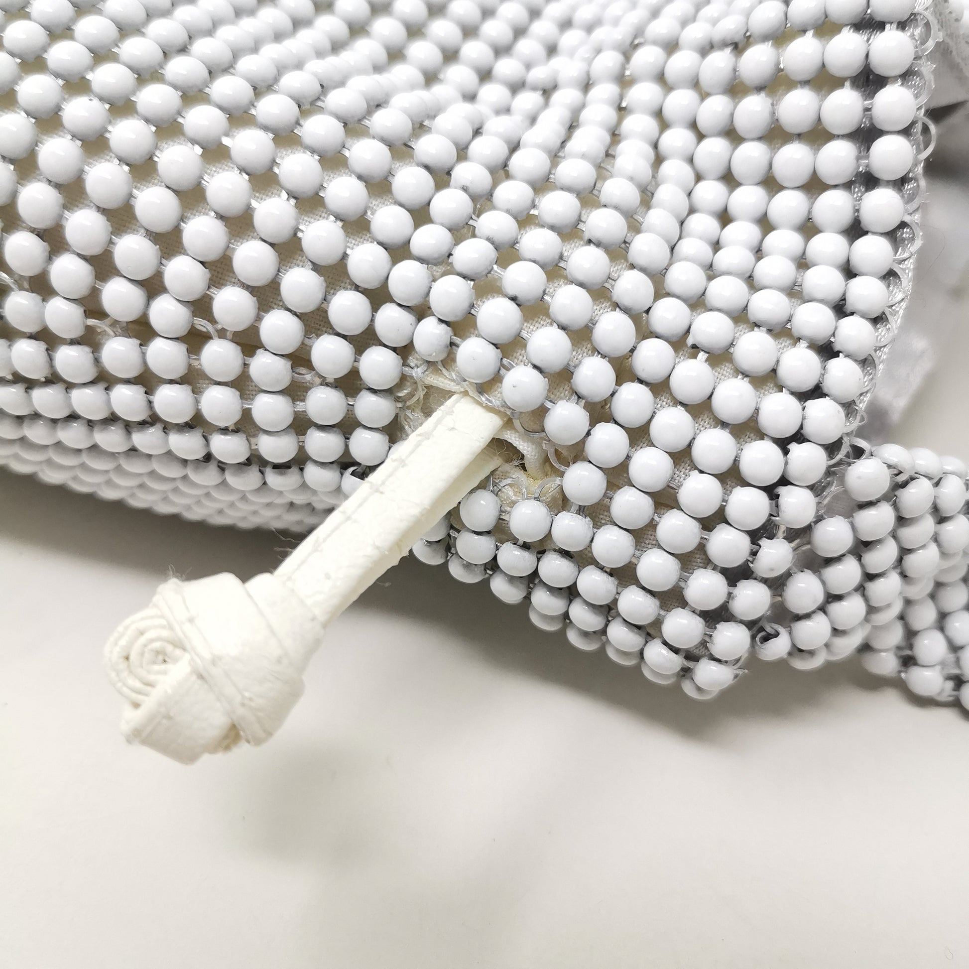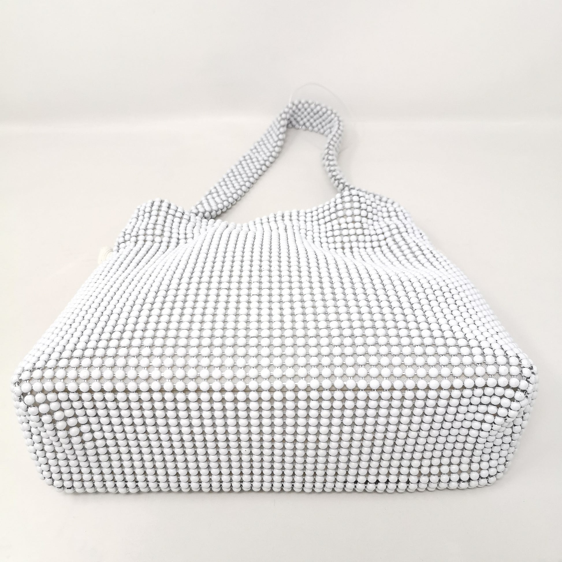 Handbag with white beads, single handle and drawstring closure. Satin interior with small pocket. 21x17x6 cm. Handle height 20 cm. Made in Italy.