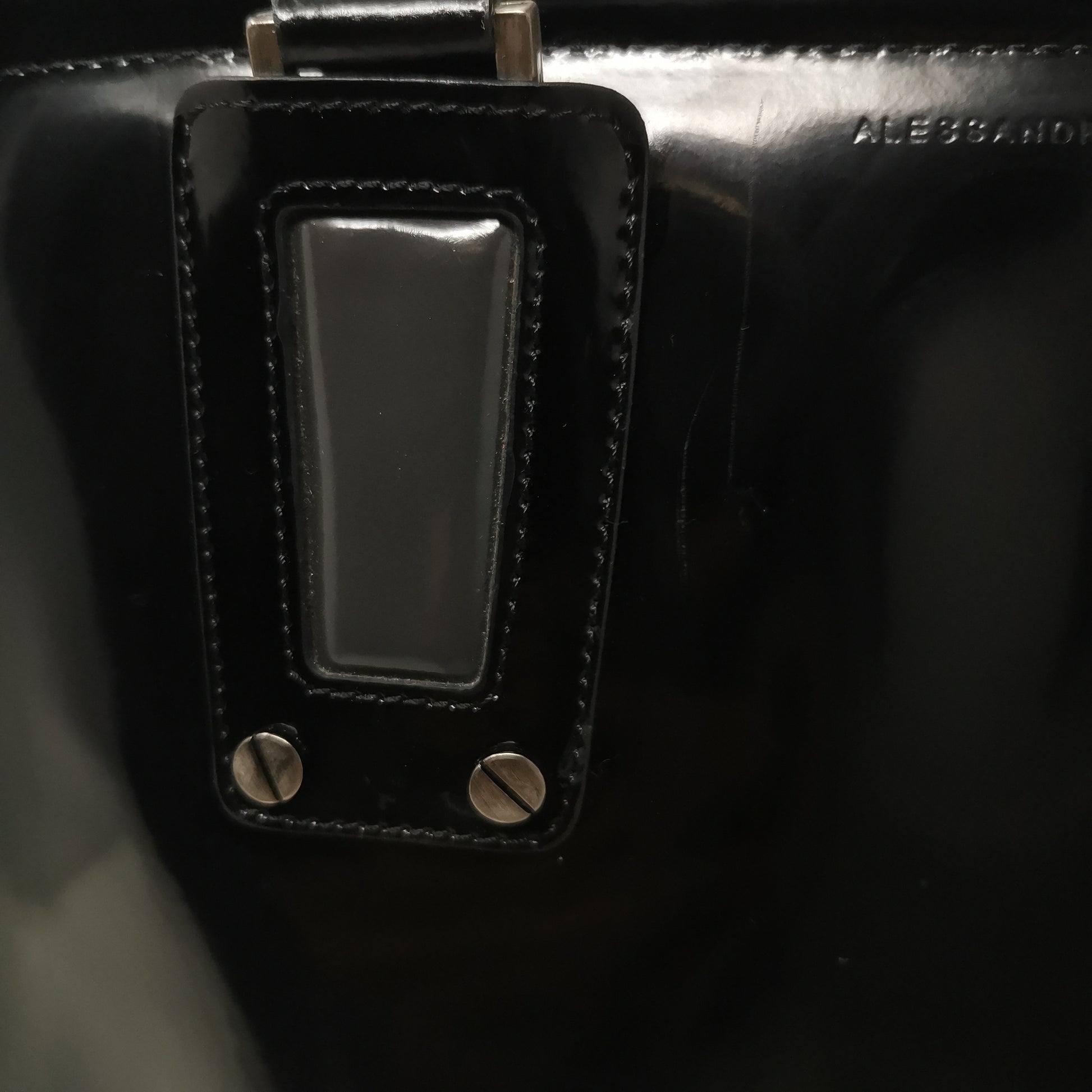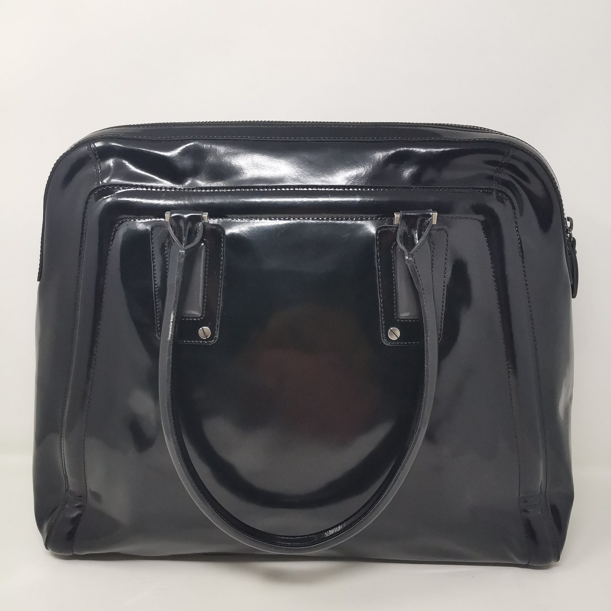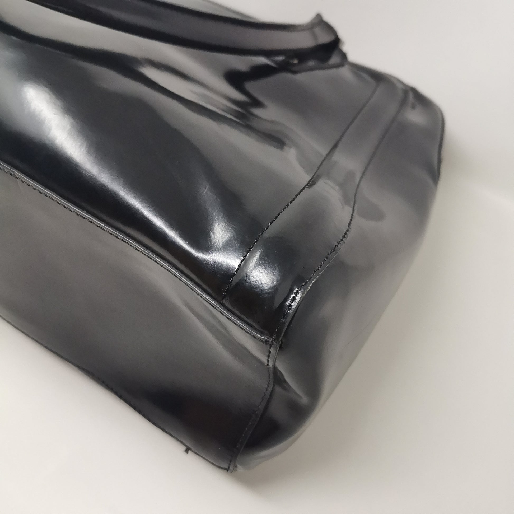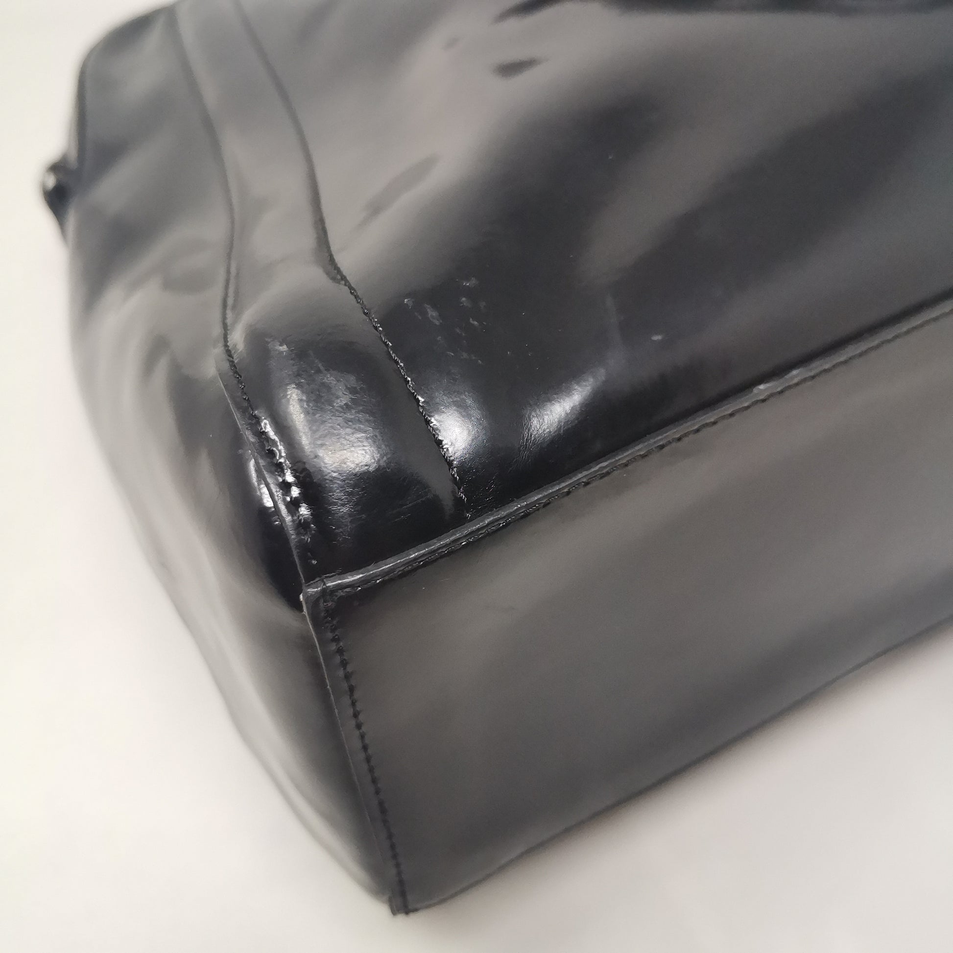Shiny black leather bag with double handles, zip opening and fabric interior with pocket. Silver-coloured metal hardware, a few small marks on corners and leather parts in general.