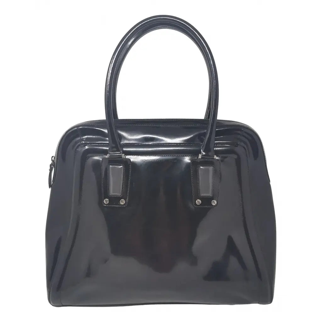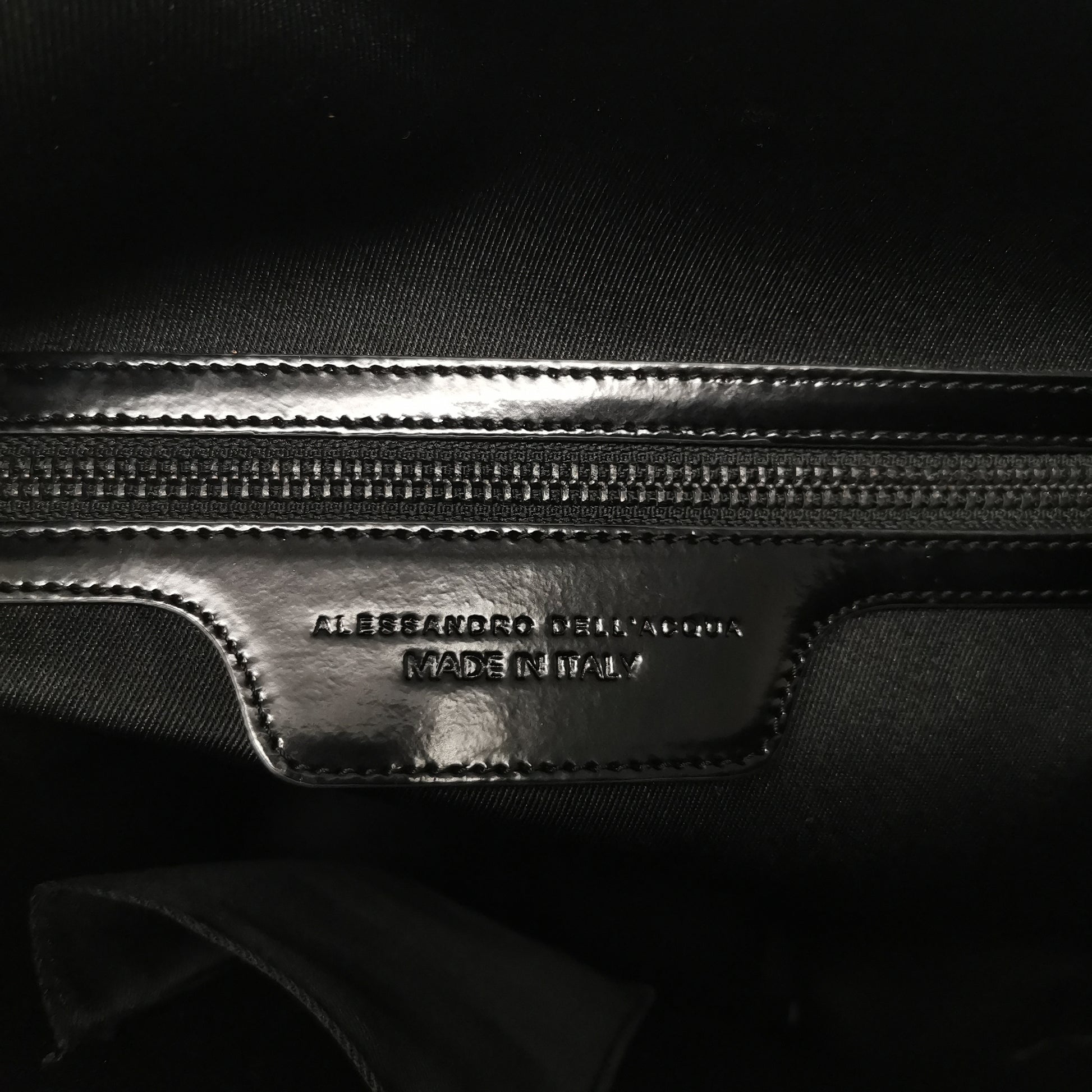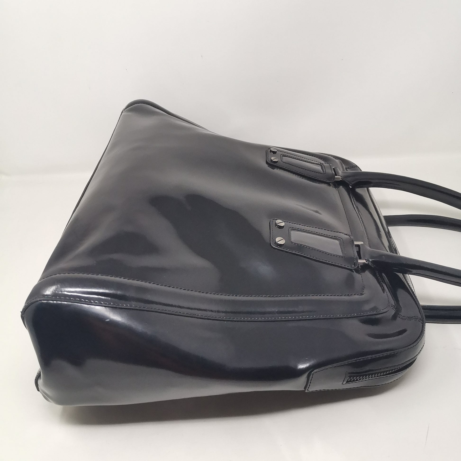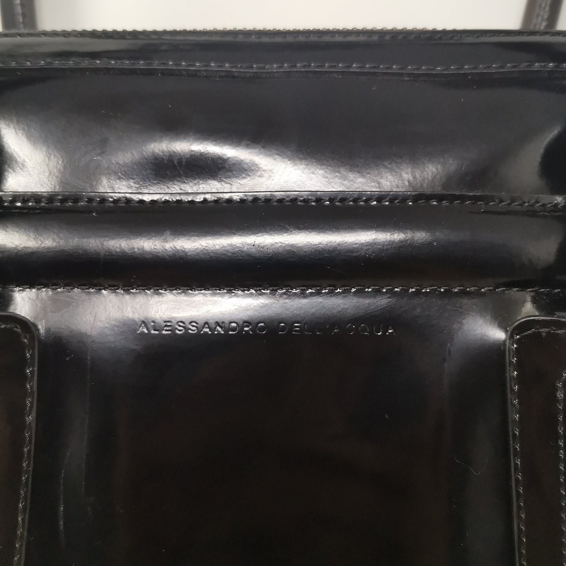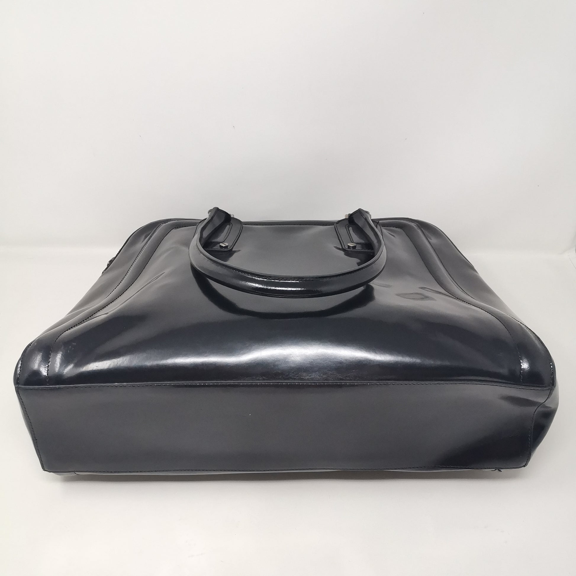 Shiny black leather bag with double handles, zip opening and fabric interior with pocket. Silver-coloured metal hardware, a few small marks on corners and leather parts in general.