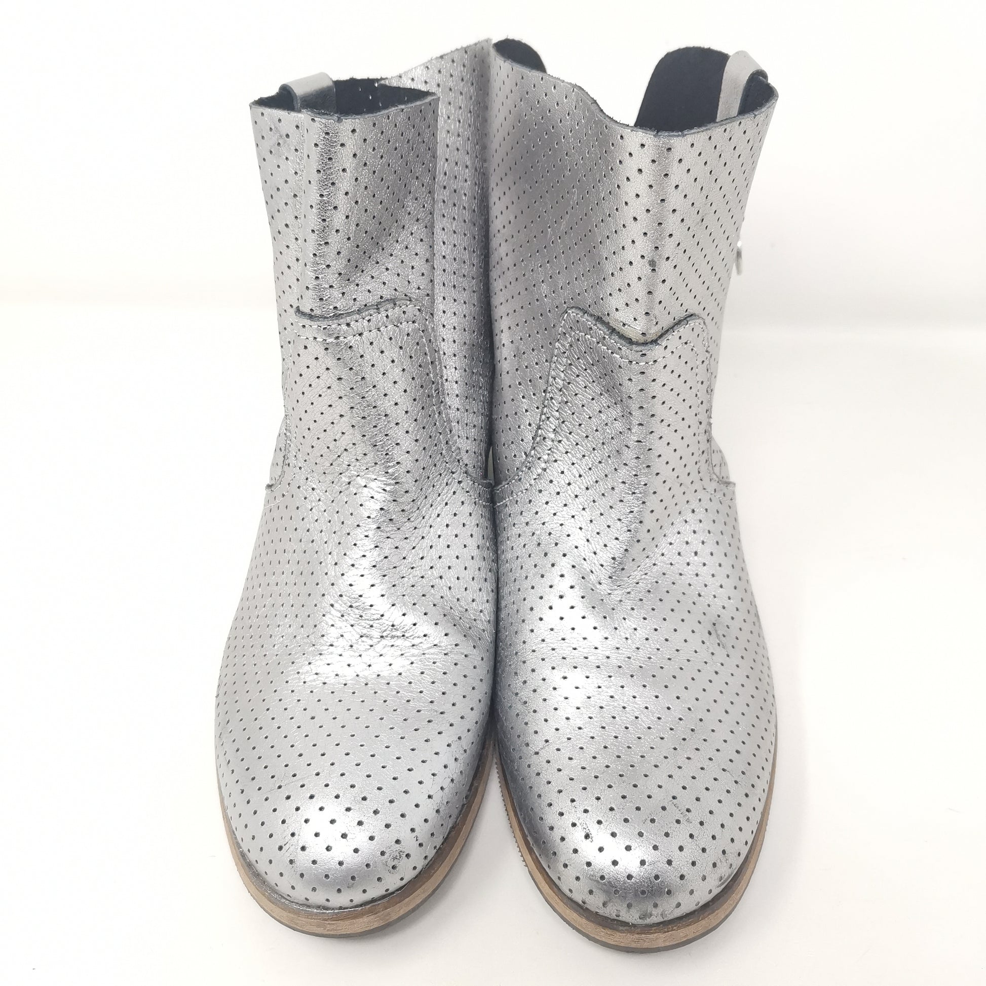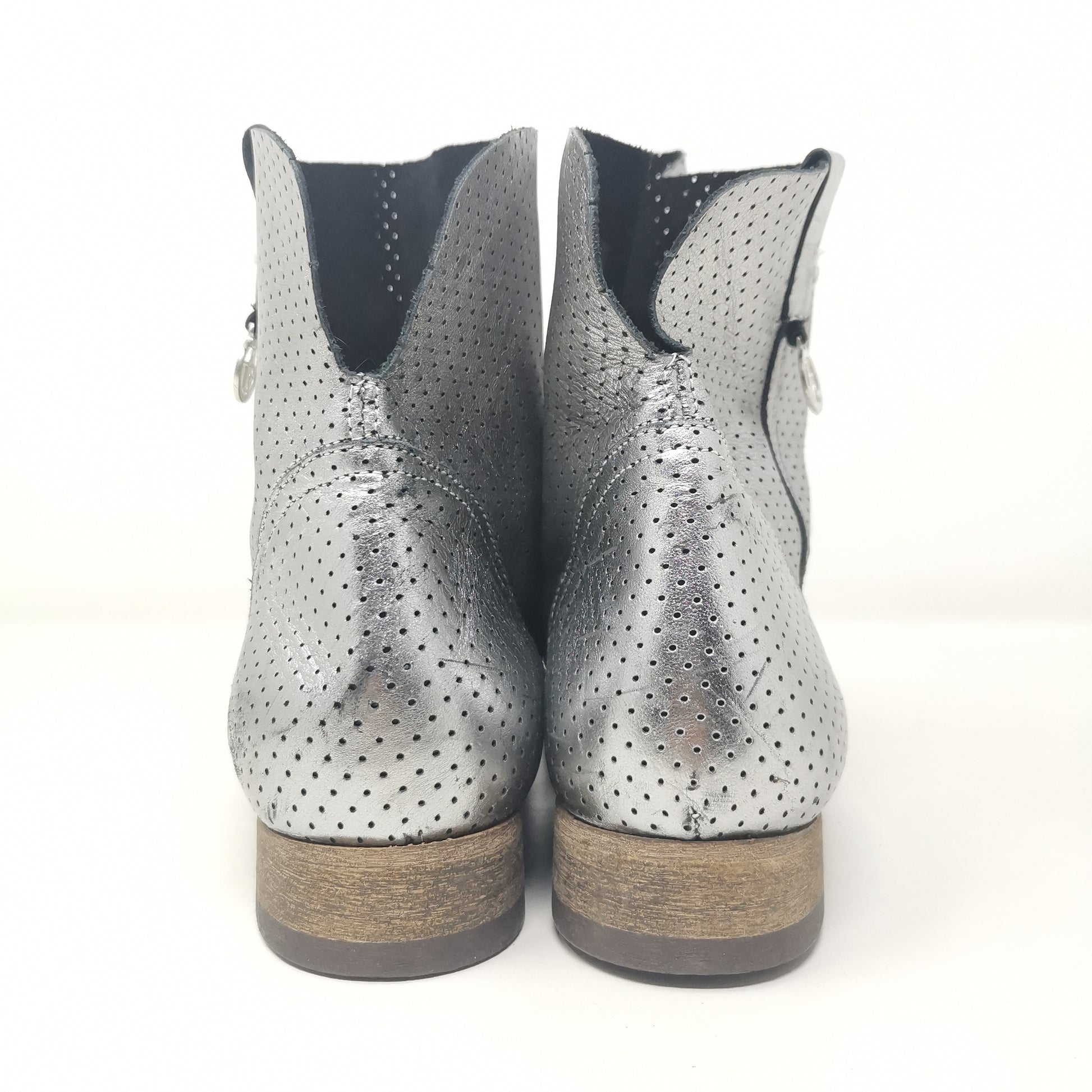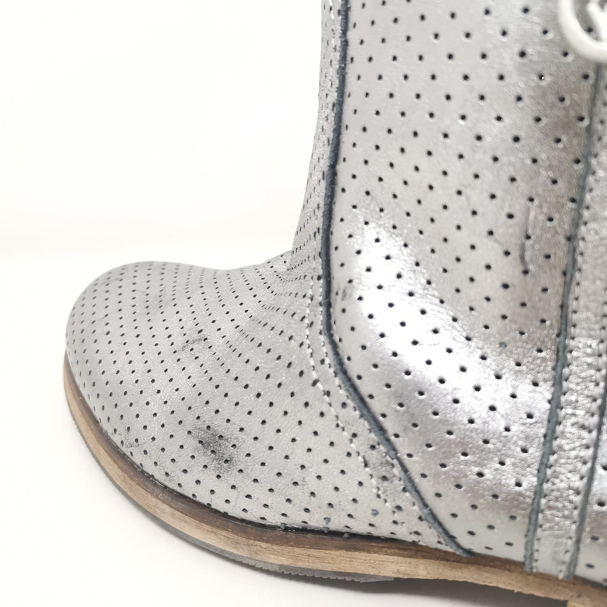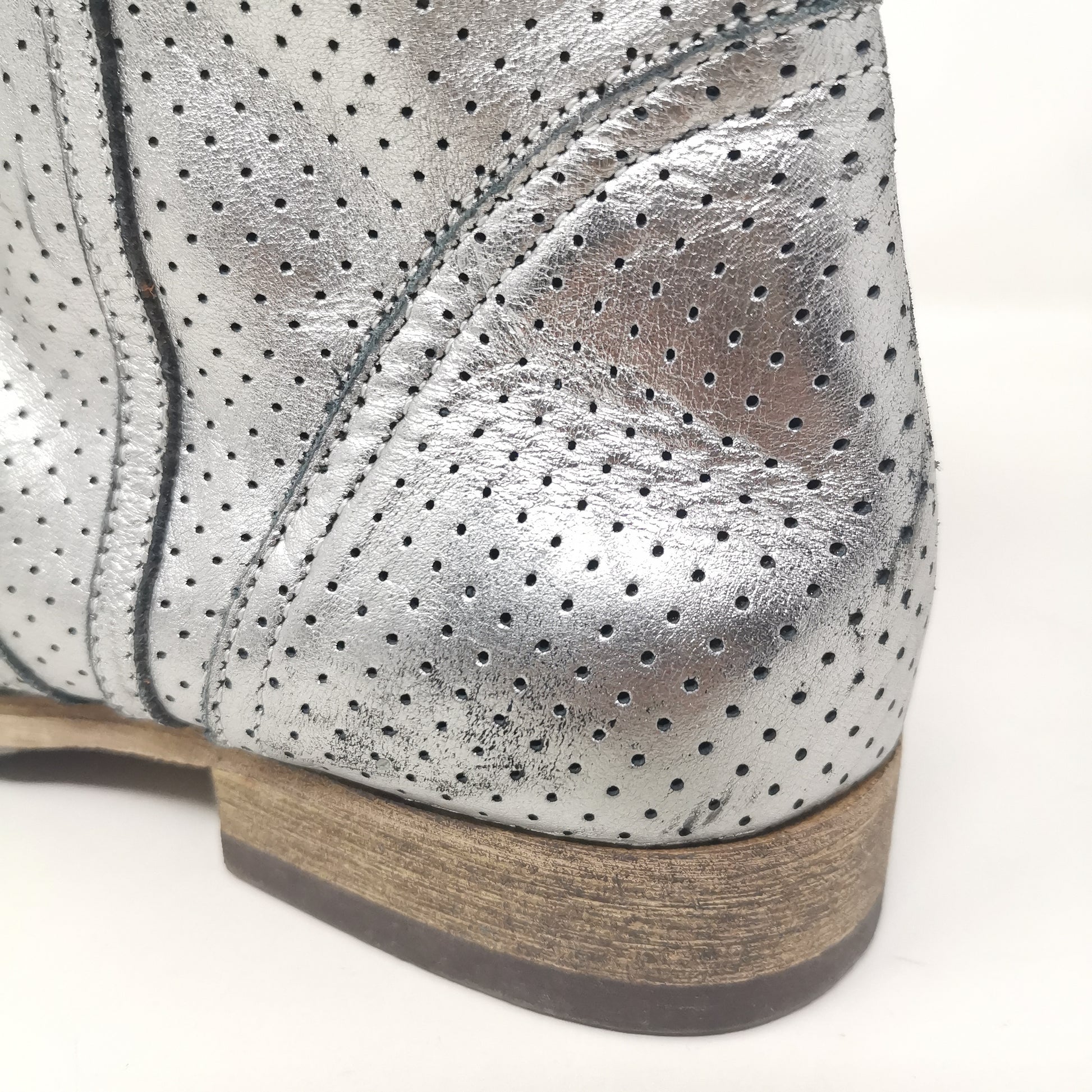 Ankle boots in perforated silver-colored leather, 2.5 cm high heel, internal sole in leather and external rubber sole. There are some small marks on the silver leather part. Metallic decoration on the outside with the brand logo.