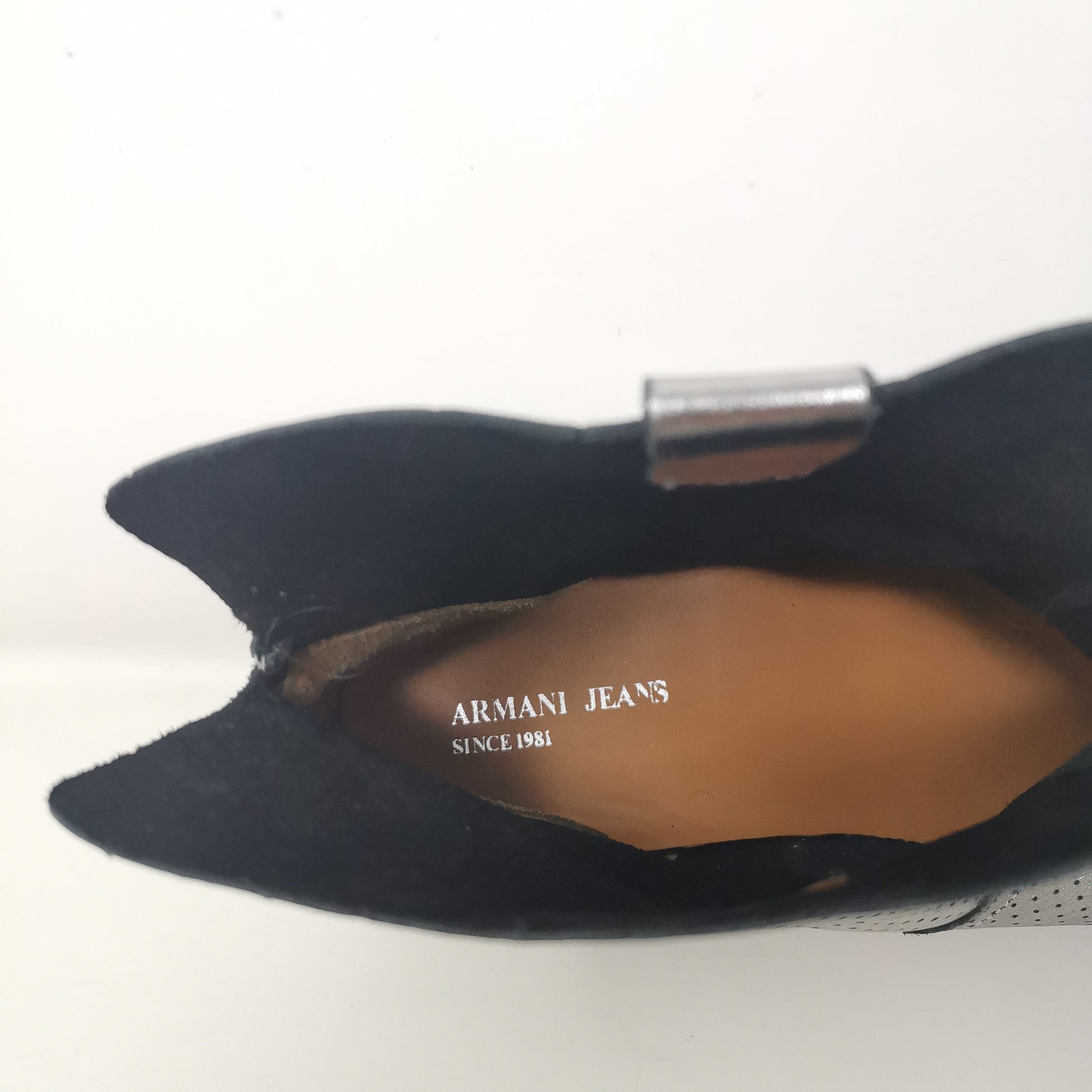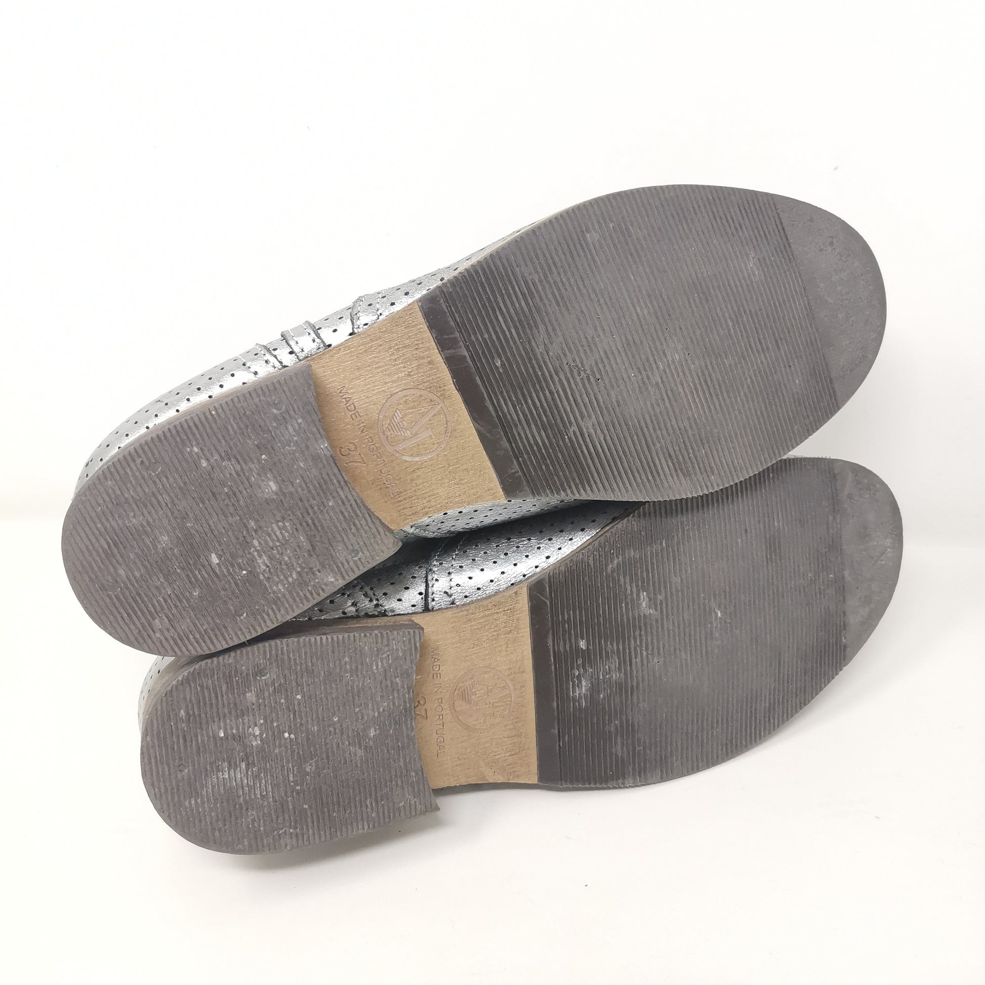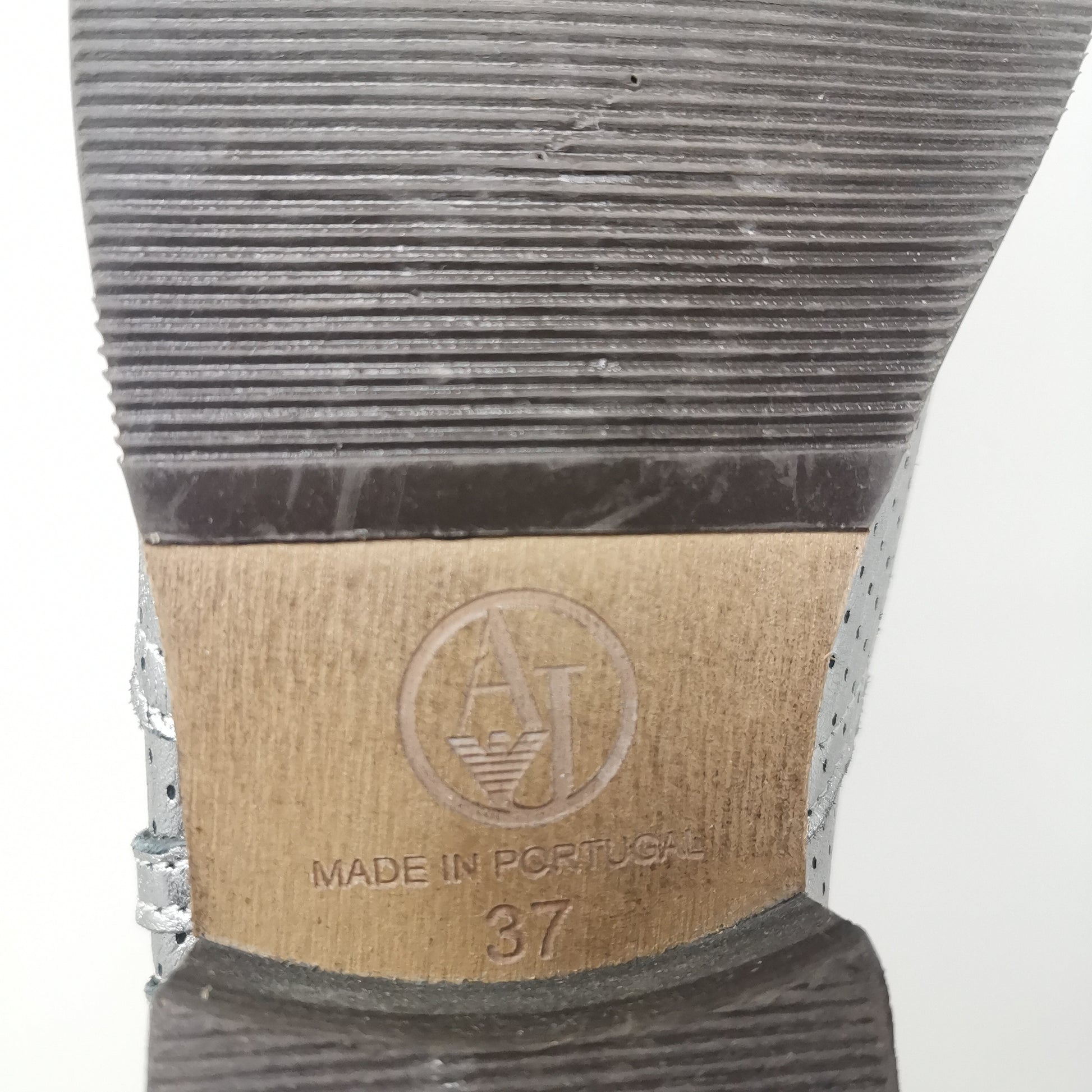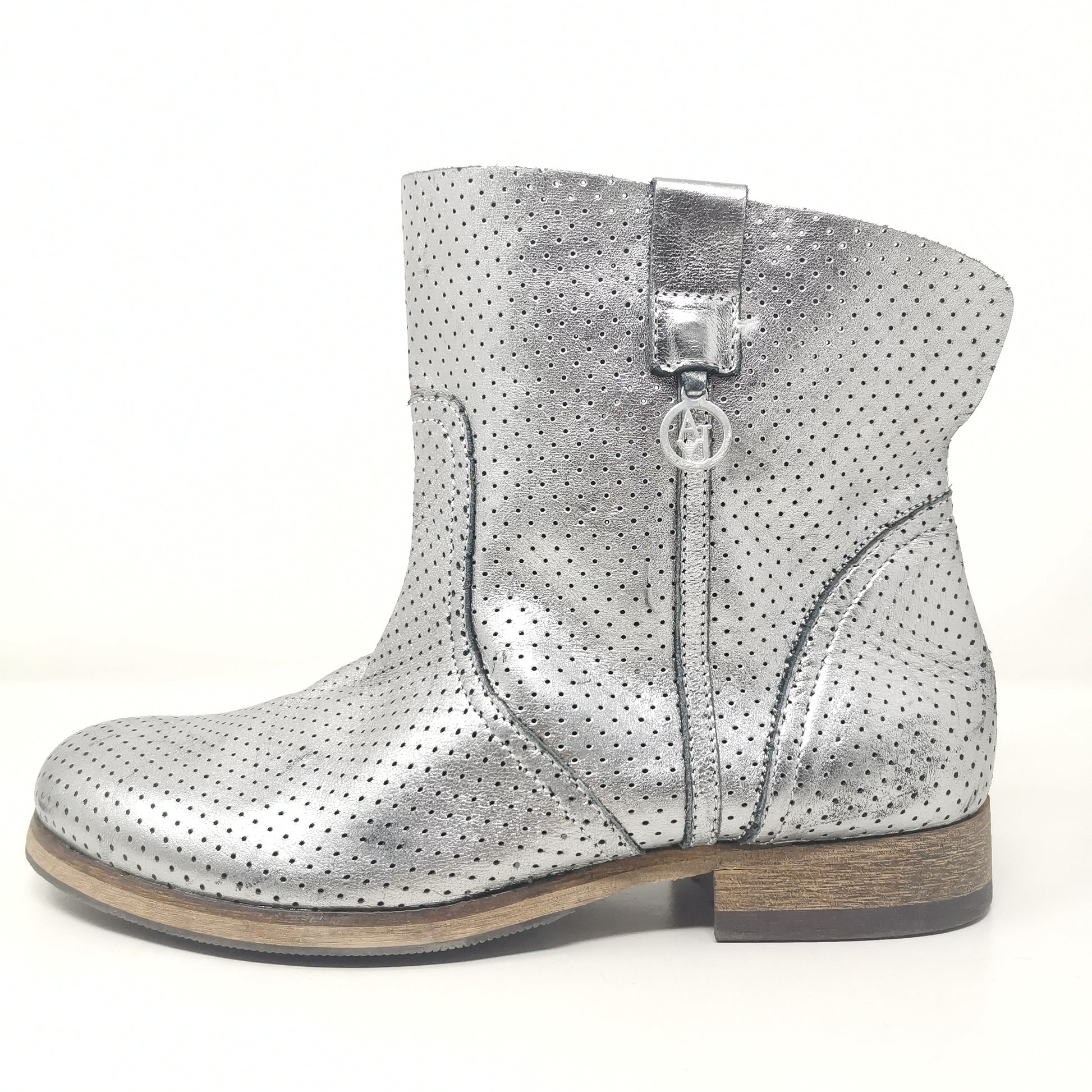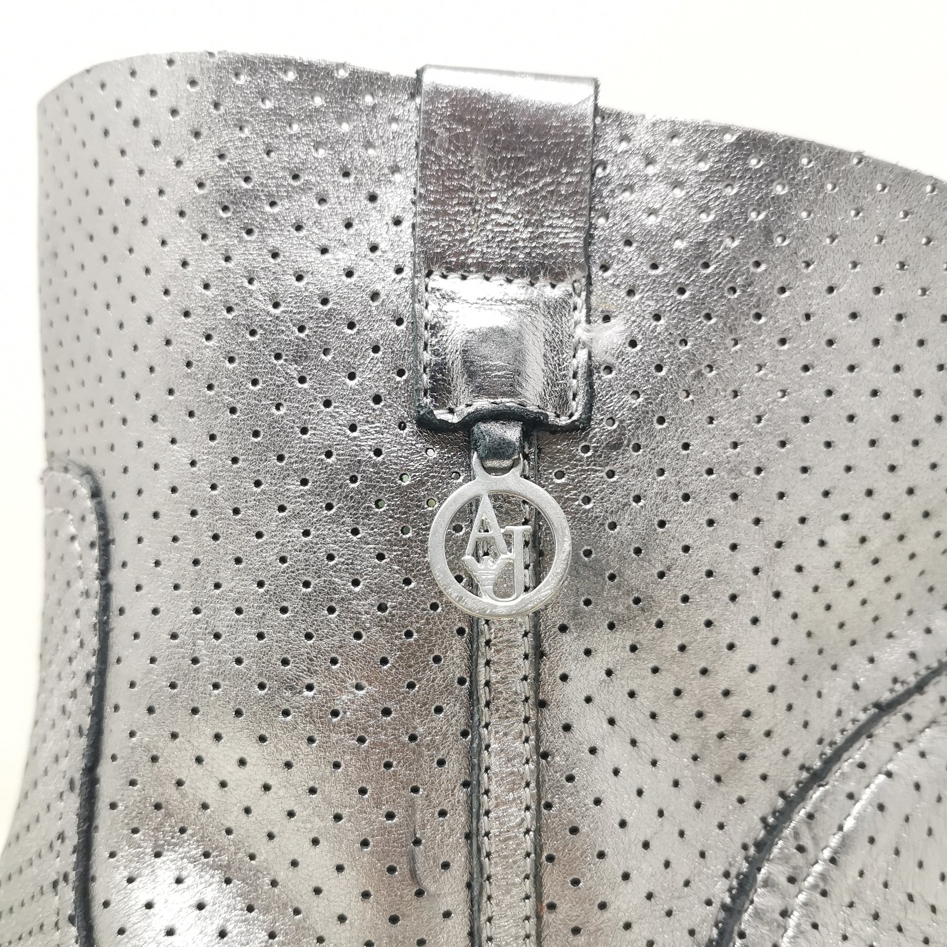 Ankle boots in perforated silver-colored leather, 2.5 cm high heel, internal sole in leather and external rubber sole. There are some small marks on the silver leather part. Metallic decoration on the outside with the brand logo.