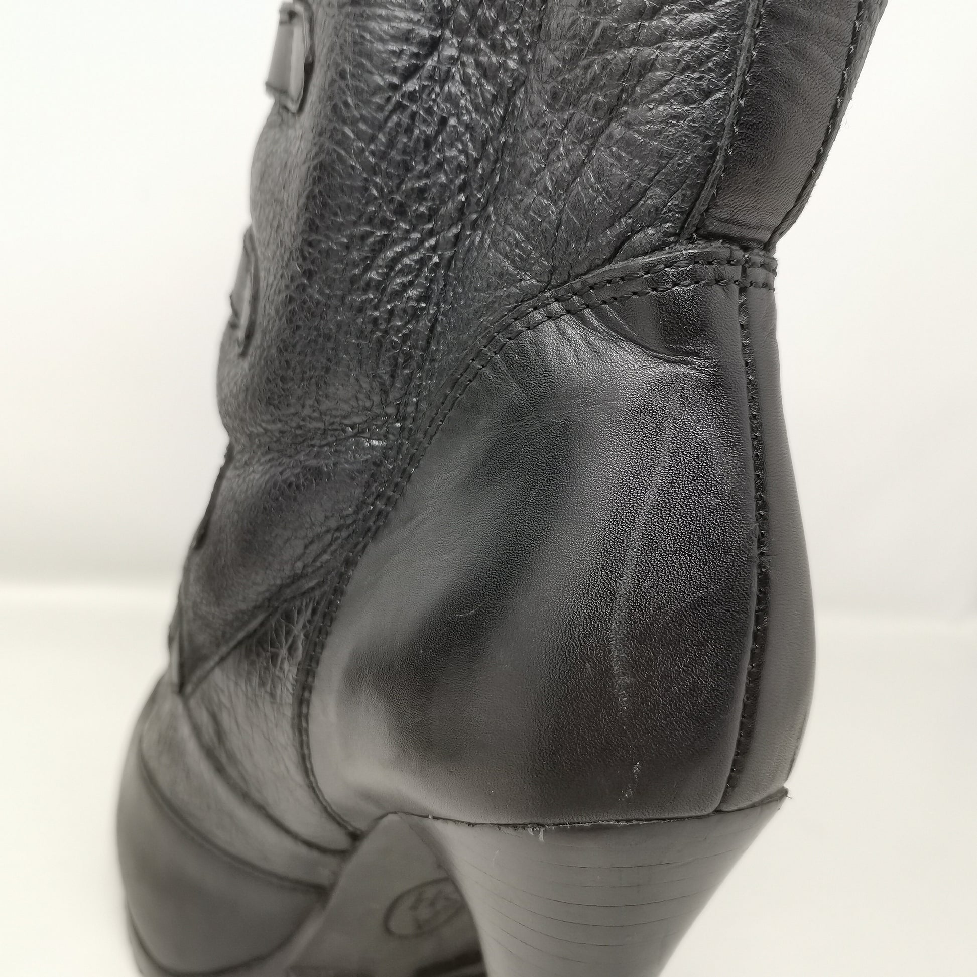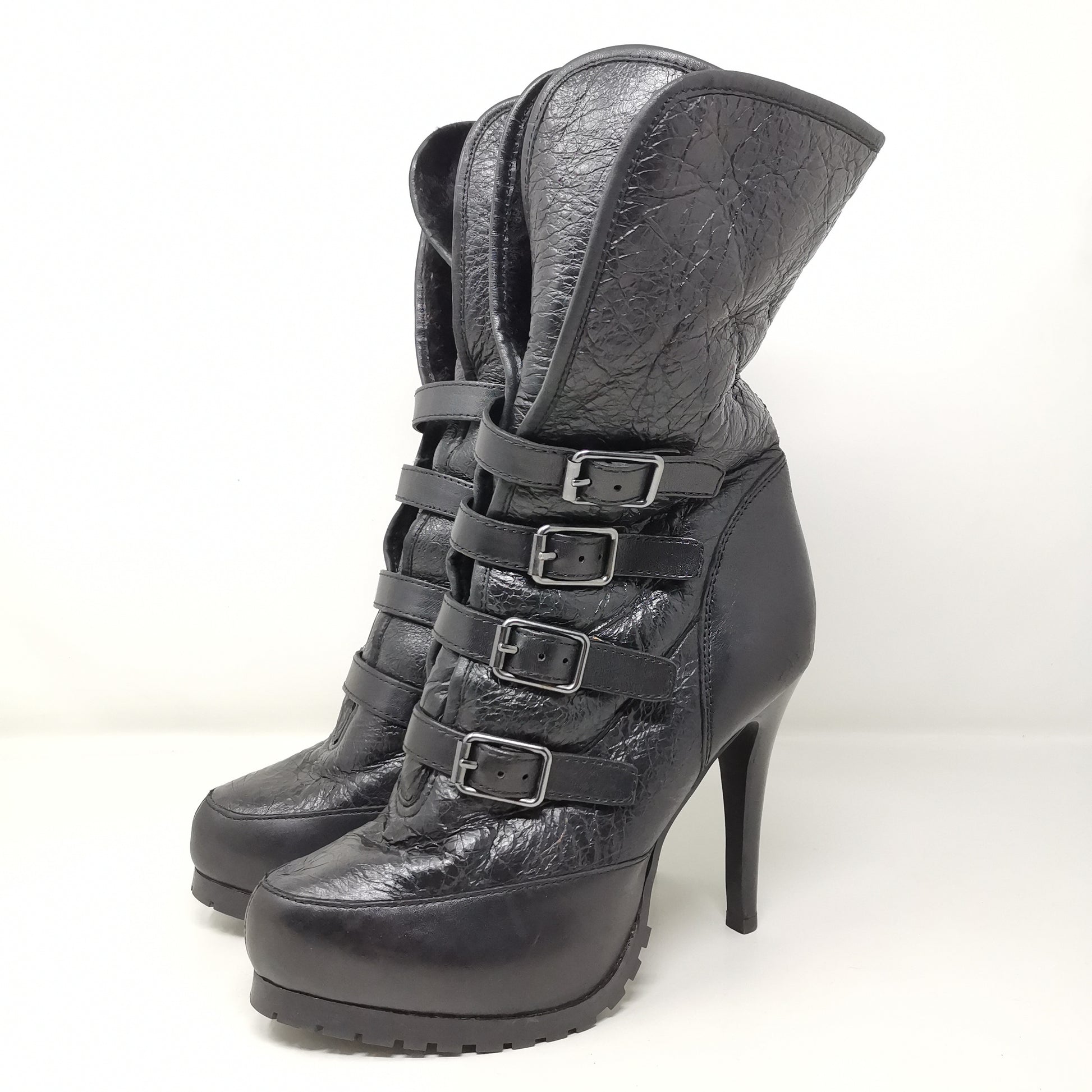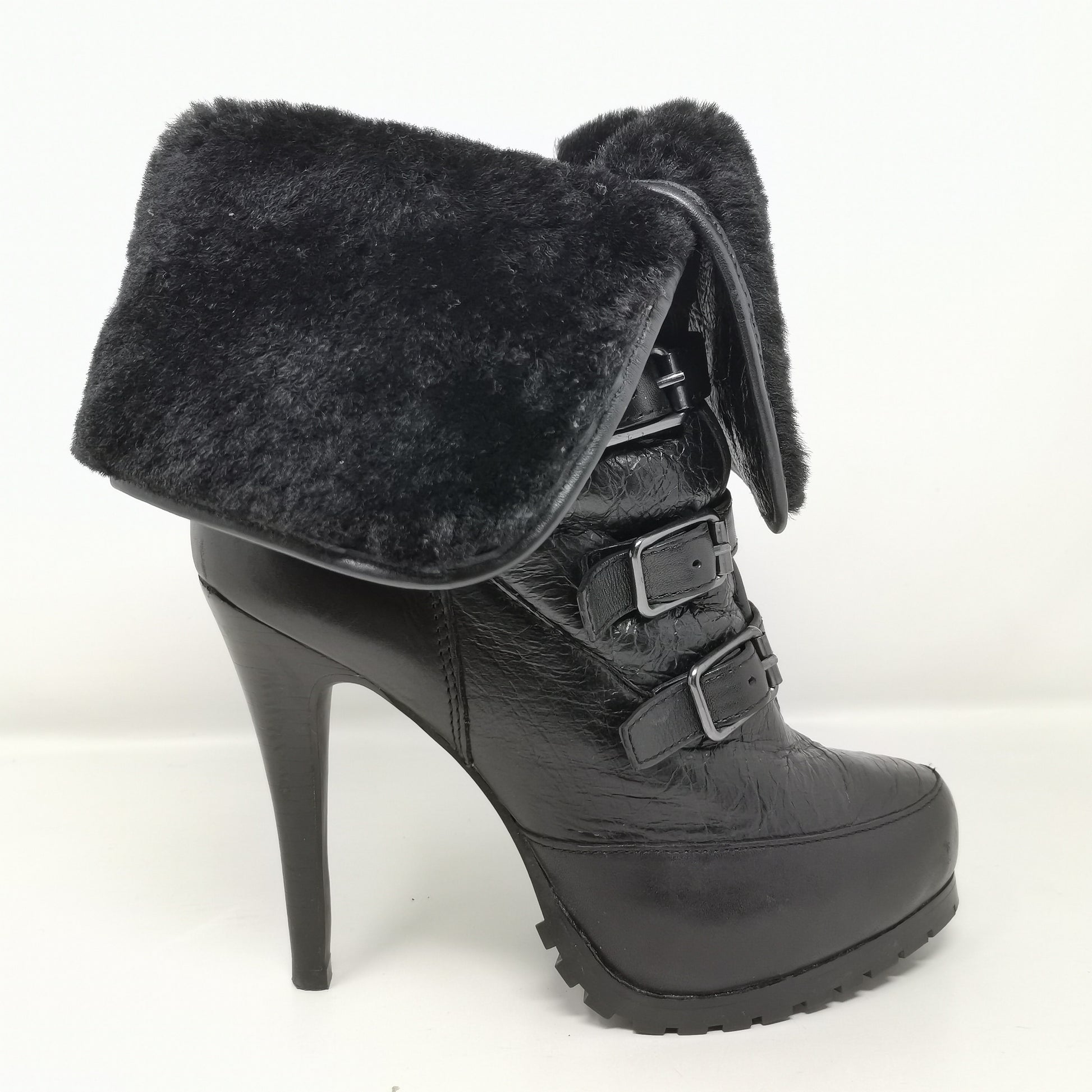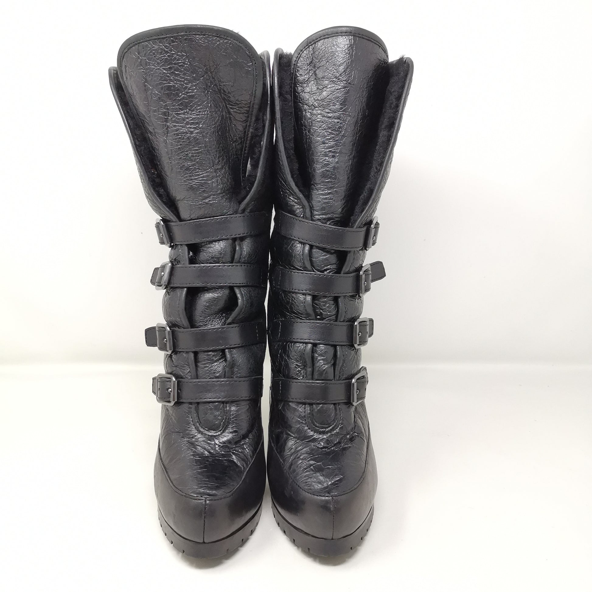 Leather boots with 11.8 cm heel and 2.5 cm platform. Faux fur lining, four buckles on the outer sides, rubber outsole, can also be worn with a turn-up. Some small marks on the barely visible leather part. Shaft height 20 cm, Shaft width 13 cm. Size 38 EU.