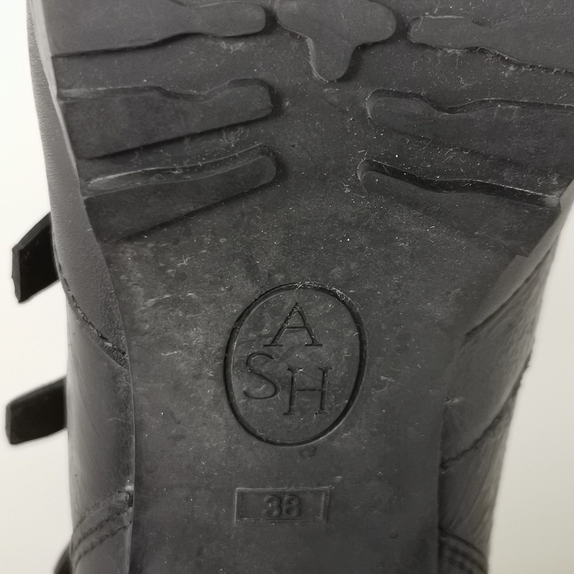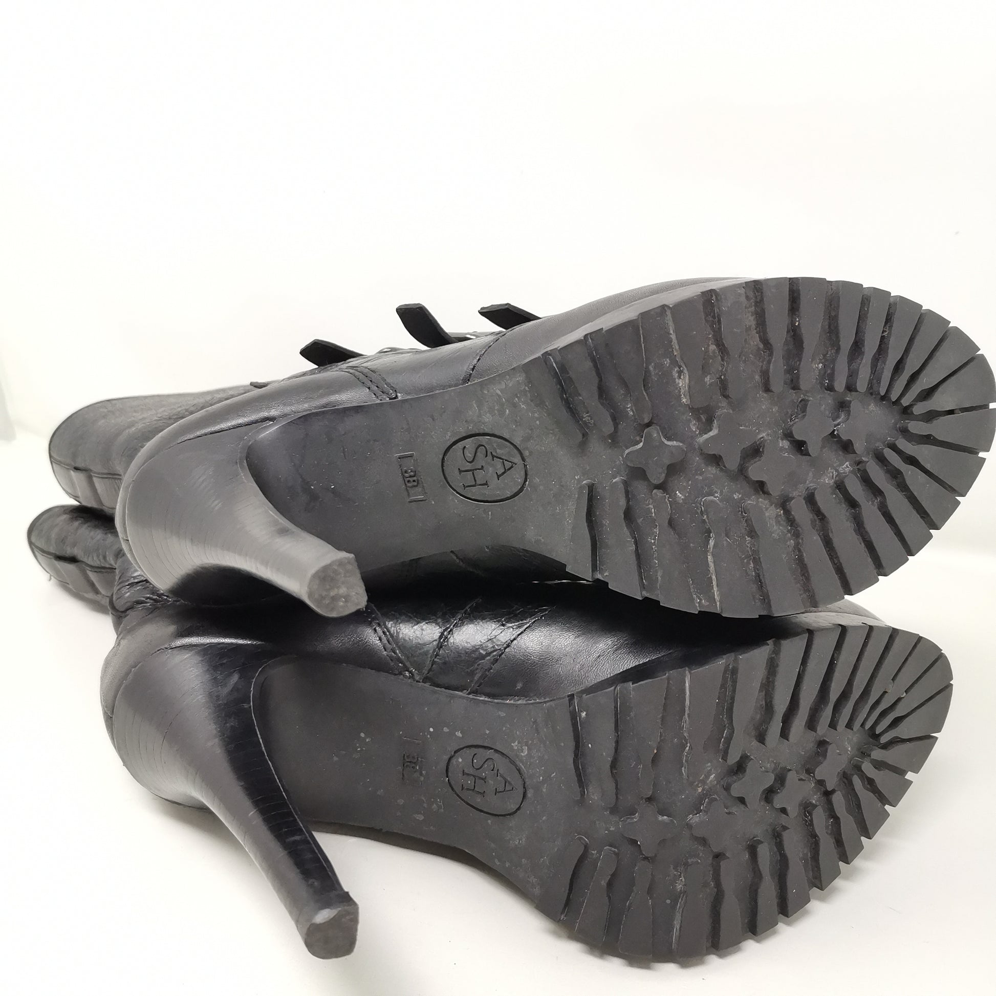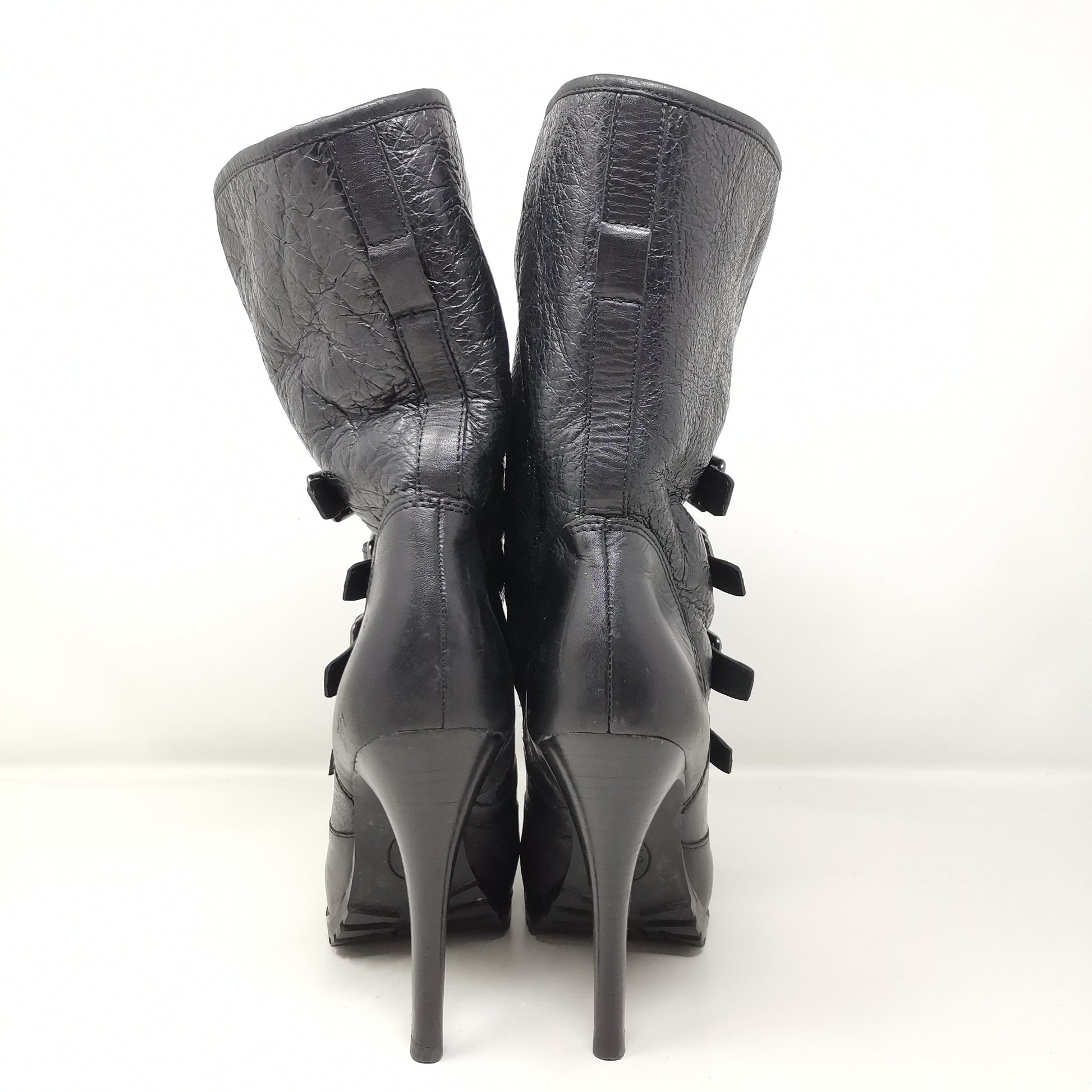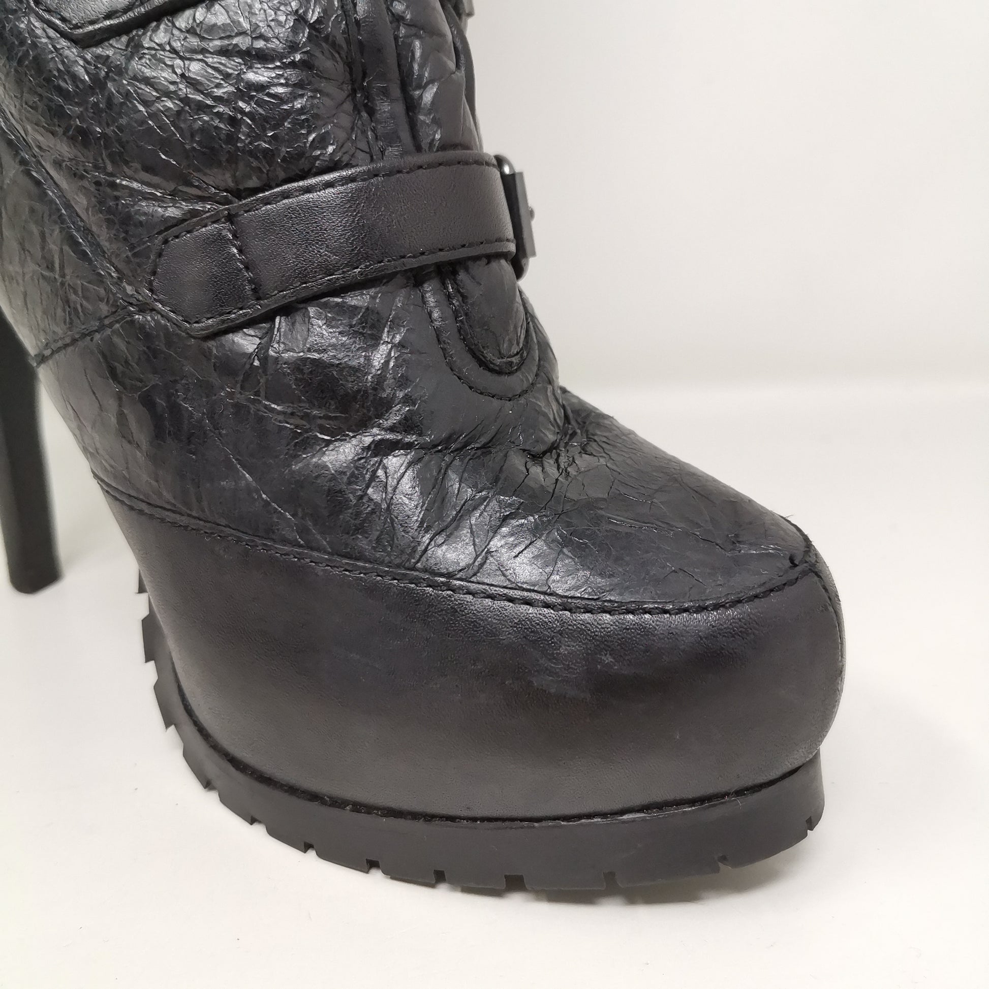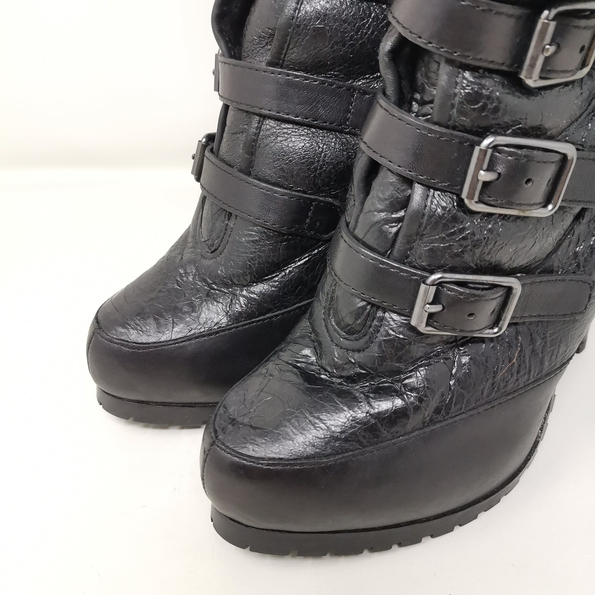 Leather boots with 11.8 cm heel and 2.5 cm platform. Faux fur lining, four buckles on the outer sides, rubber outsole, can also be worn with a turn-up. Some small marks on the barely visible leather part. Shaft height 20 cm, Shaft width 13 cm. Size 38 EU.