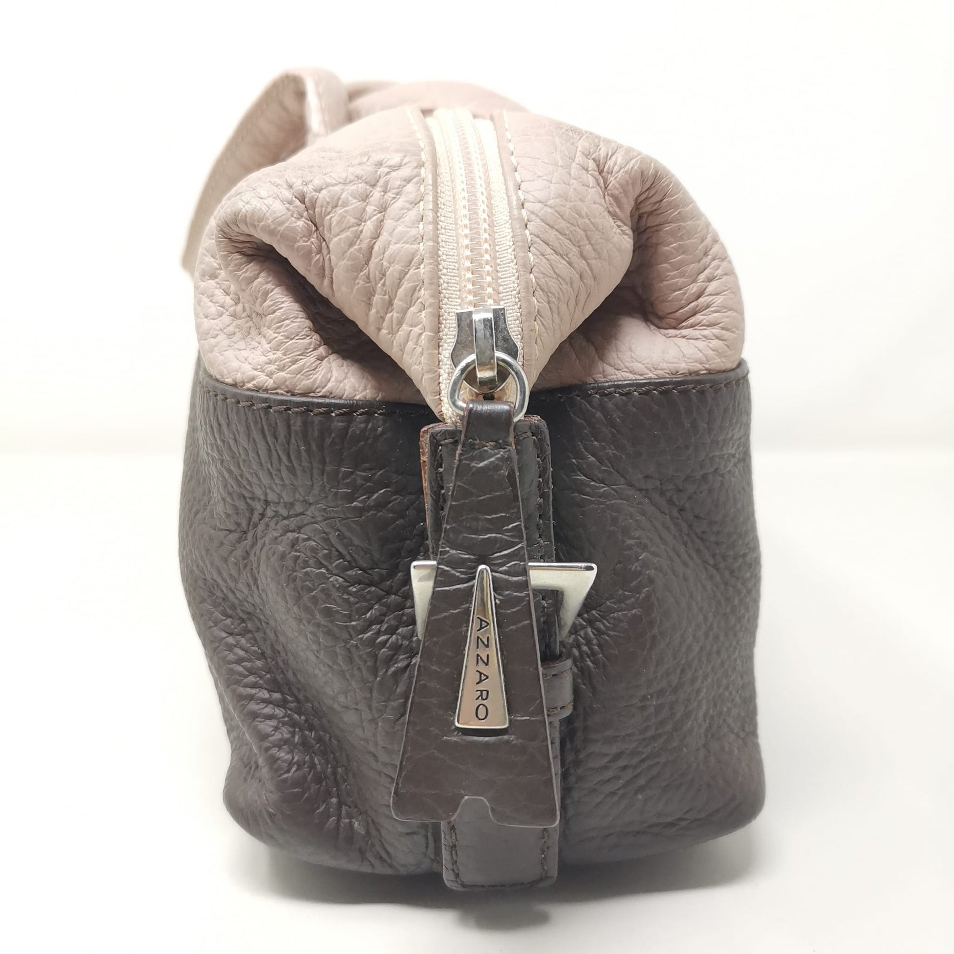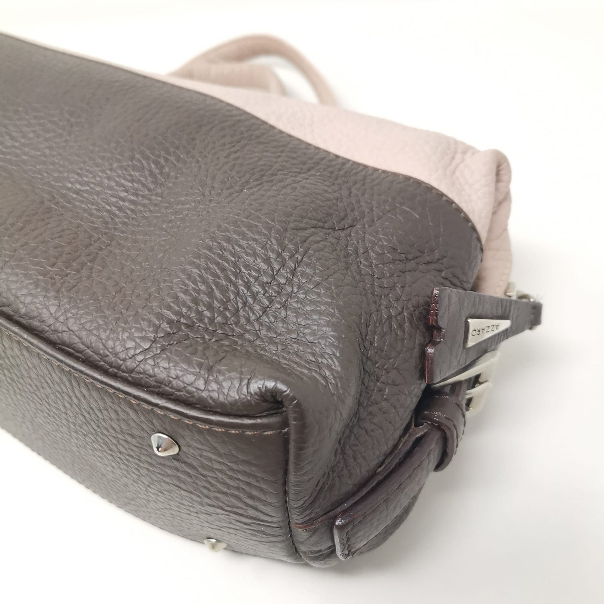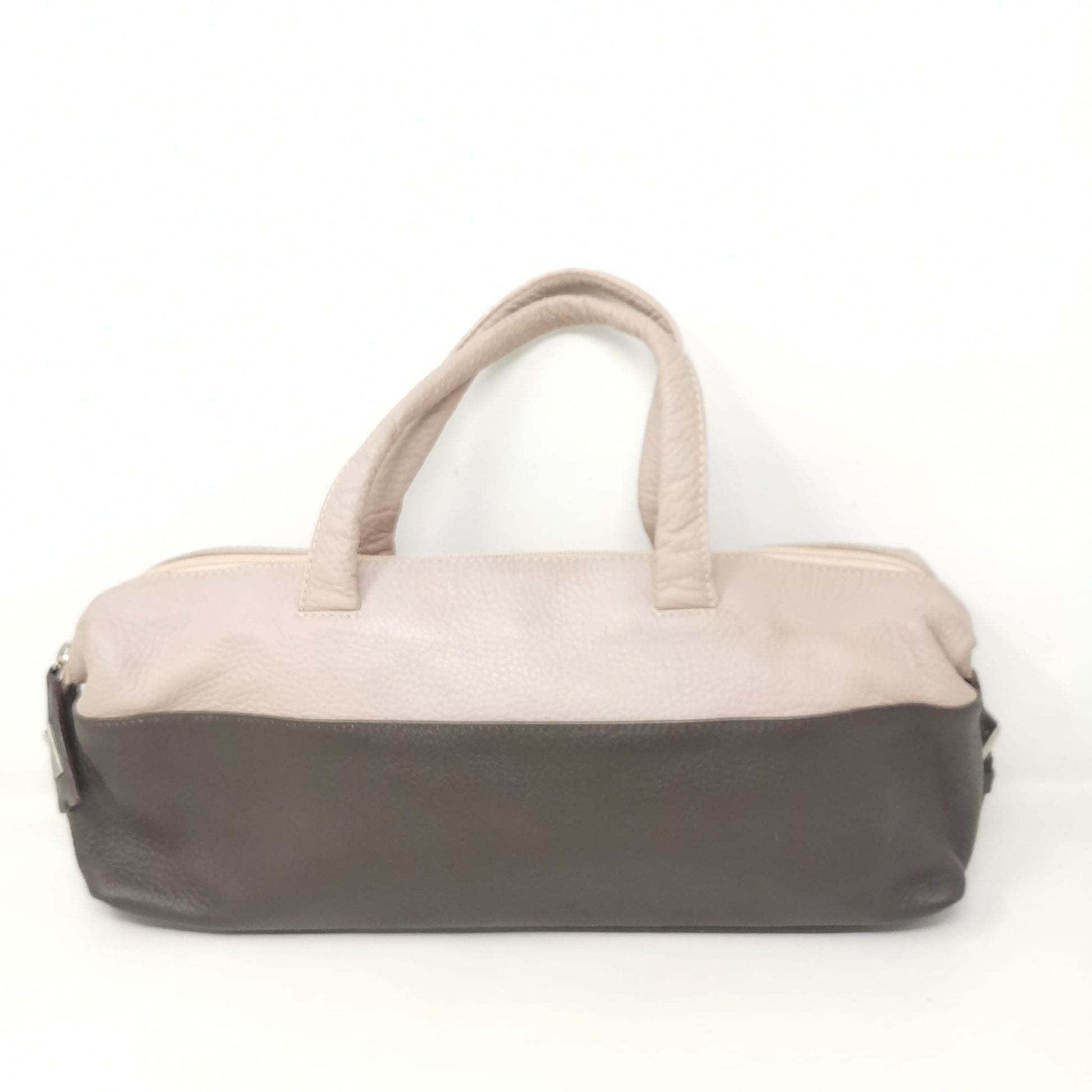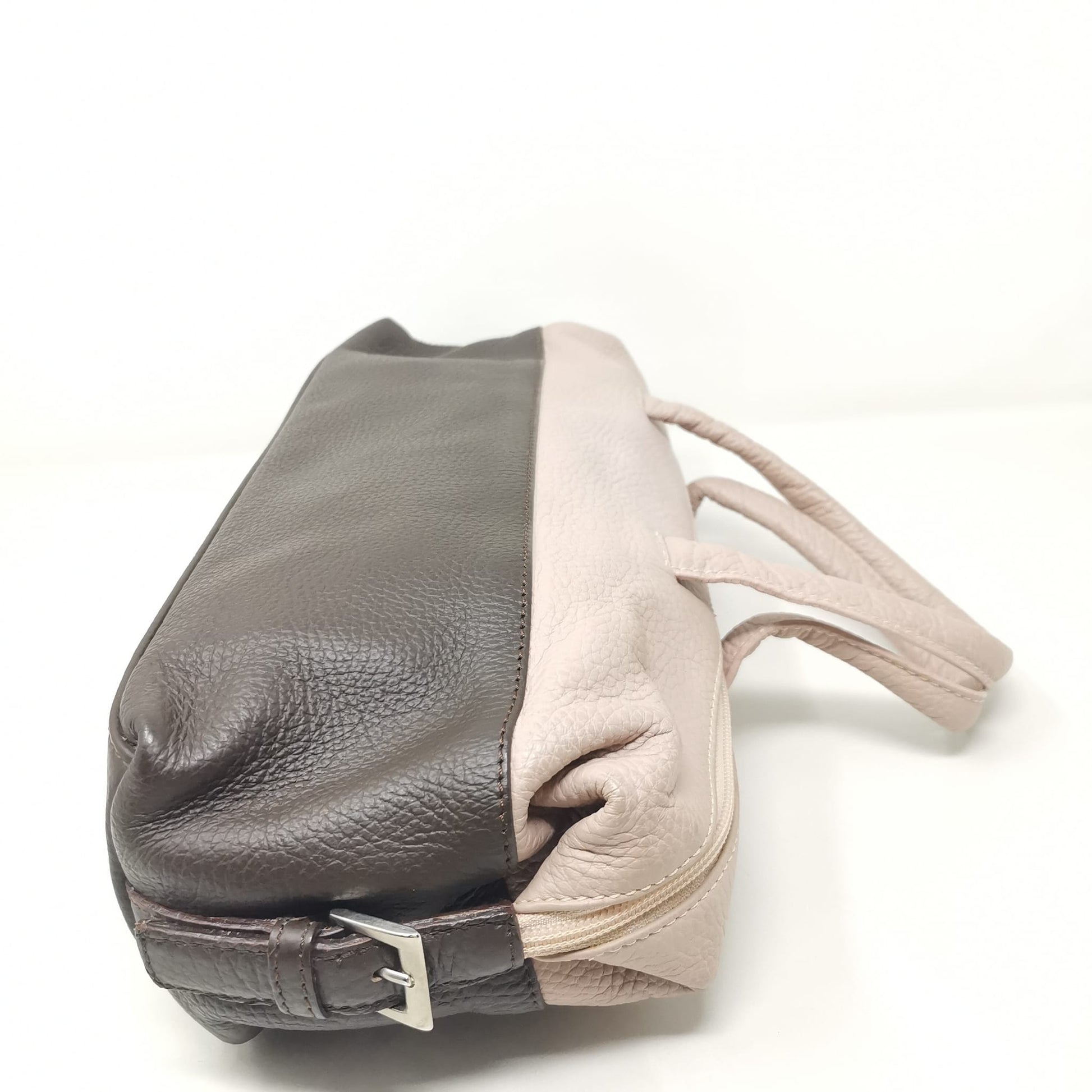 Brown and beige leather bag with double handles, zip opening and fabric interior with pocket. Protective metal feet on the bottom, decorative buckles on the sides. A few small marks. Width 37cm, height 13cm, depth 10cm, handle height 14cm.