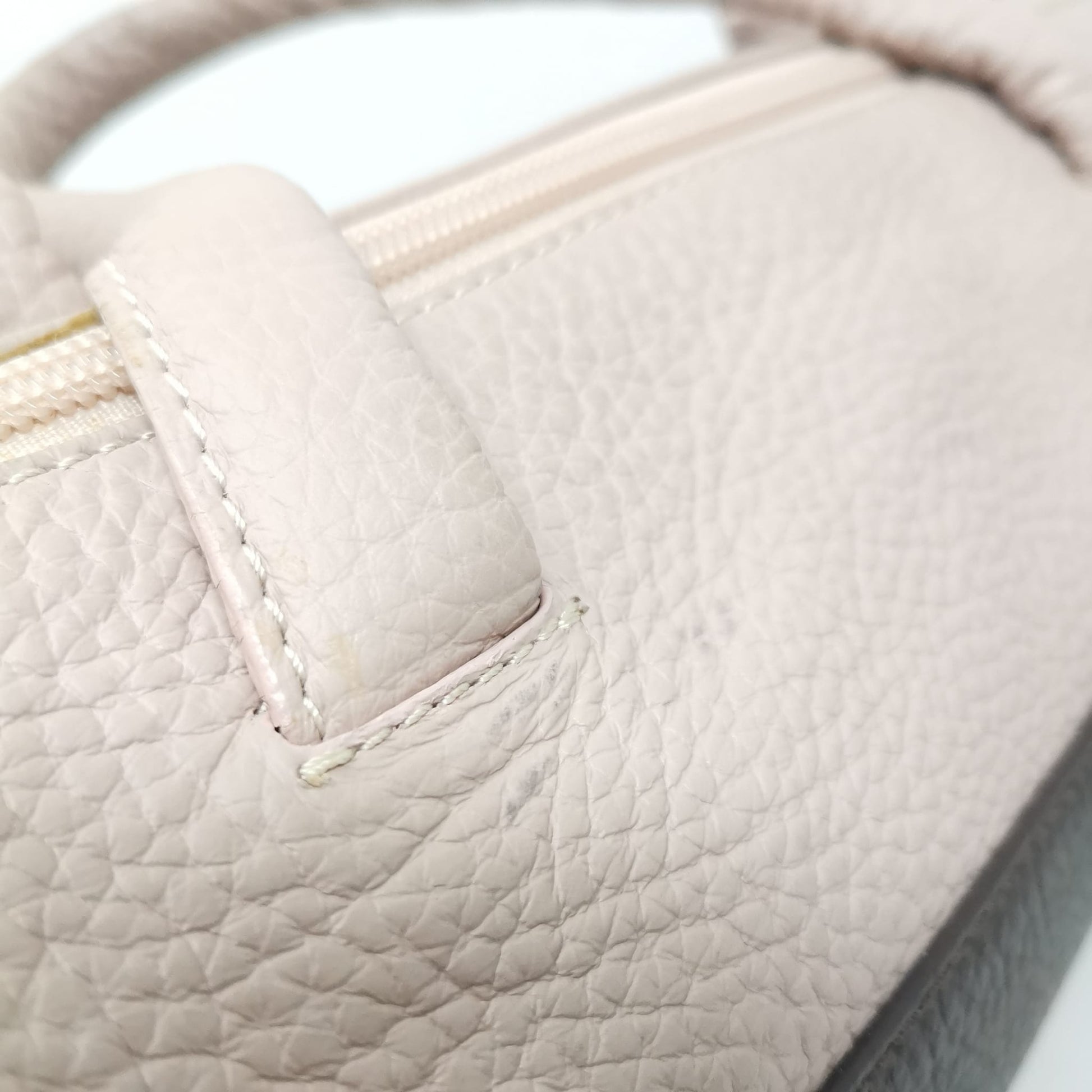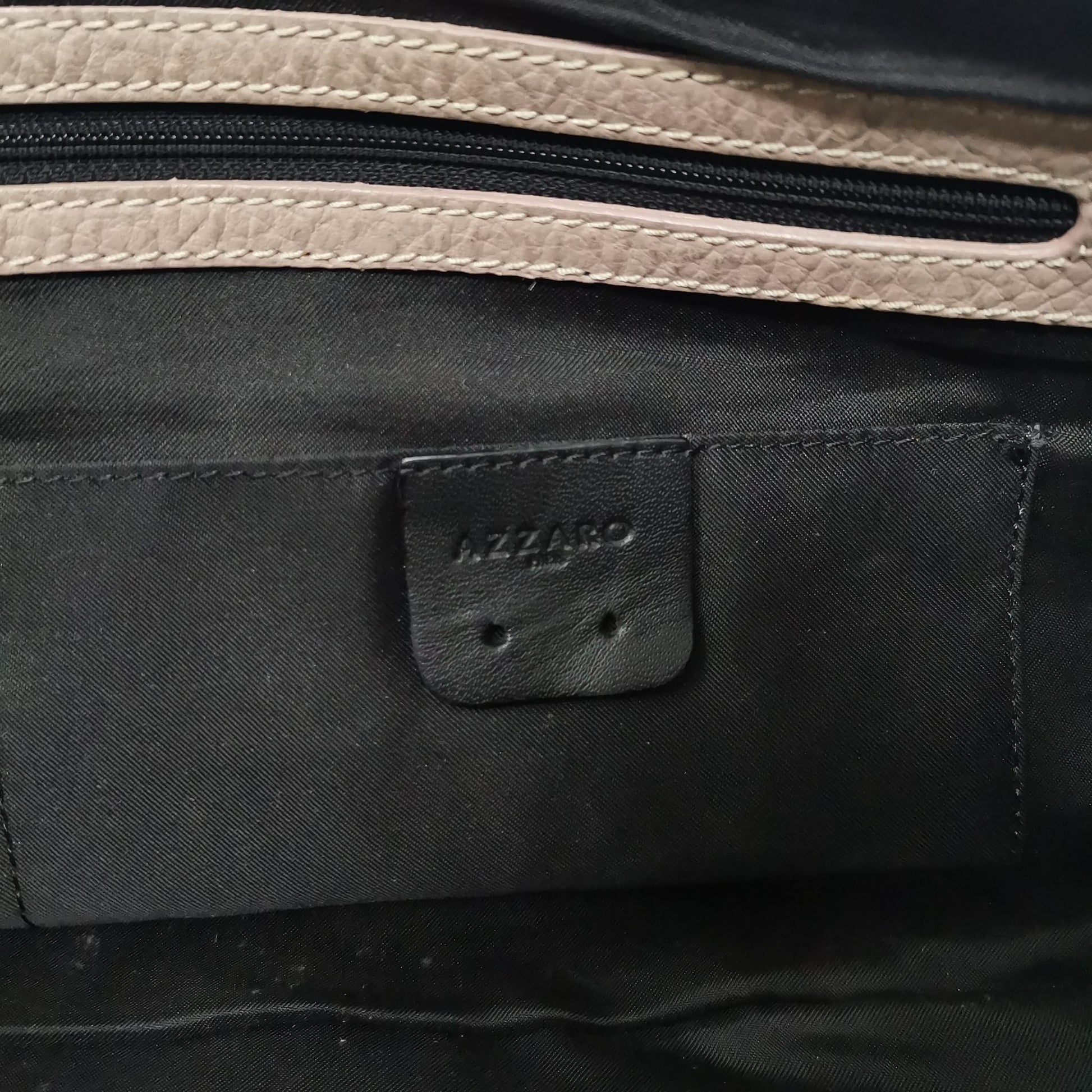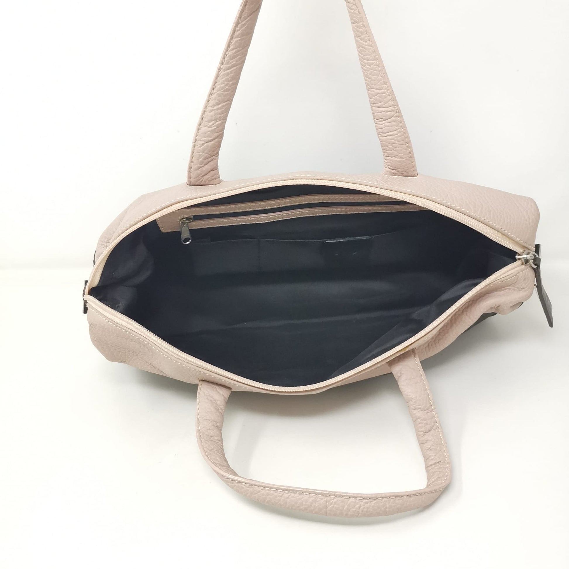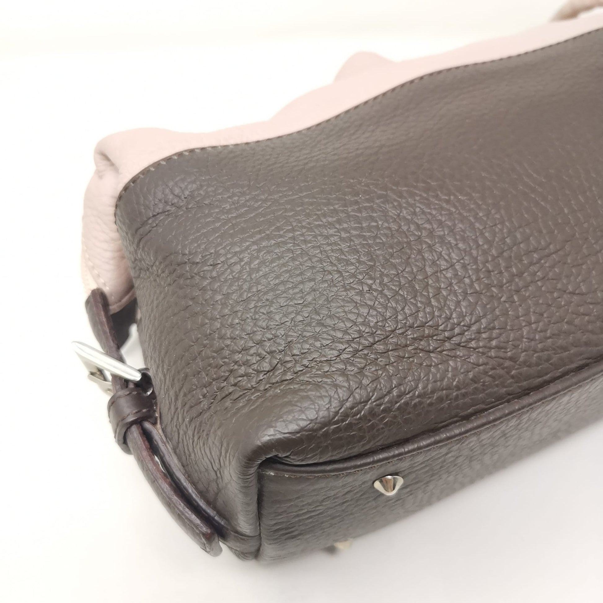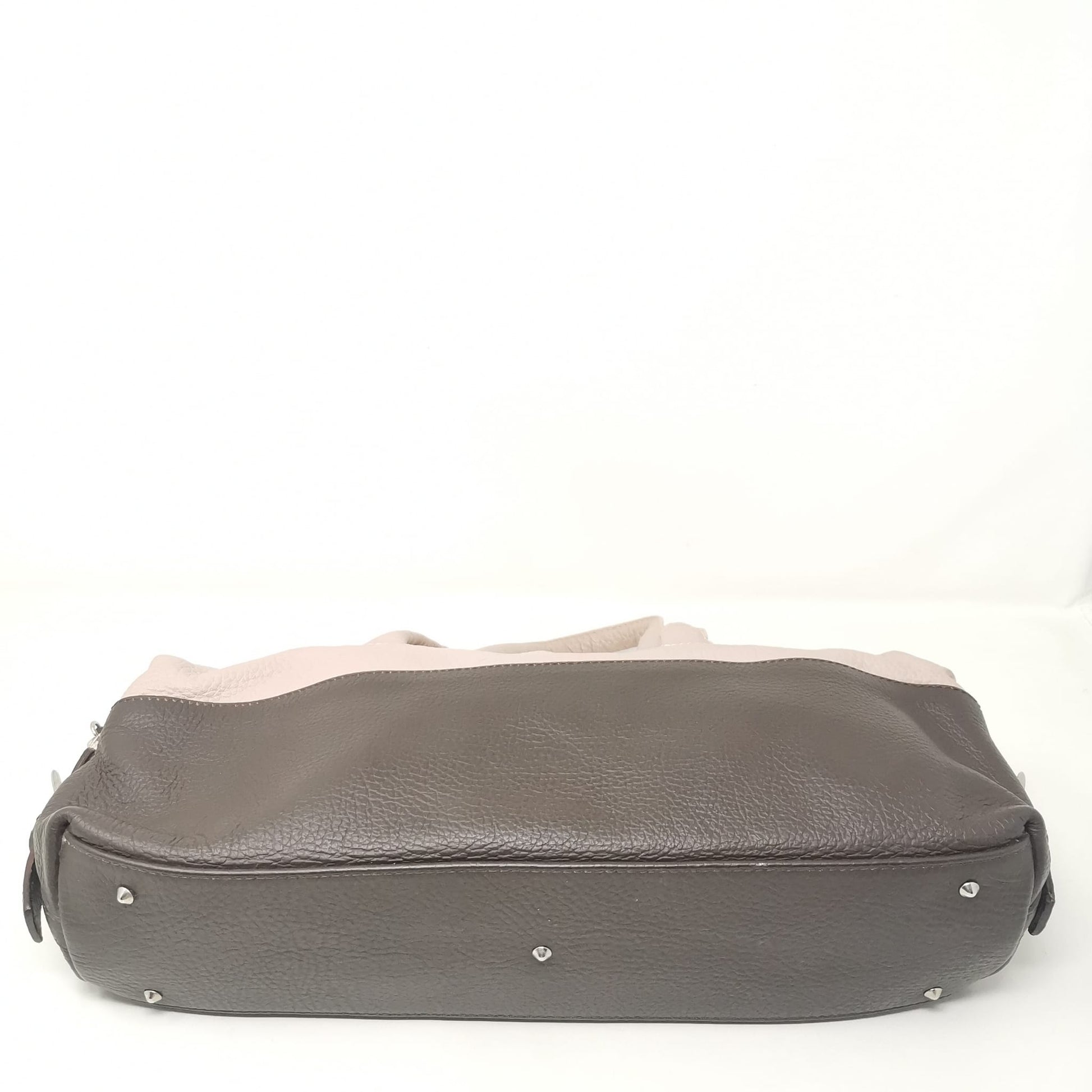 Brown and beige leather bag with double handles, zip opening and fabric interior with pocket. Protective metal feet on the bottom, decorative buckles on the sides. A few small marks. Width 37cm, height 13cm, depth 10cm, handle height 14cm.