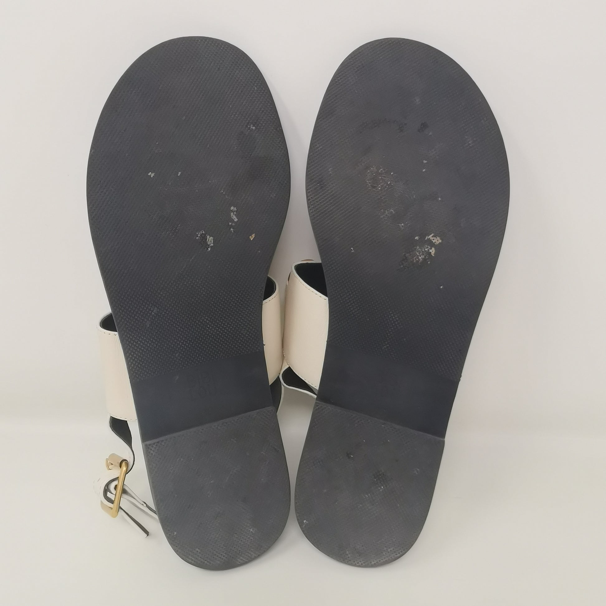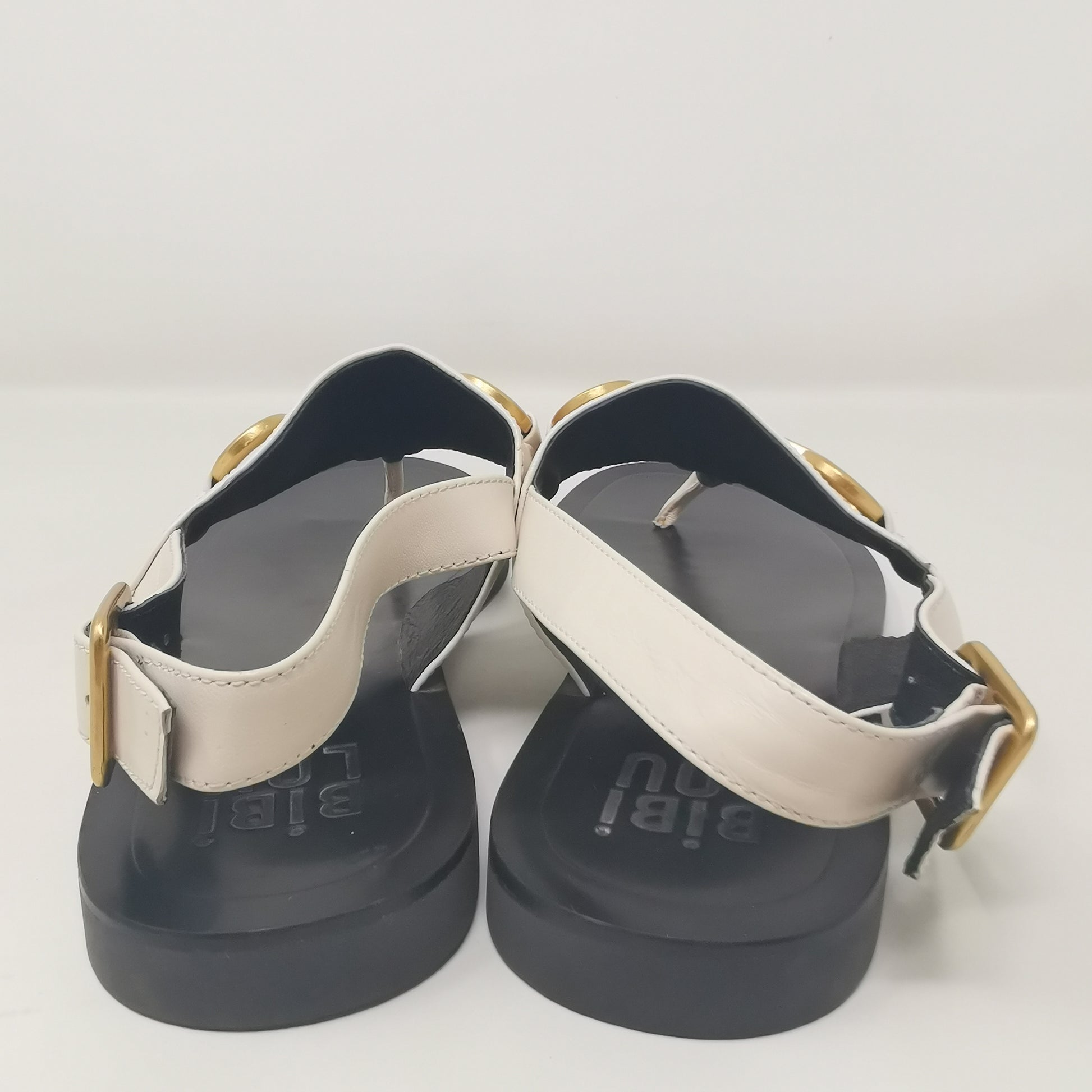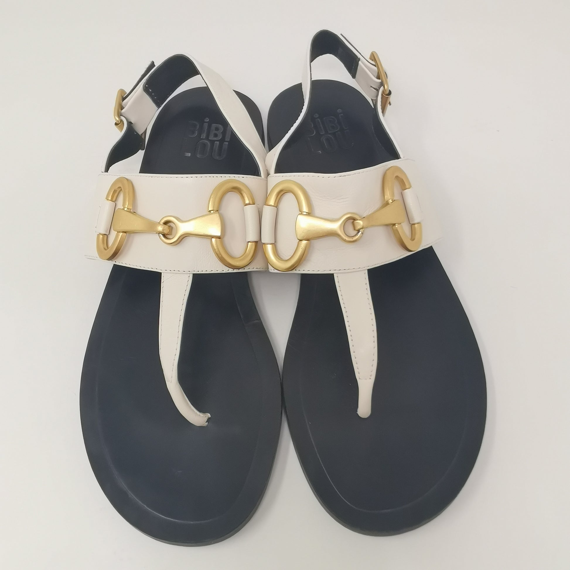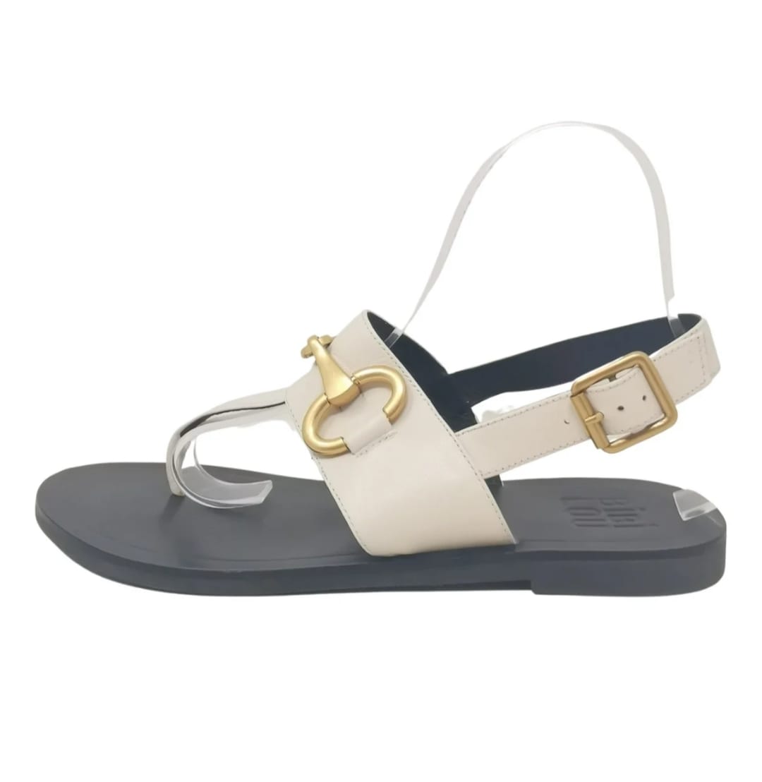 Thong sandals in light beige leather with gold-colored metal decoration and adjustable ankle strap. The inner sole measures about 25 cm and fits 38.5 or even 39, very soft leather and 1.5 cm high heel, non-slip outsole. Size 38 EU.