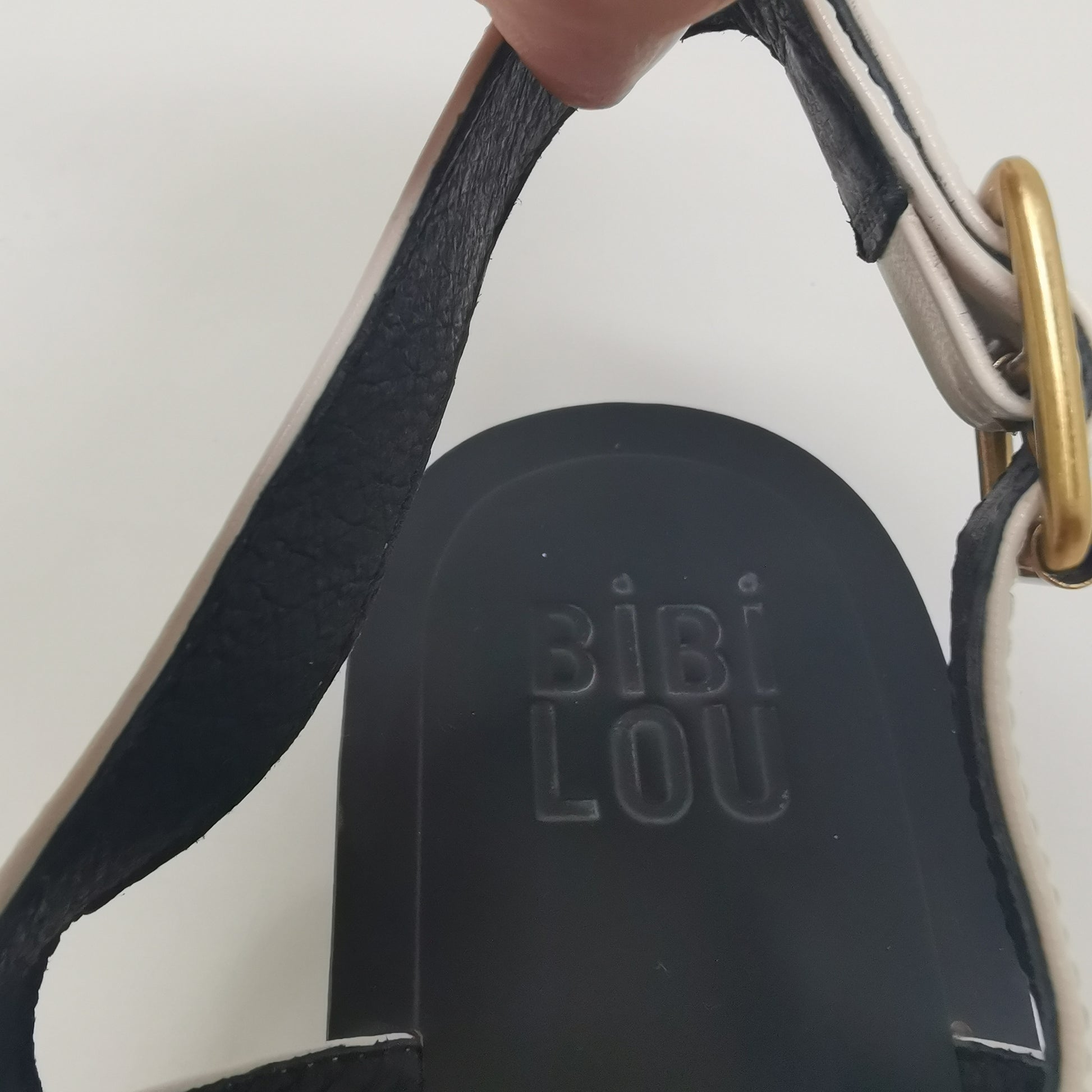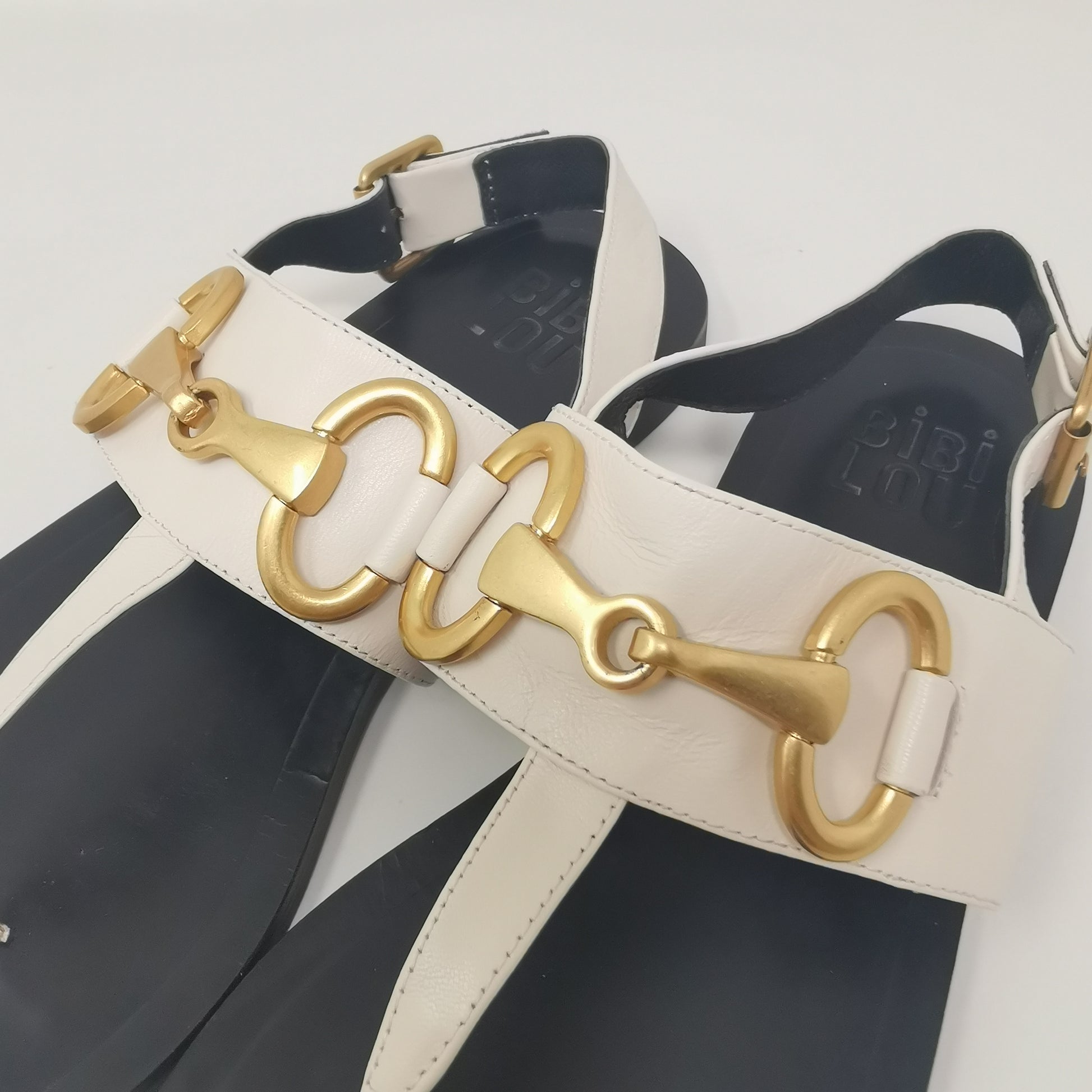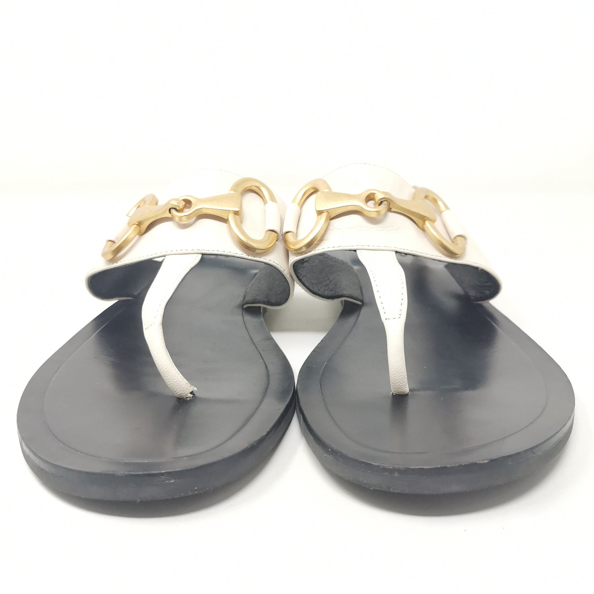 Thong sandals in light beige leather with gold-colored metal decoration and adjustable ankle strap. The inner sole measures about 25 cm and fits 38.5 or even 39, very soft leather and 1.5 cm high heel, non-slip outsole. Size 38 EU.