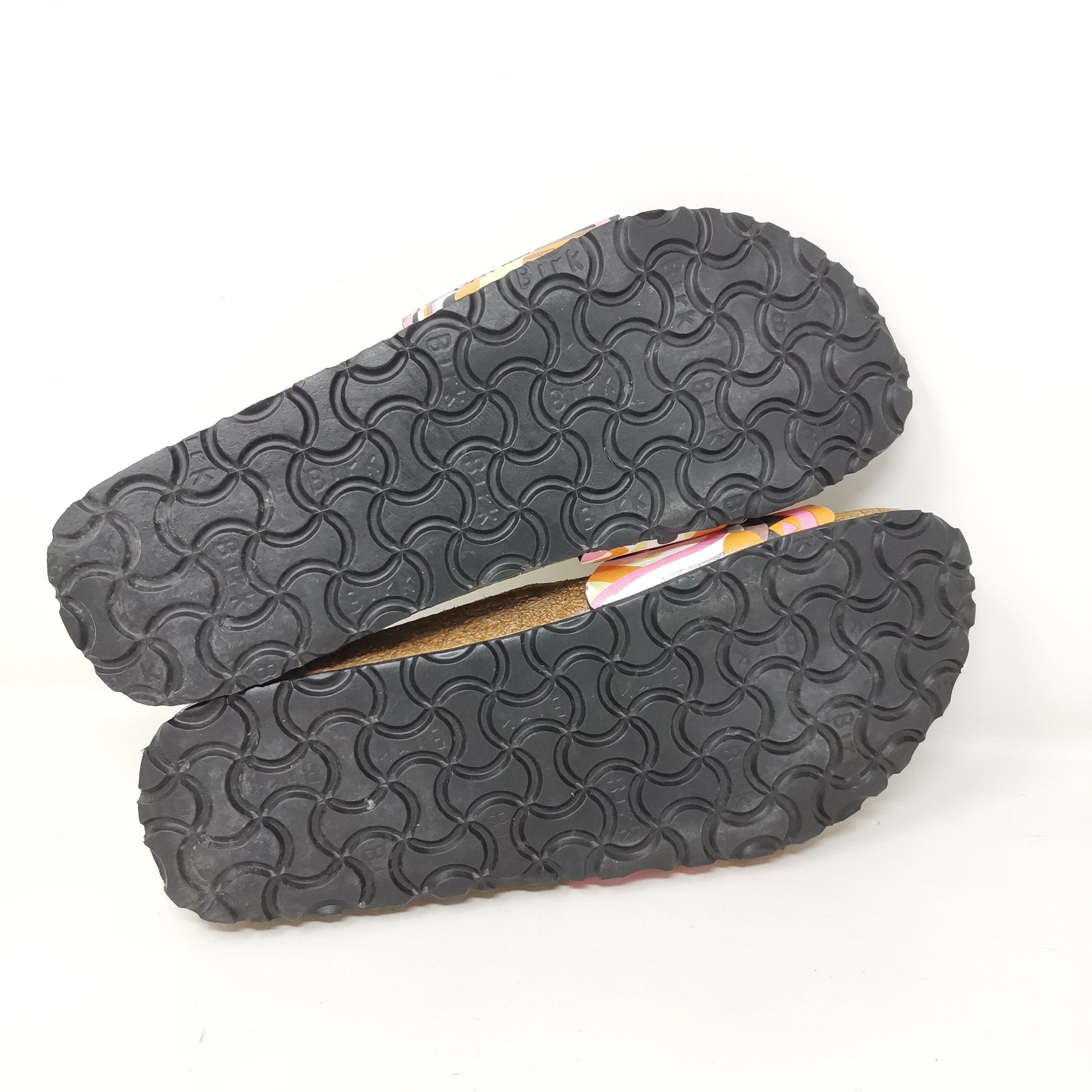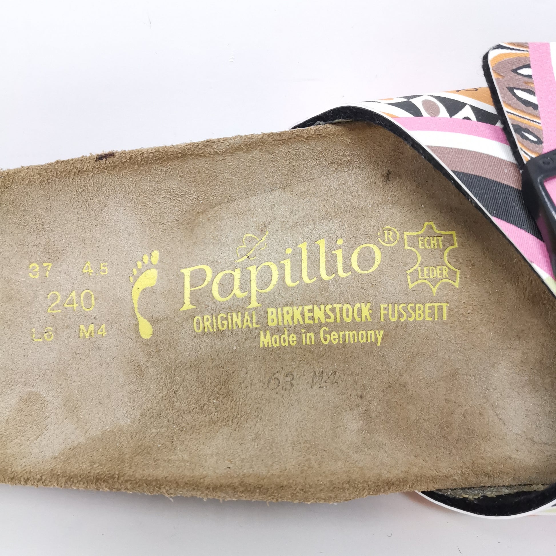 Papillio by Birkenstock, the leather insole measures 24 cm, rubber outer sole. Adjustable strap and multicolored synthetic upper. A few small marks.