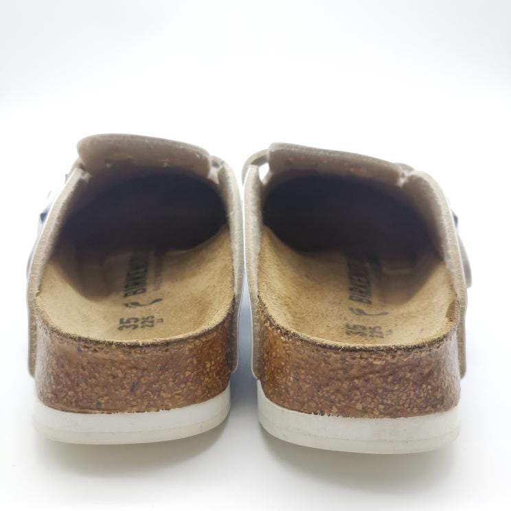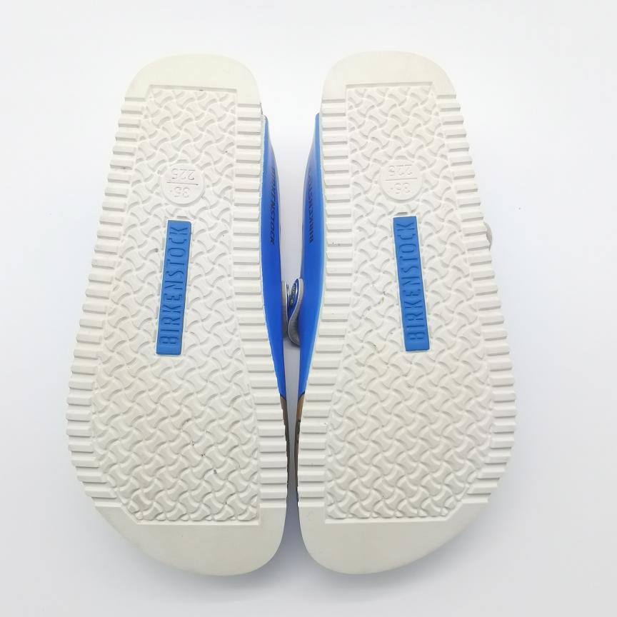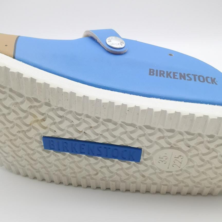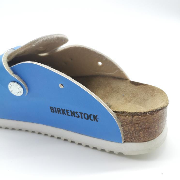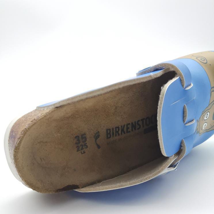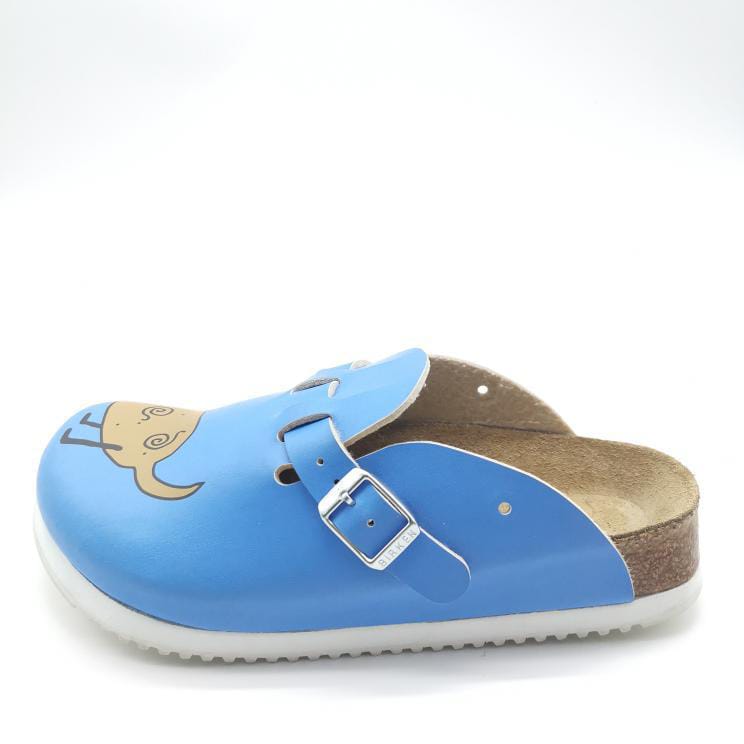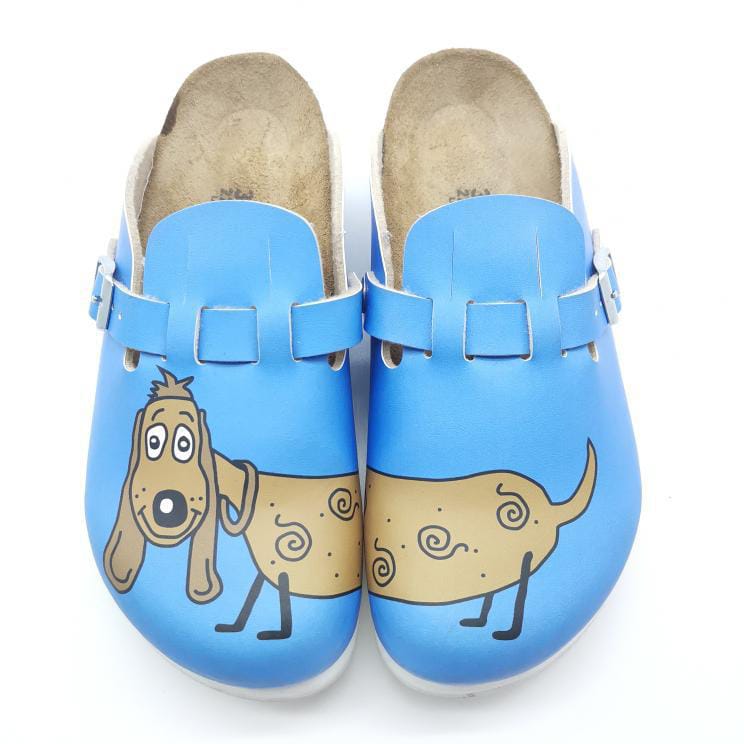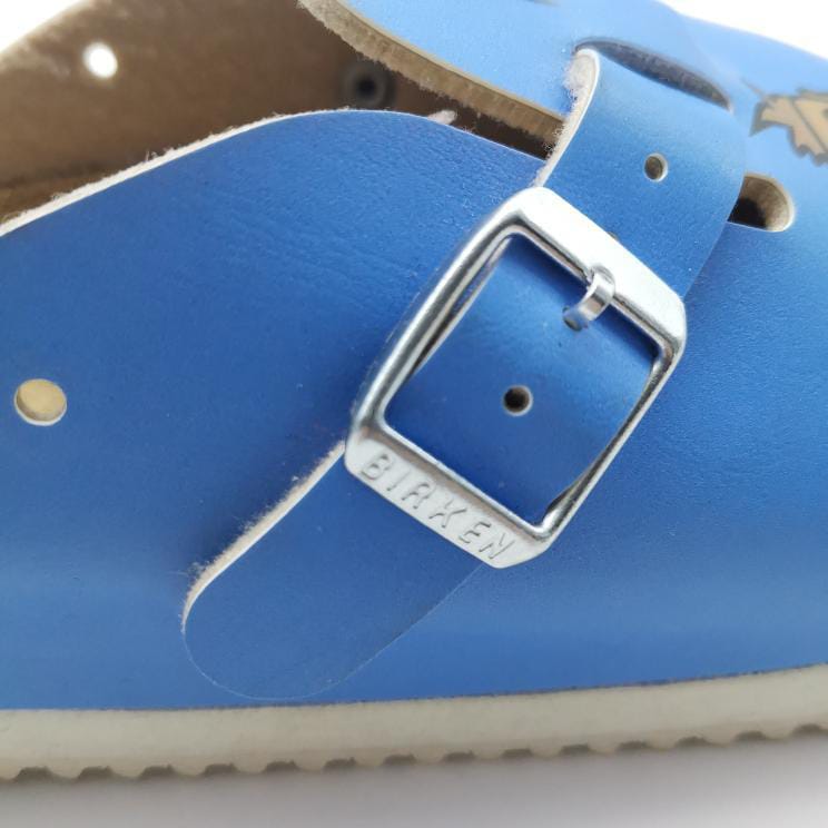 Blue leather mules with figure of a dog in khaki. The leather insole measures 22 cm, decorative buckle on the outside. Made in Germany, Birkenstock professional.
