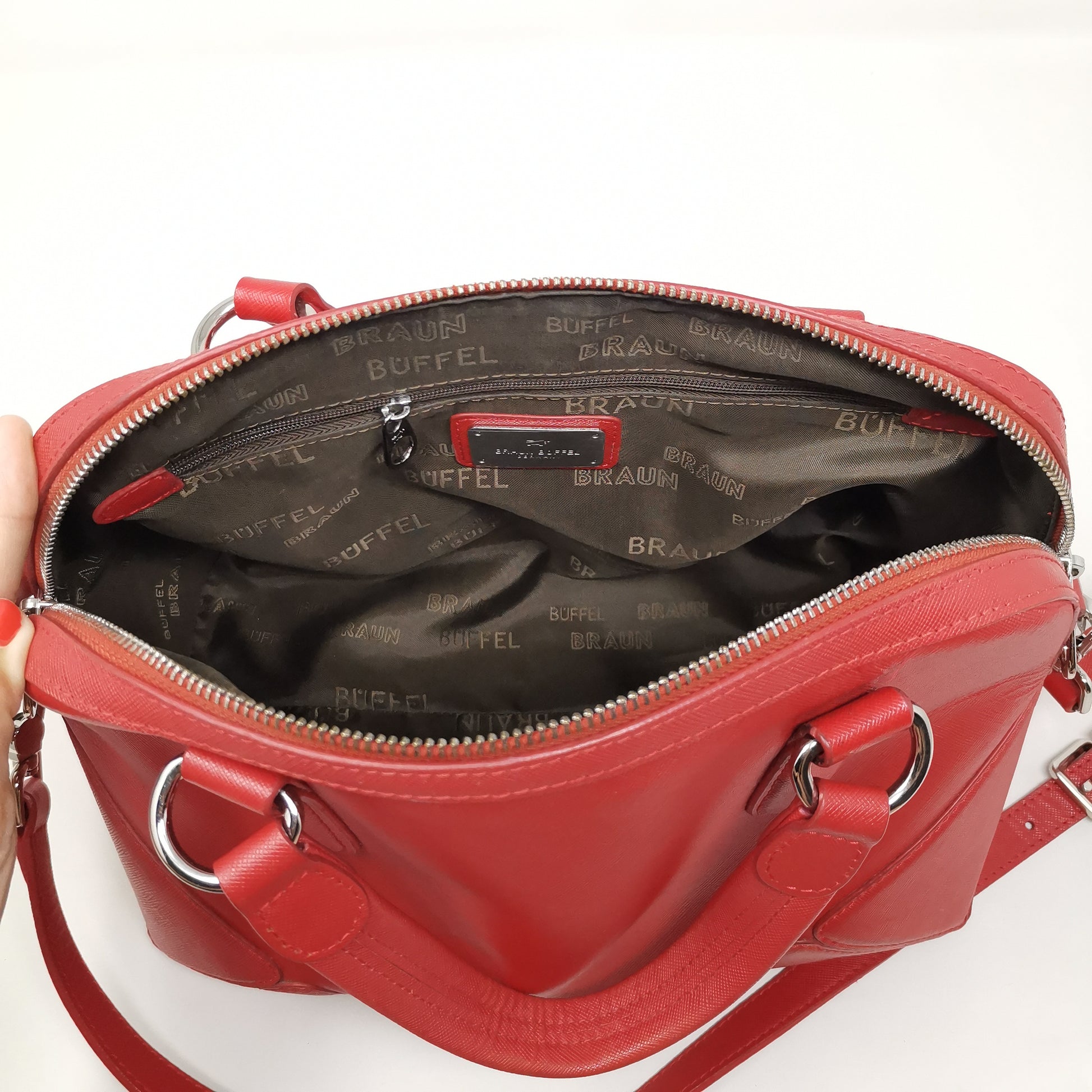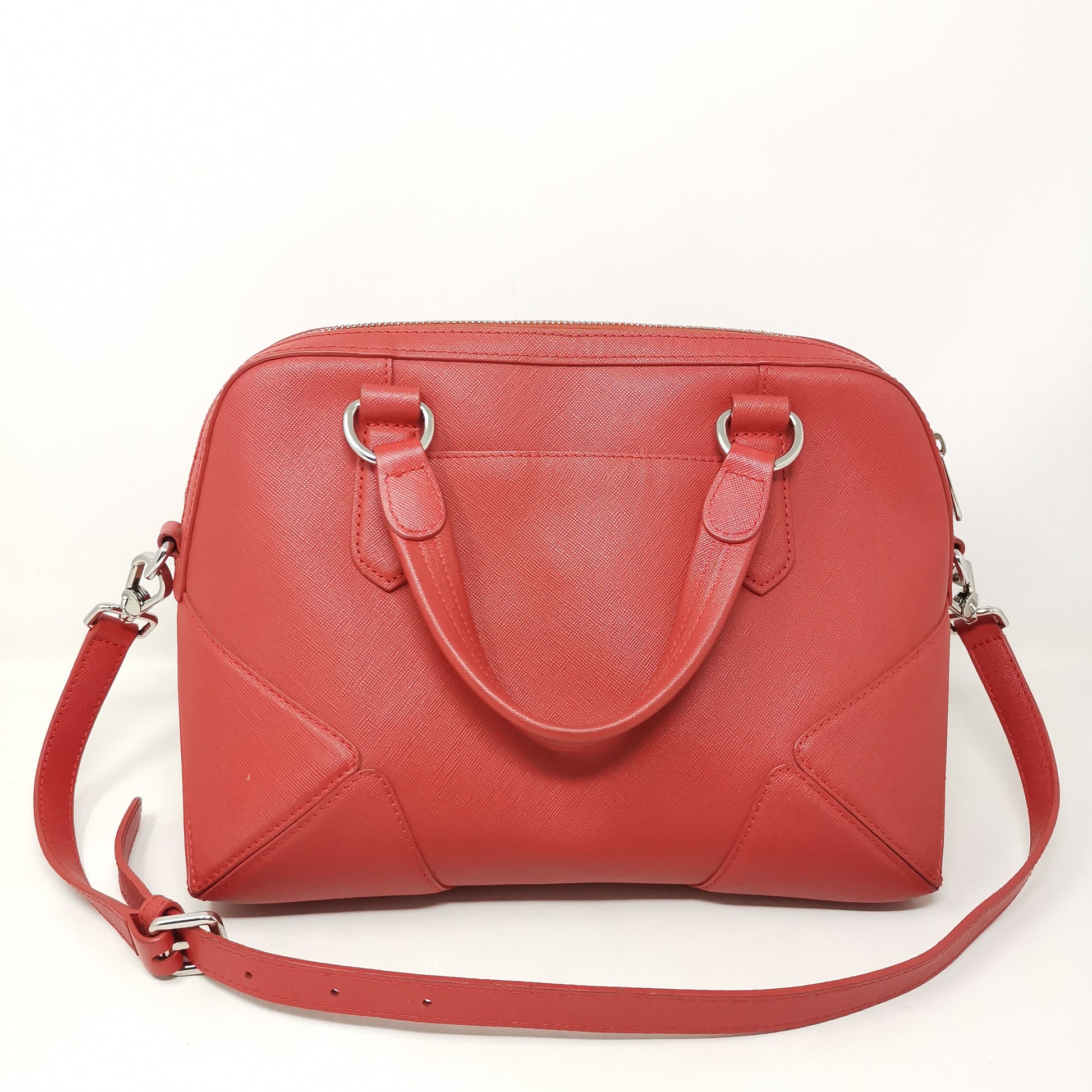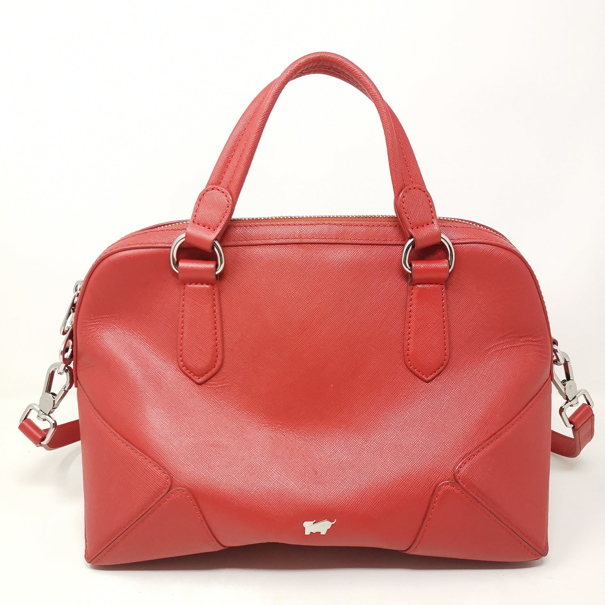 Red leather bag with double handles and adjustable, removable shoulder strap.