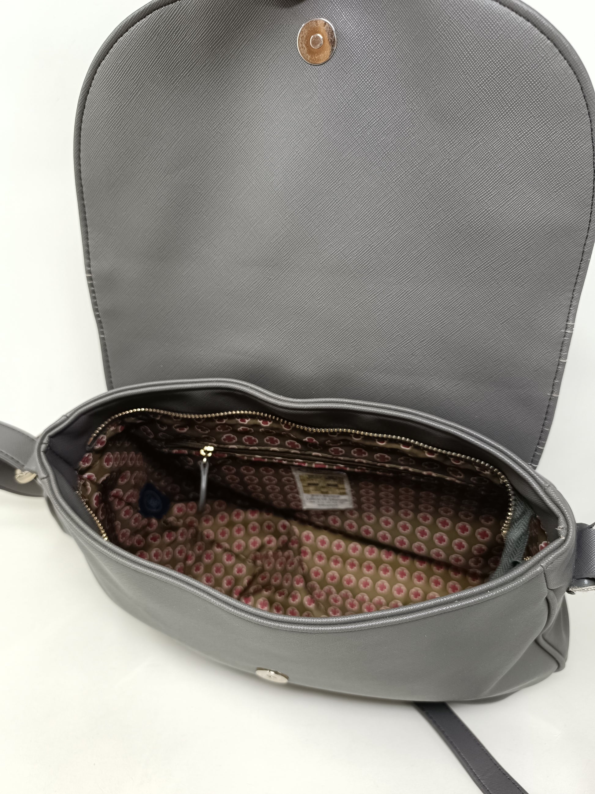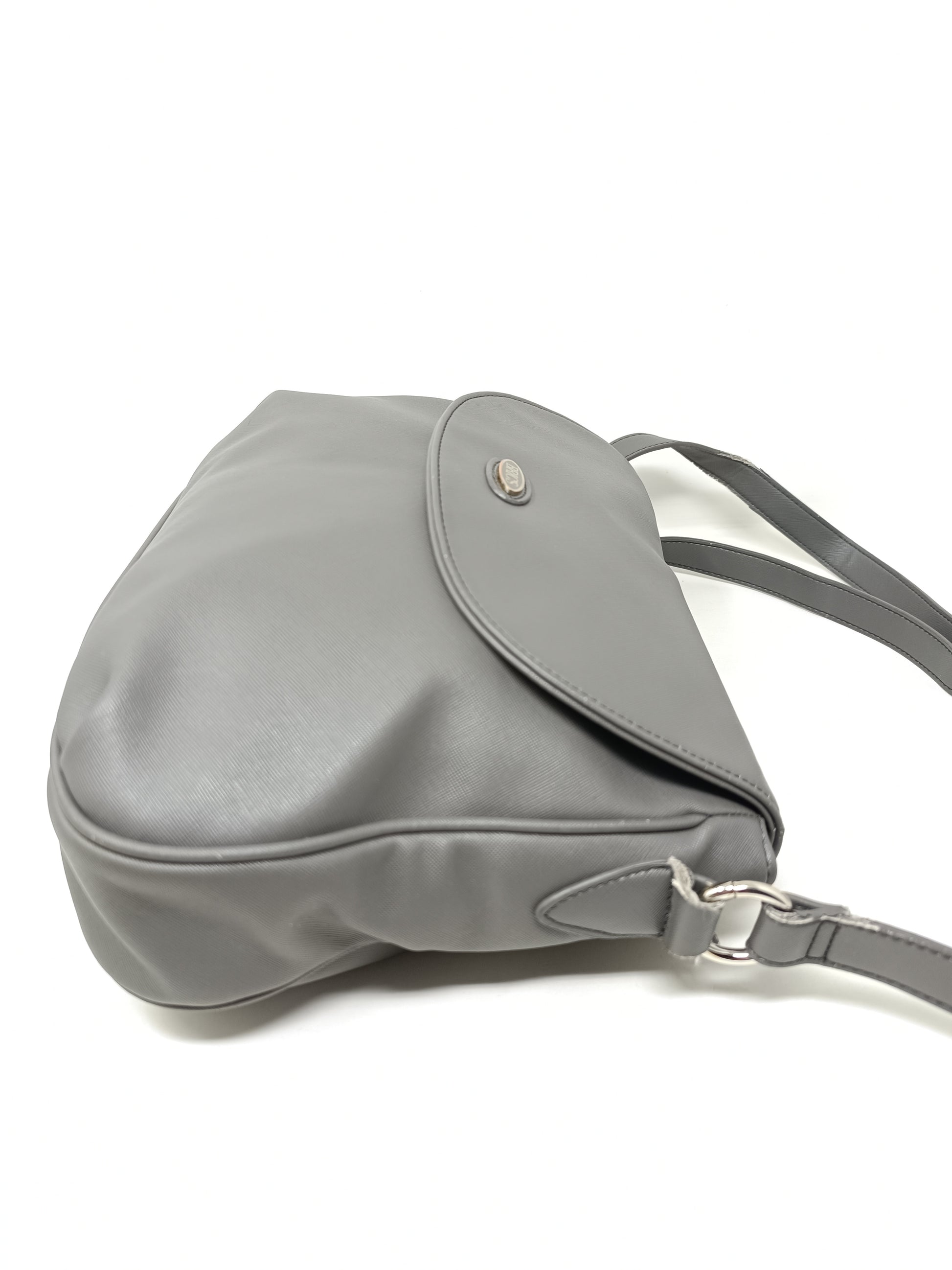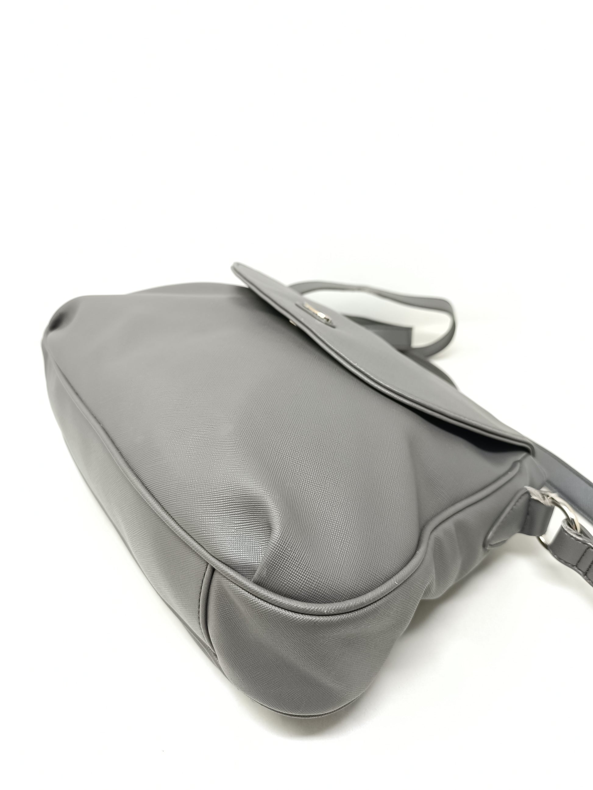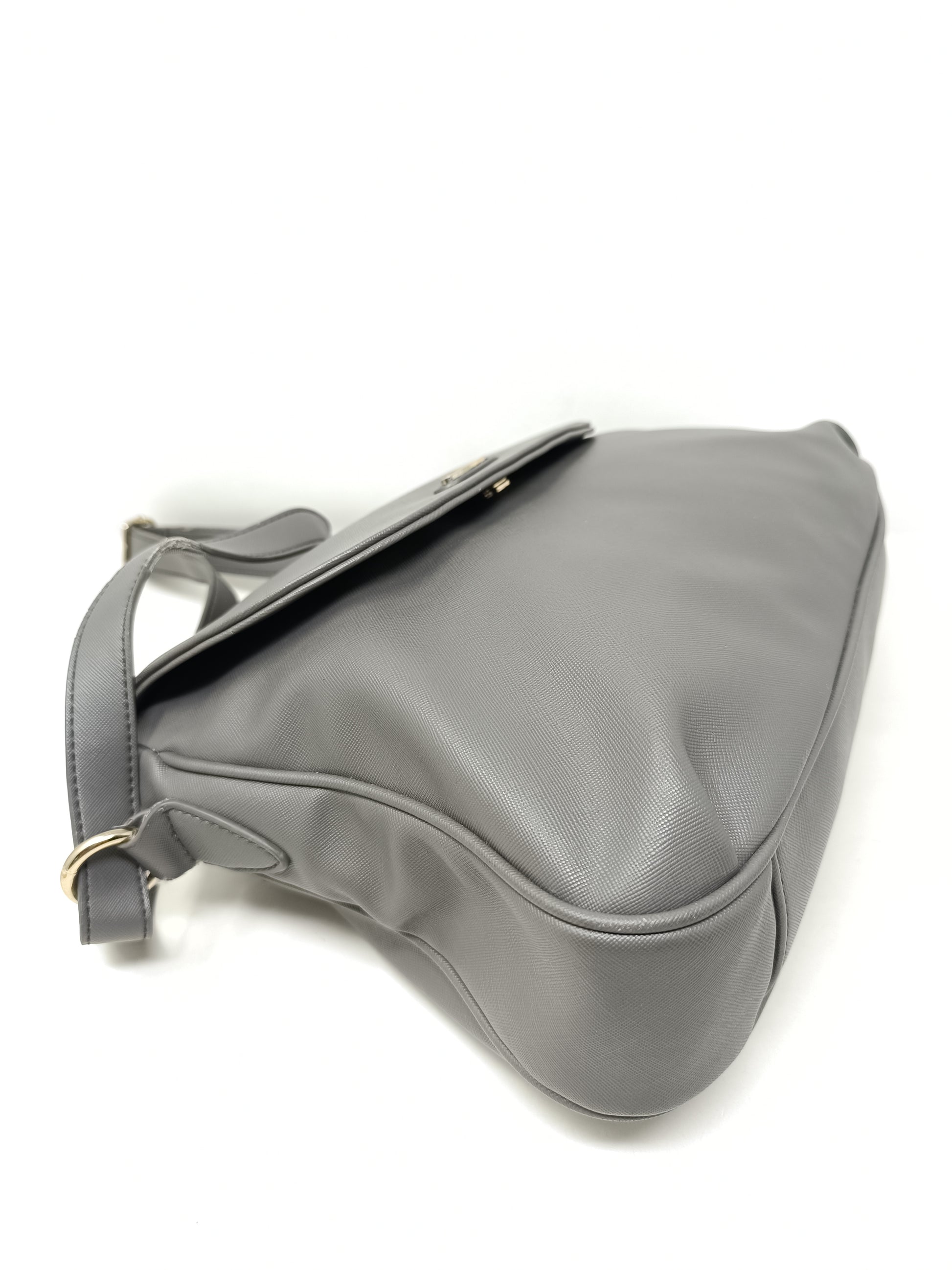 Gray PVC maxi bag with flap closure and internal button, adjustable handle and silver-colored metal hardware, external zip pocket. Fabric interior with pocket, some small marks on the handle, inside of the flap and outside pocket. 35x23x7cm.