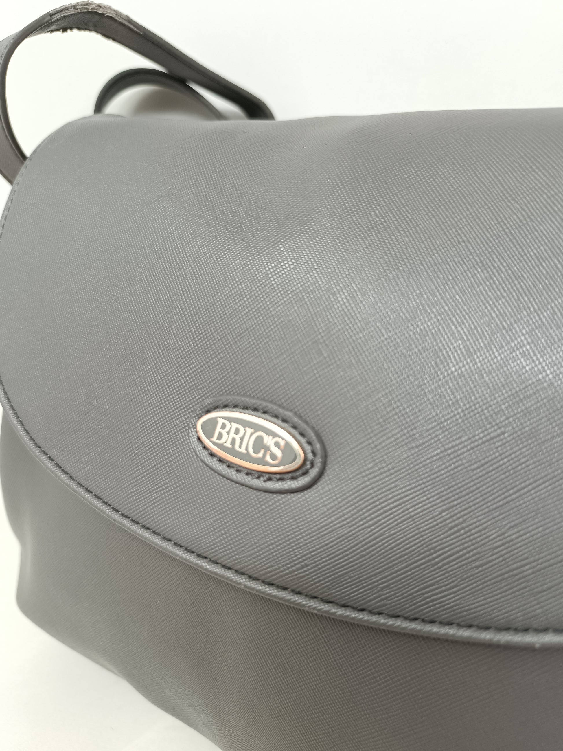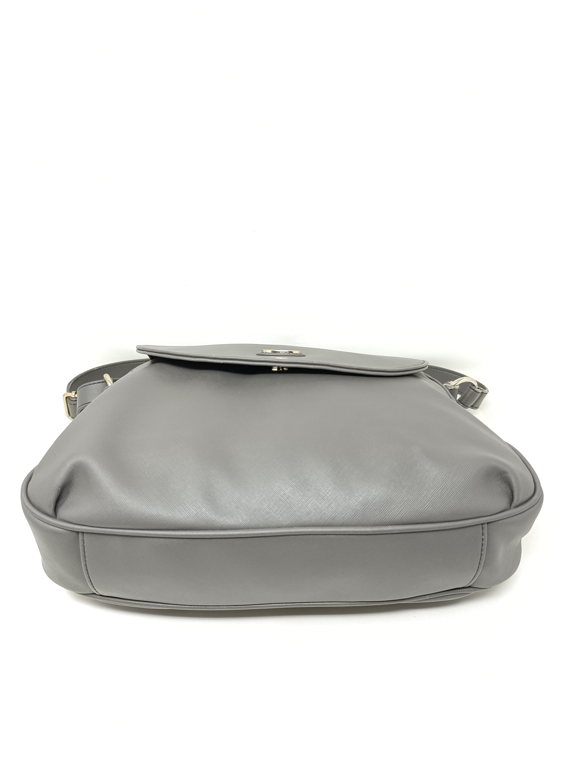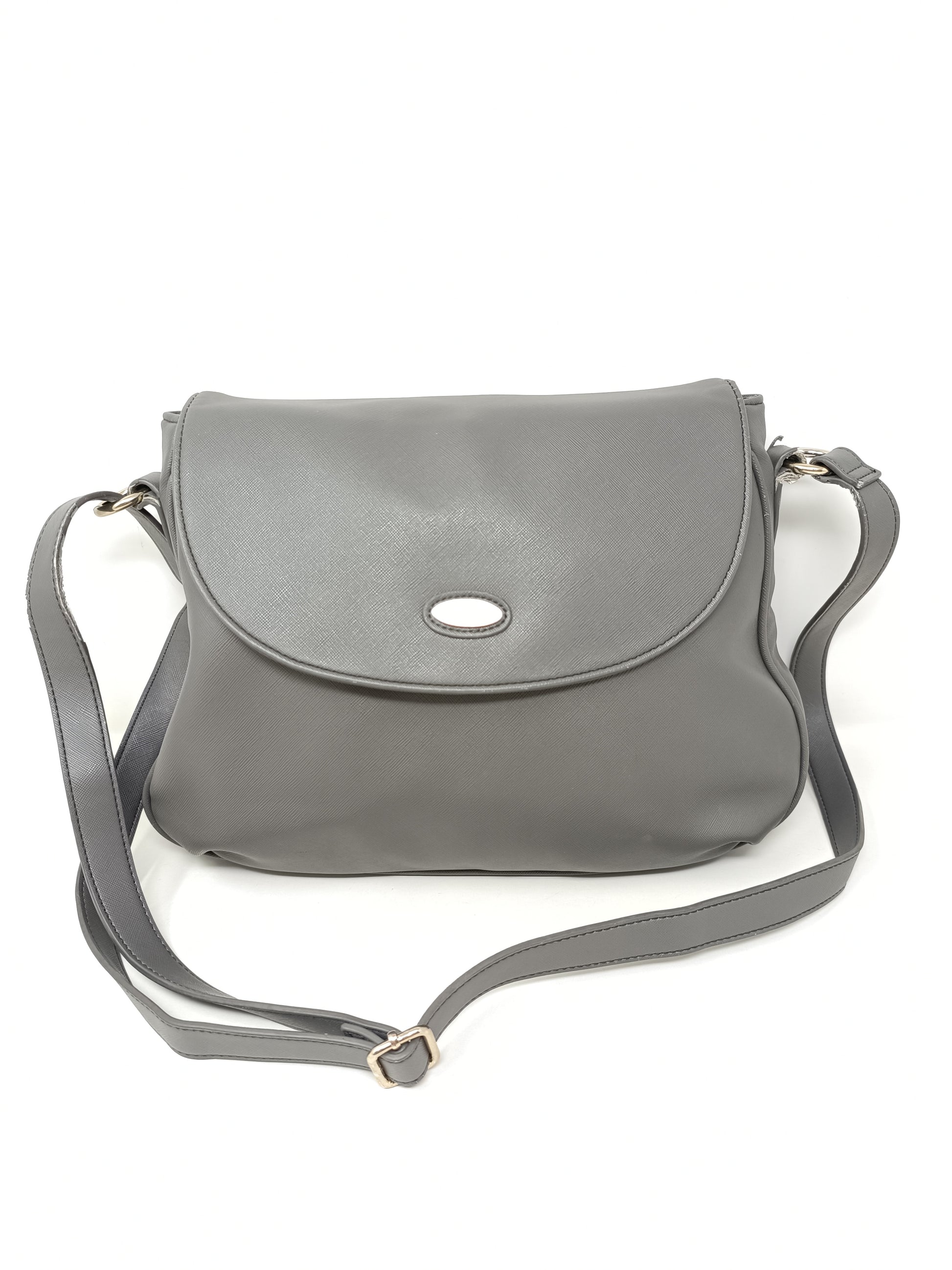 Gray PVC maxi bag with flap closure and internal button, adjustable handle and silver-colored metal hardware, external zip pocket. Fabric interior with pocket, some small marks on the handle, inside of the flap and outside pocket. 35x23x7cm.