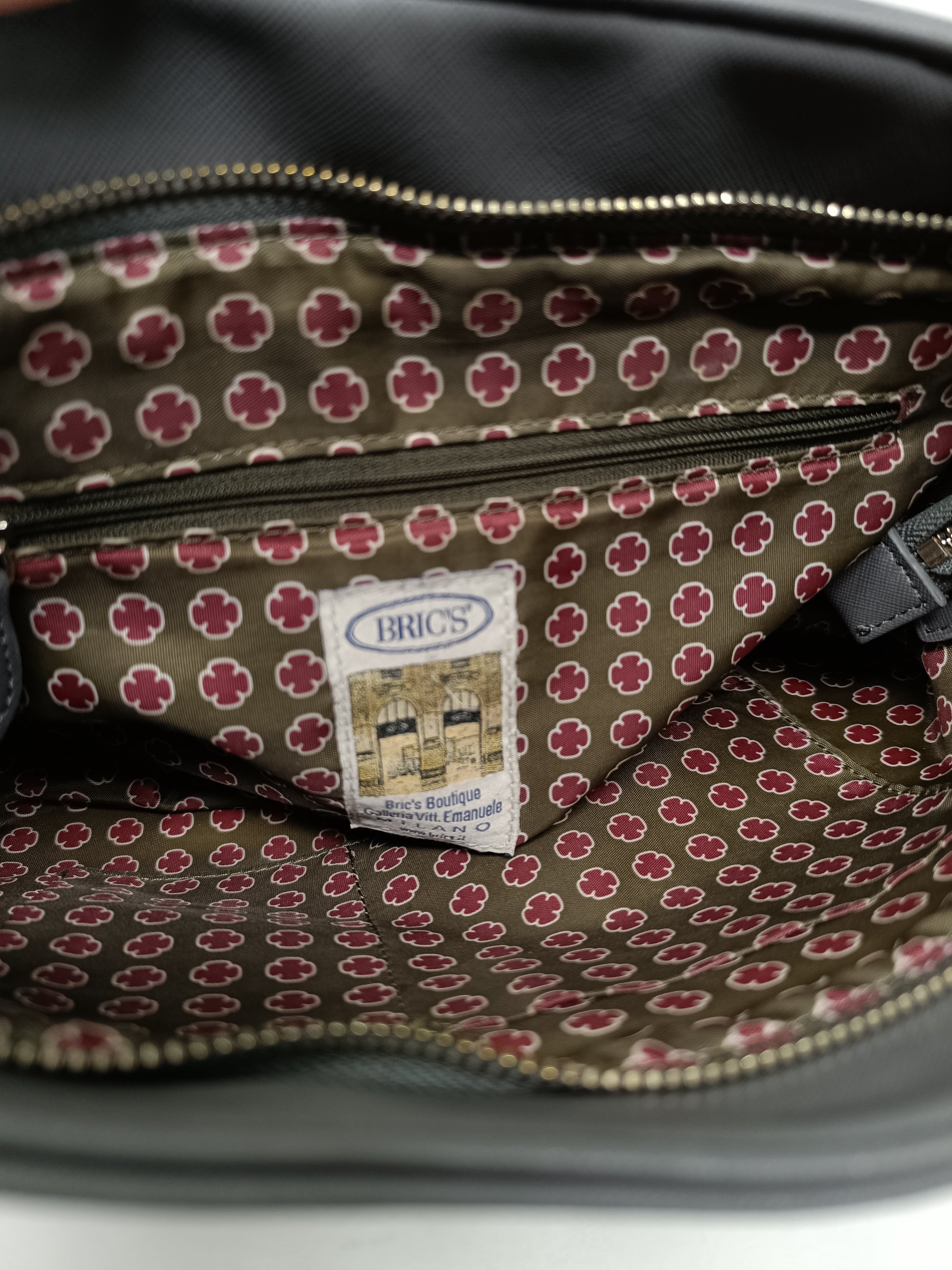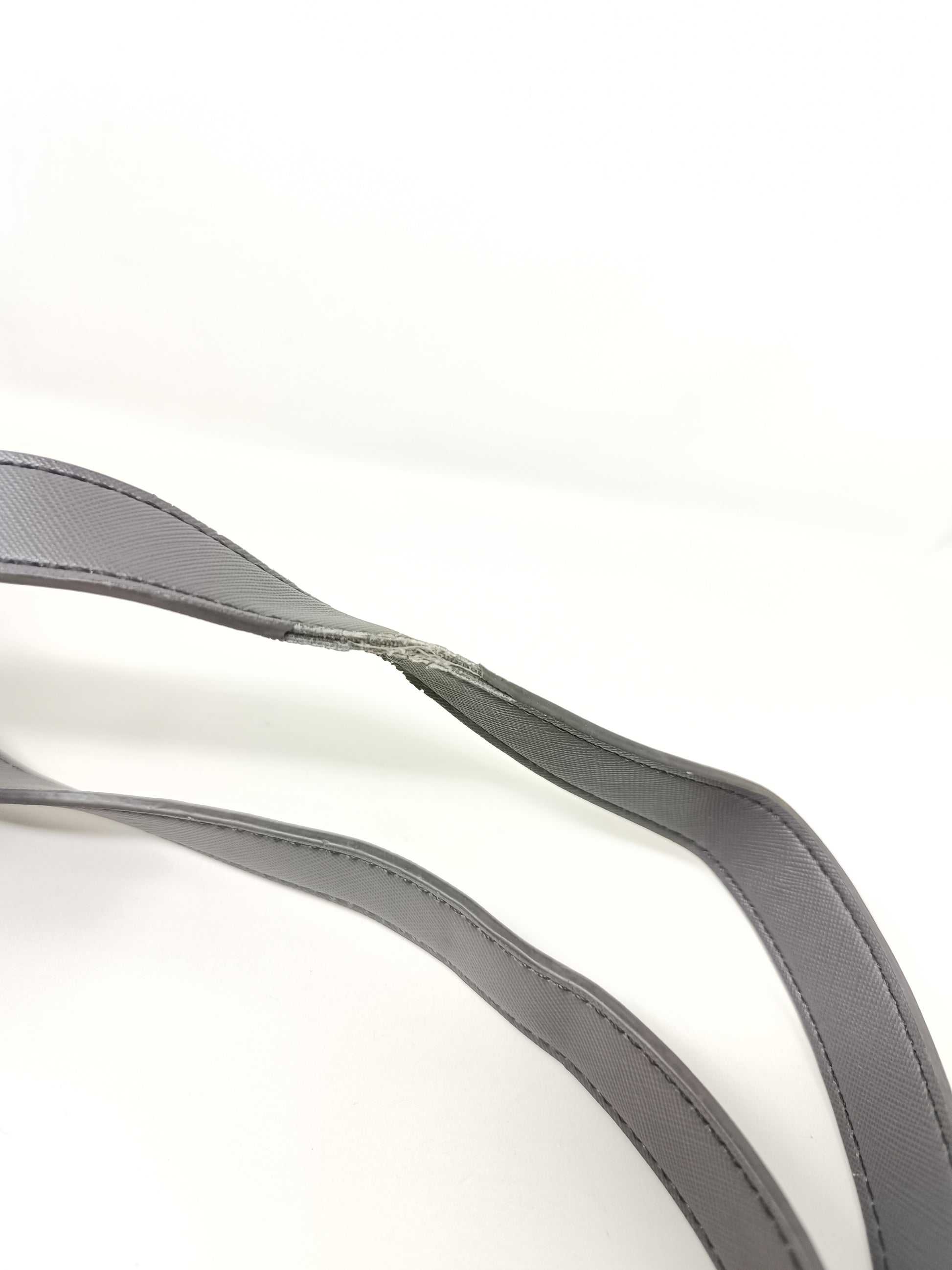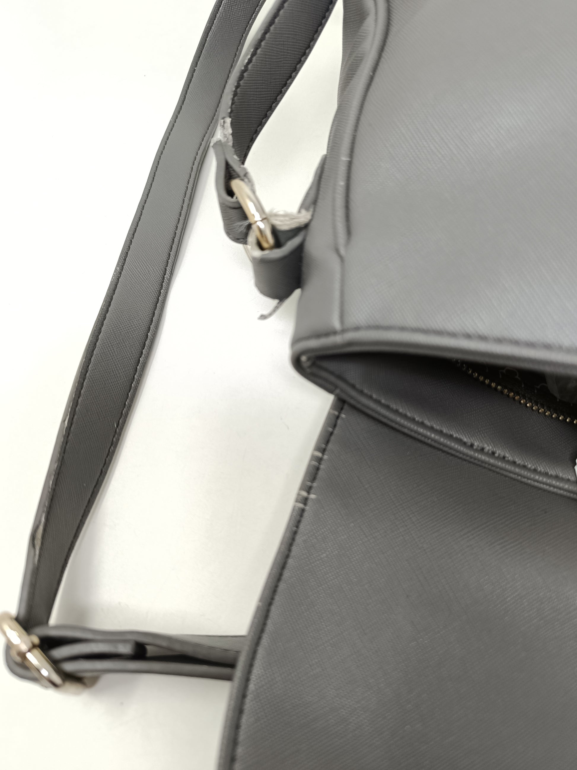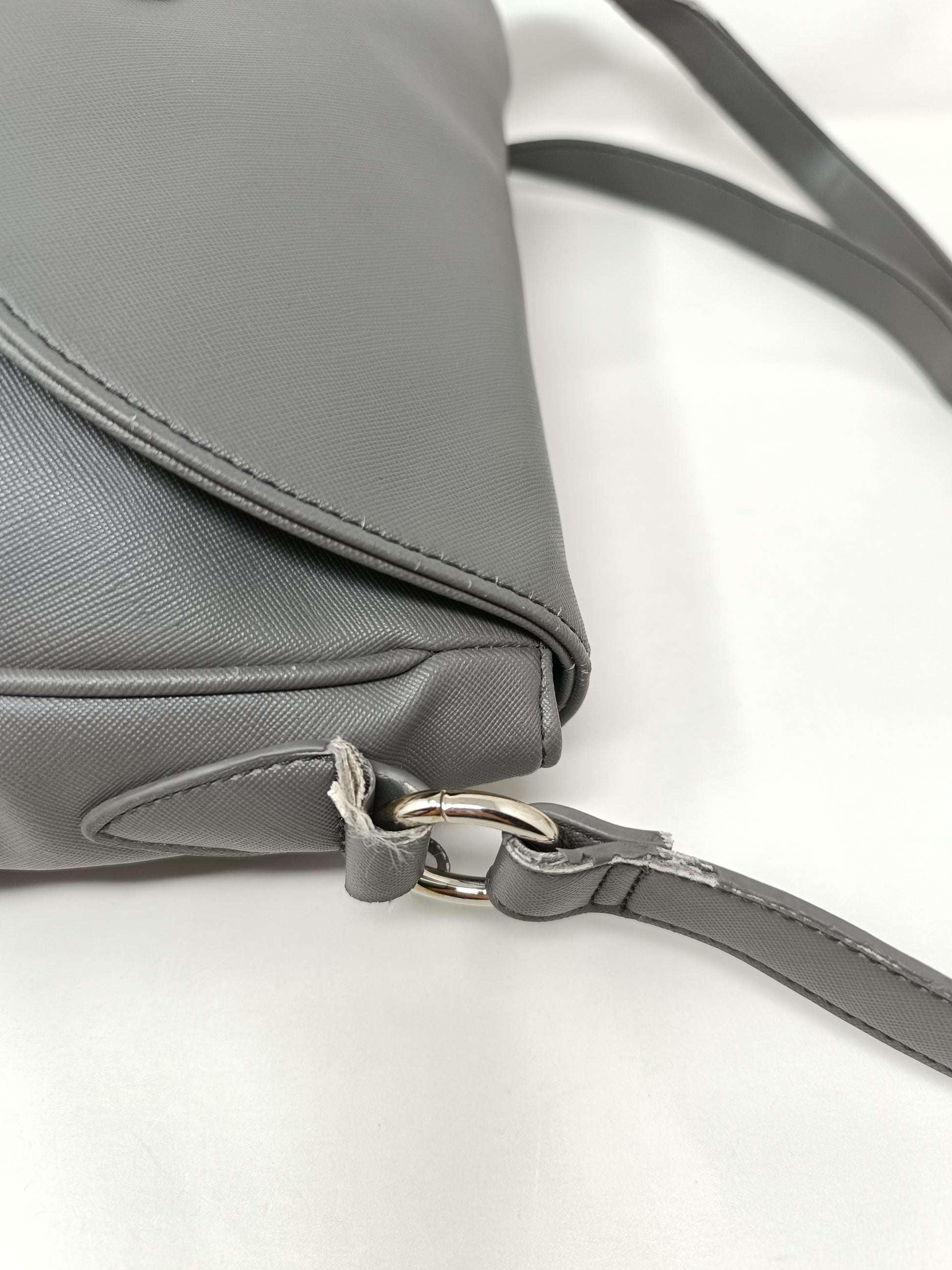 Gray PVC maxi bag with flap closure and internal button, adjustable handle and silver-colored metal hardware, external zip pocket. Fabric interior with pocket, some small marks on the handle, inside of the flap and outside pocket. 35x23x7cm.