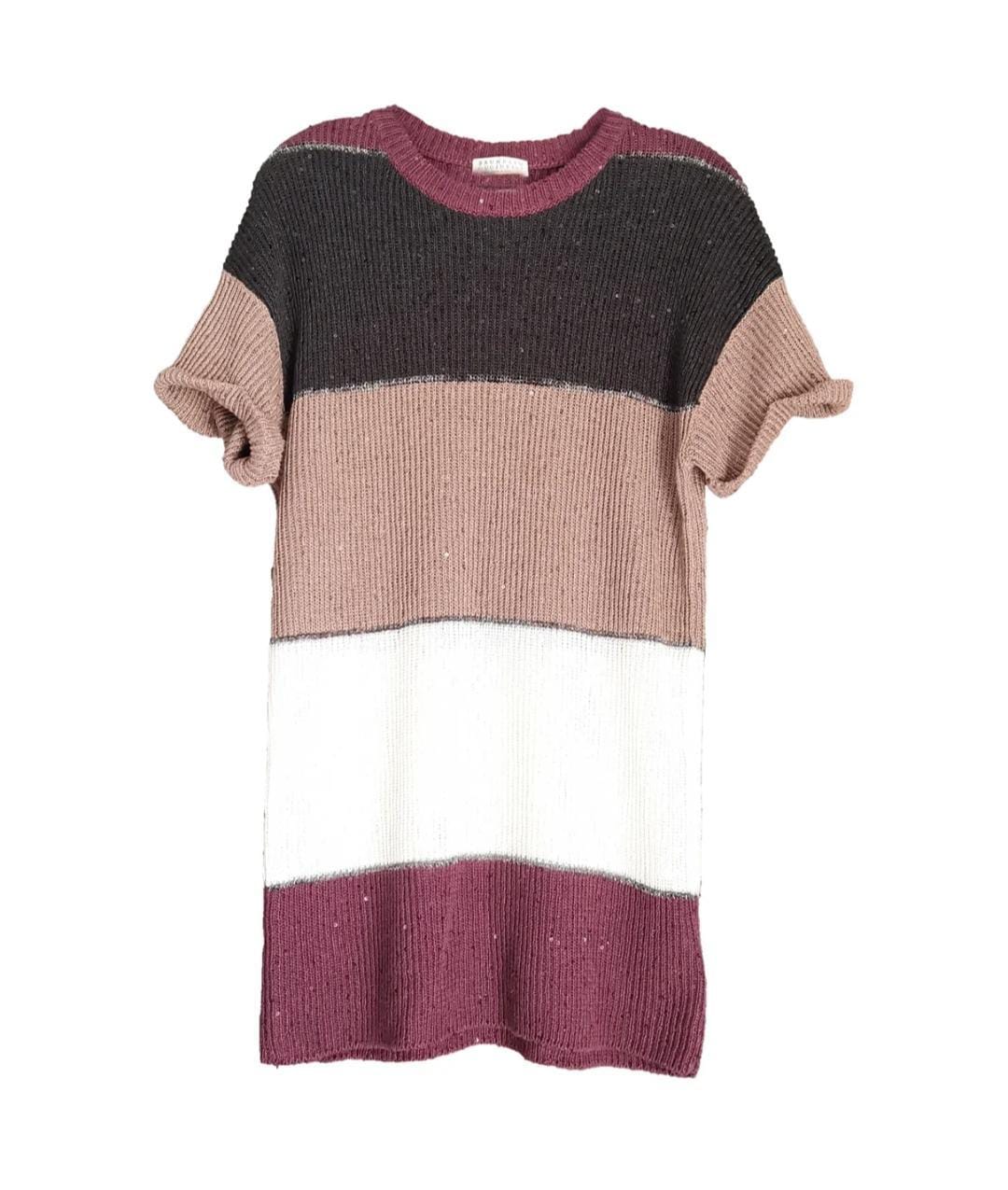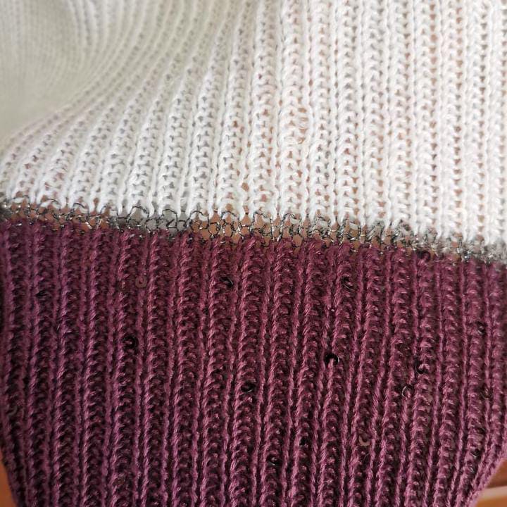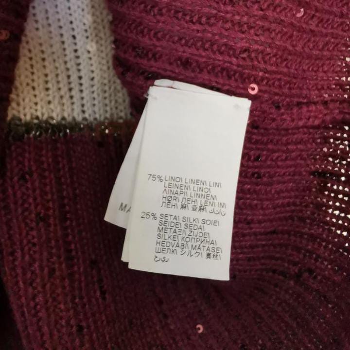 Short-sleeved linen and silk jersey with micro sequins. Colours black, white, burgundy and light brown. Each colour band is tied by silver threads.