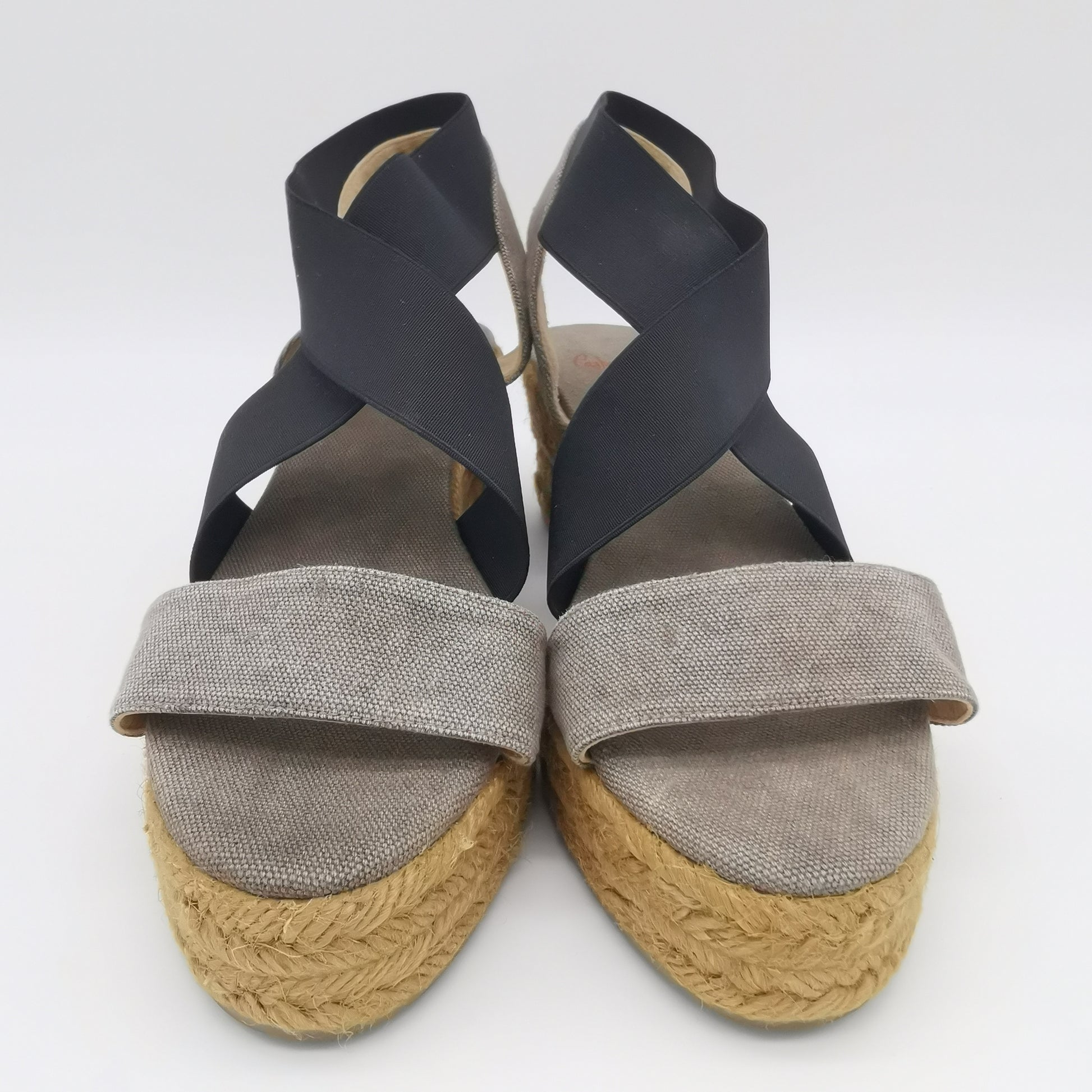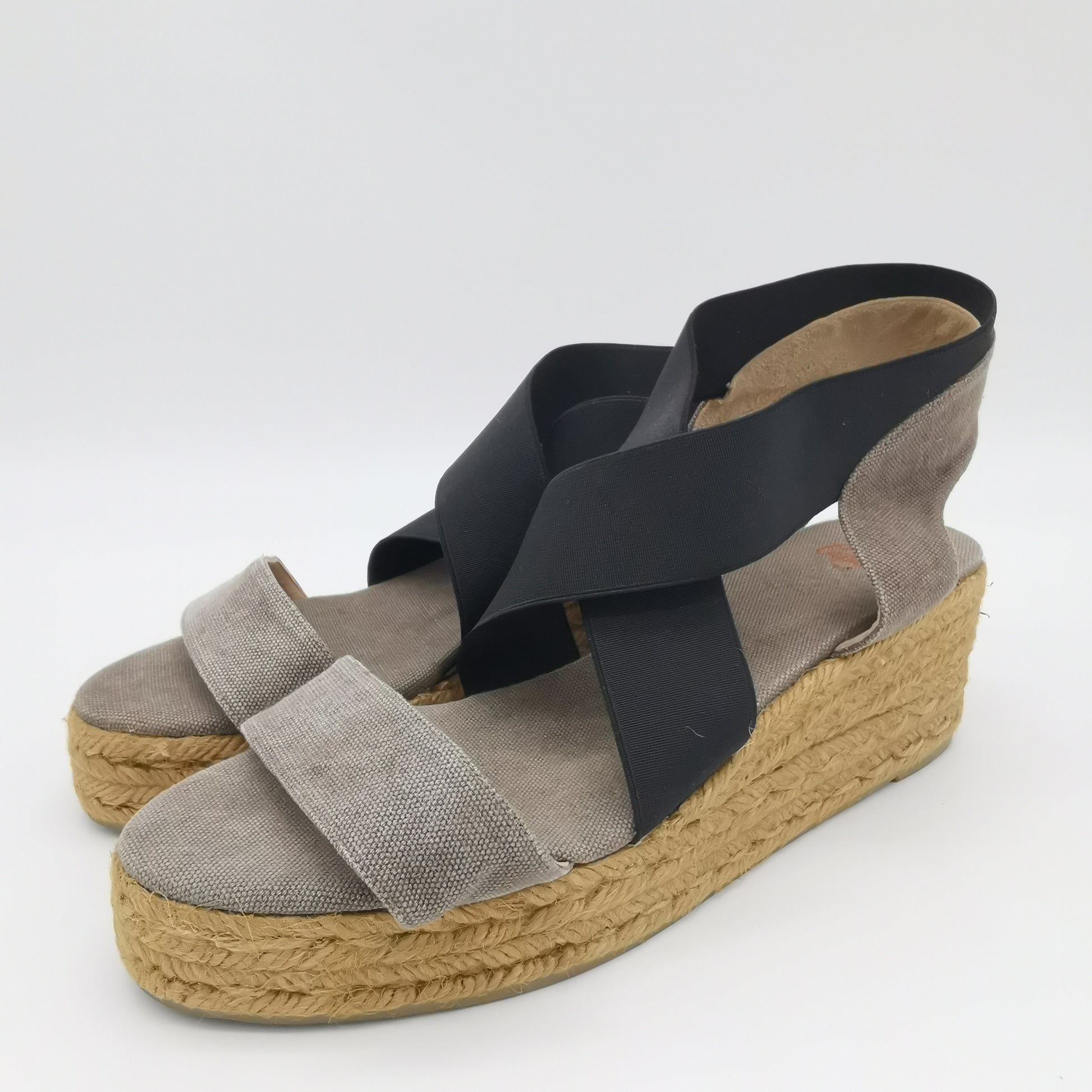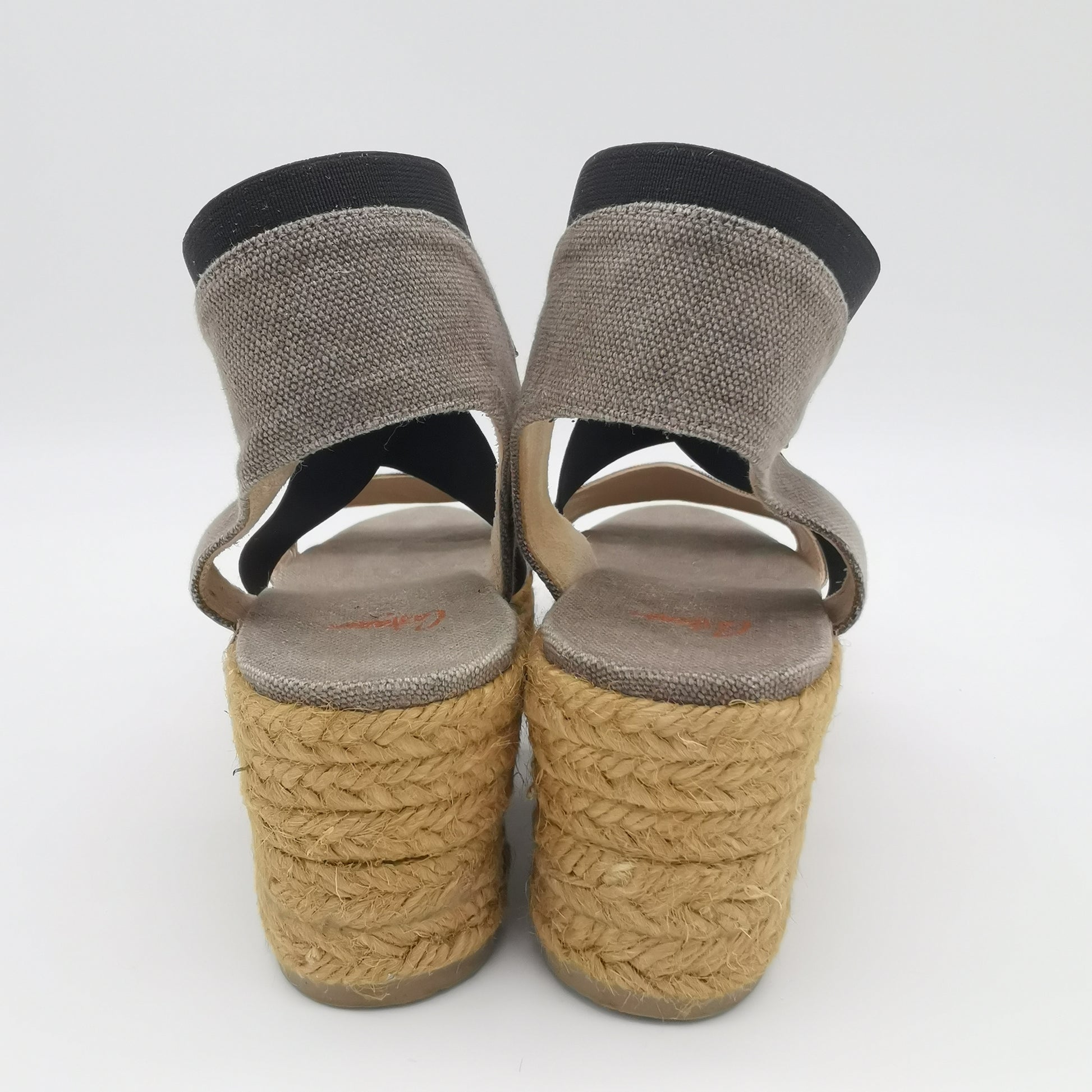 Grey canvas sandals with 6 cm high heel and 2.5 cm platform in beige rope. Black cross-over elastic at the ankle. Very comfortable. The insole is approximately 25,5 cm long. Size 40 EU.