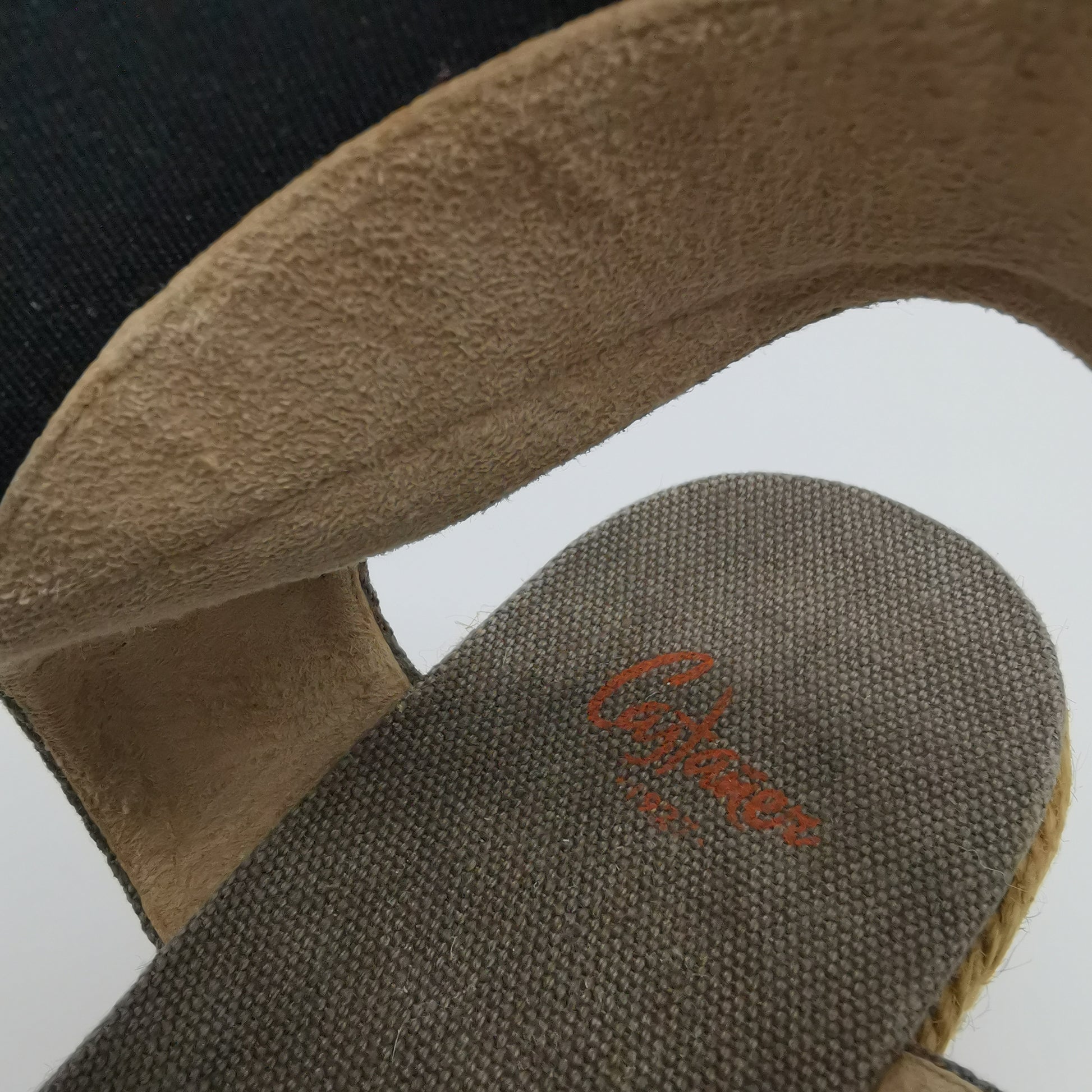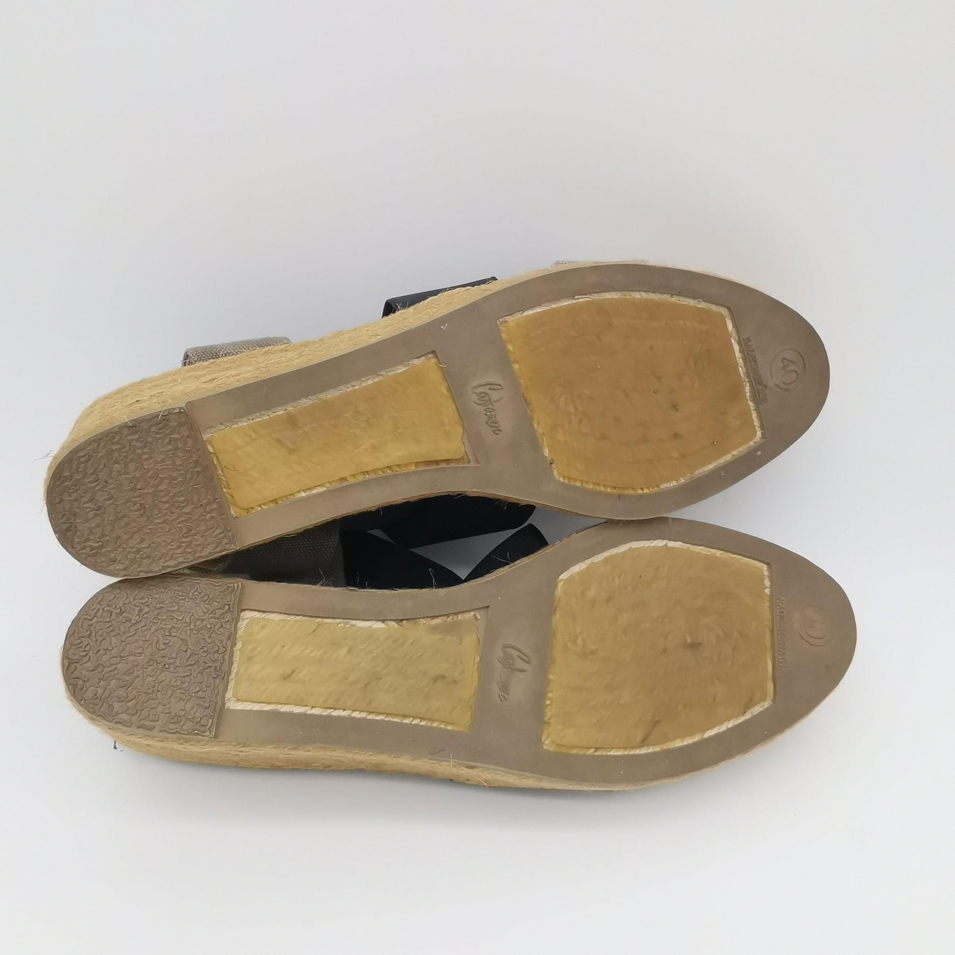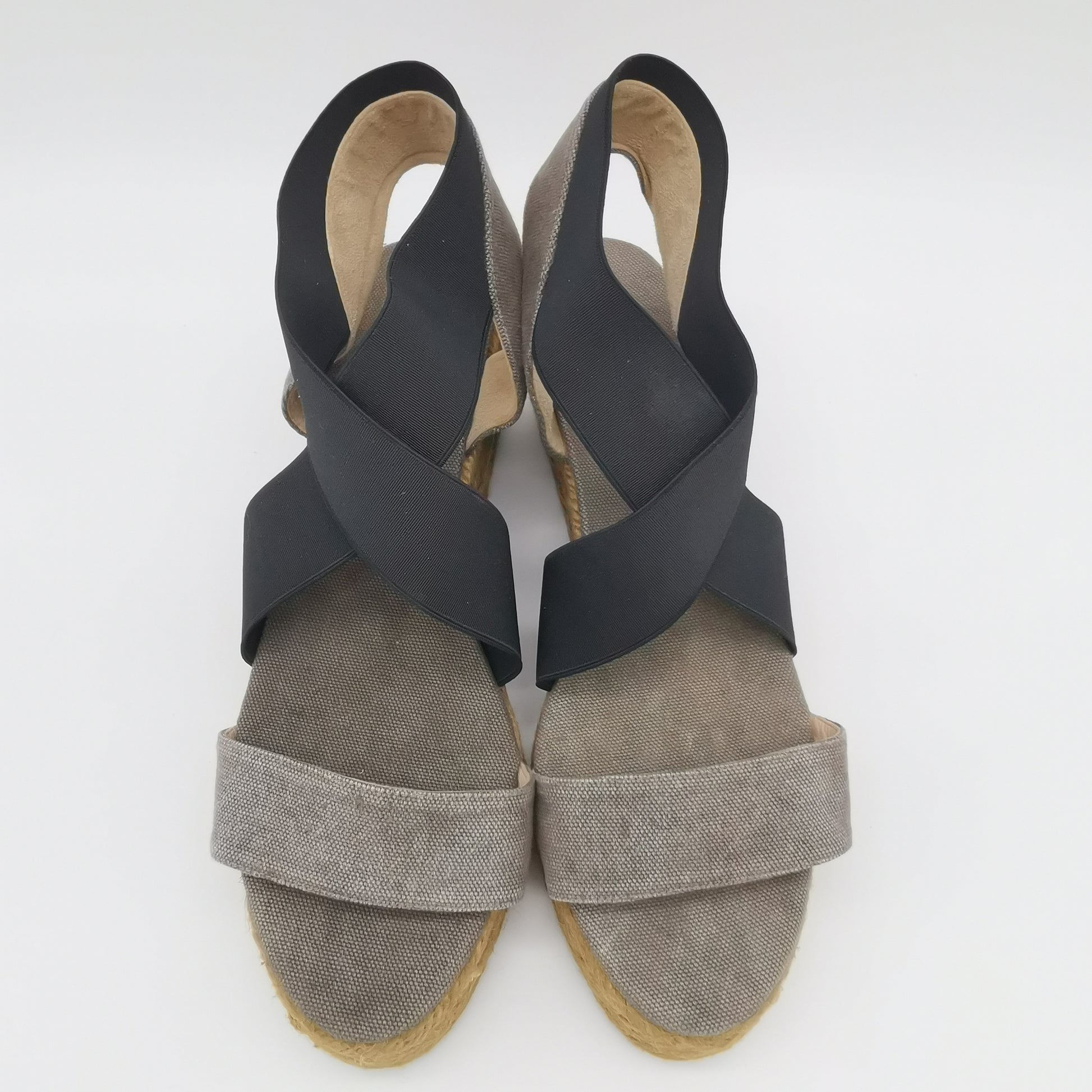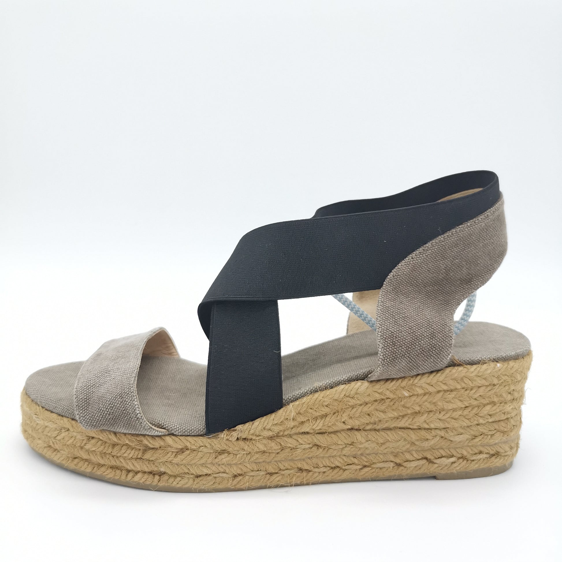 Grey canvas sandals with 6 cm high heel and 2.5 cm platform in beige rope. Black cross-over elastic at the ankle. Very comfortable. The insole is approximately 25,5 cm long. Size 40 EU.
