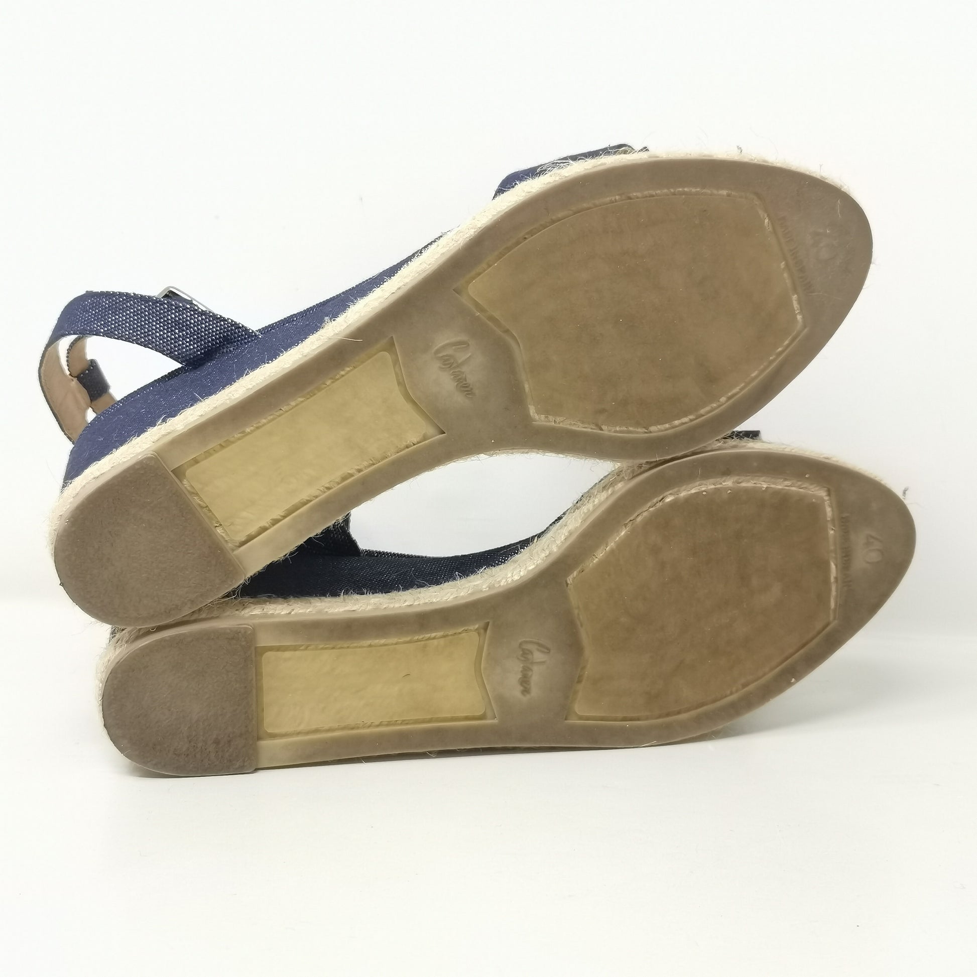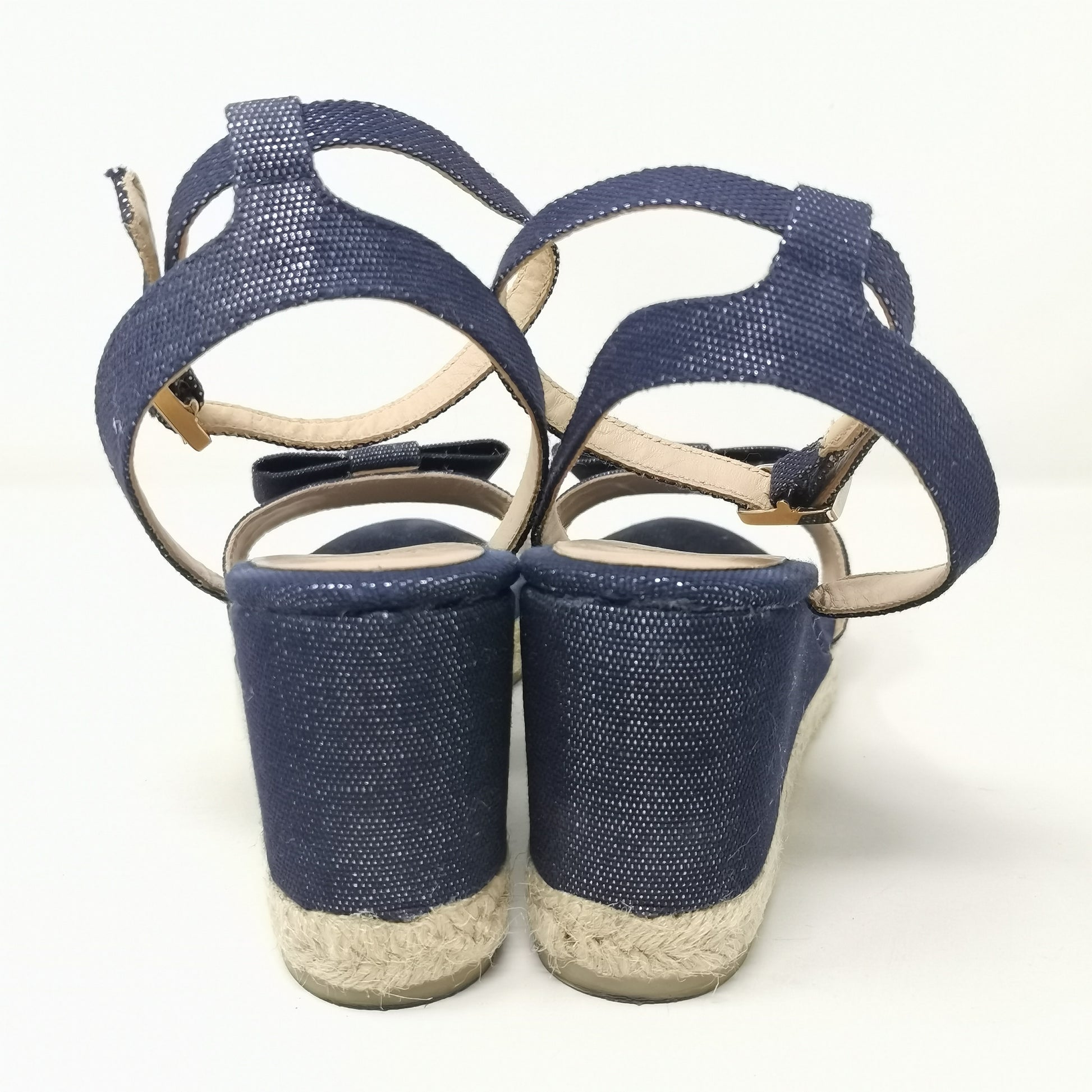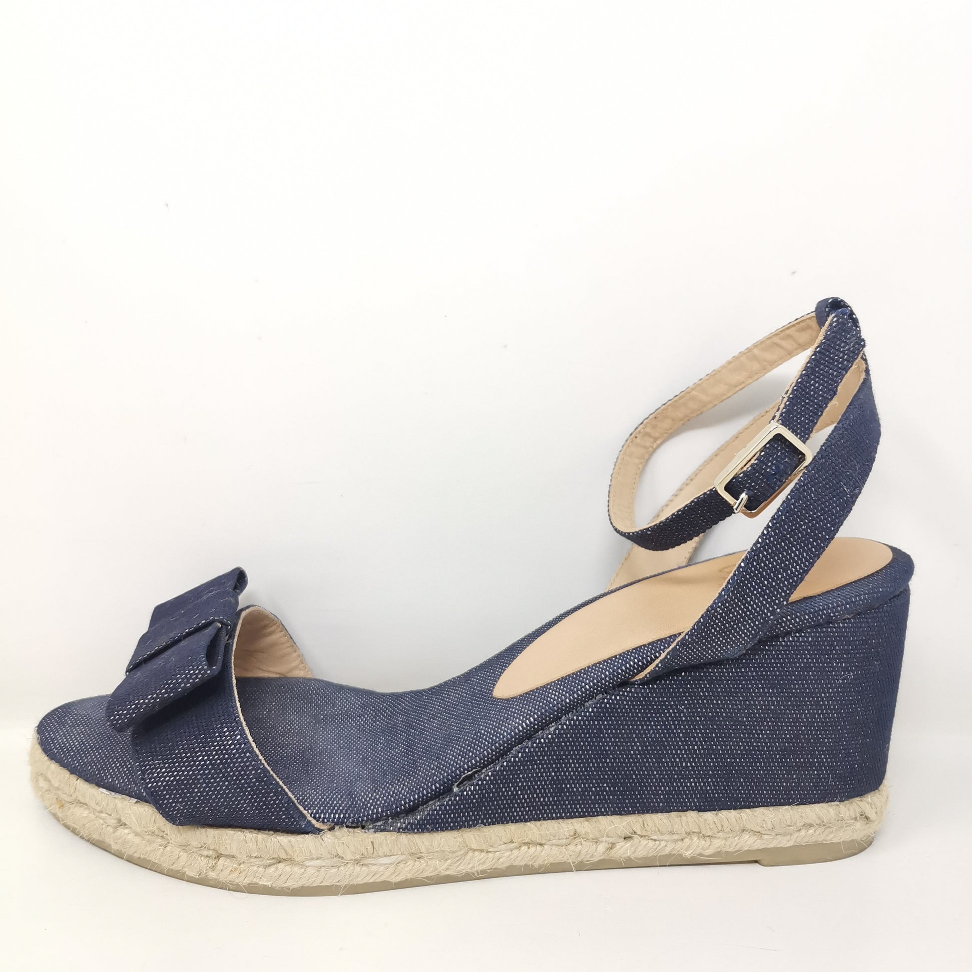 Denim-like canvas wedges 7.5 cm high and 1.5 cm platform. Internal sole in fabric and external rubber. Adjustable ankle strap, some light halos on the insole, excellent condition, complete with original box. Size 40 EU.