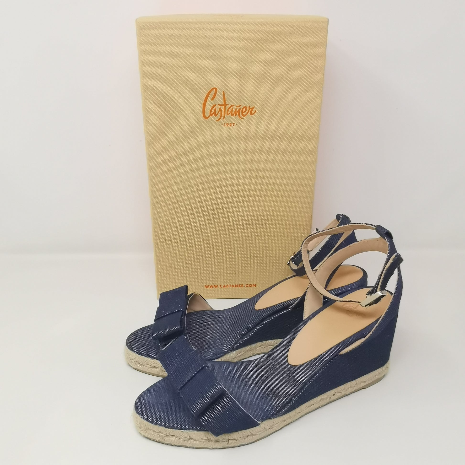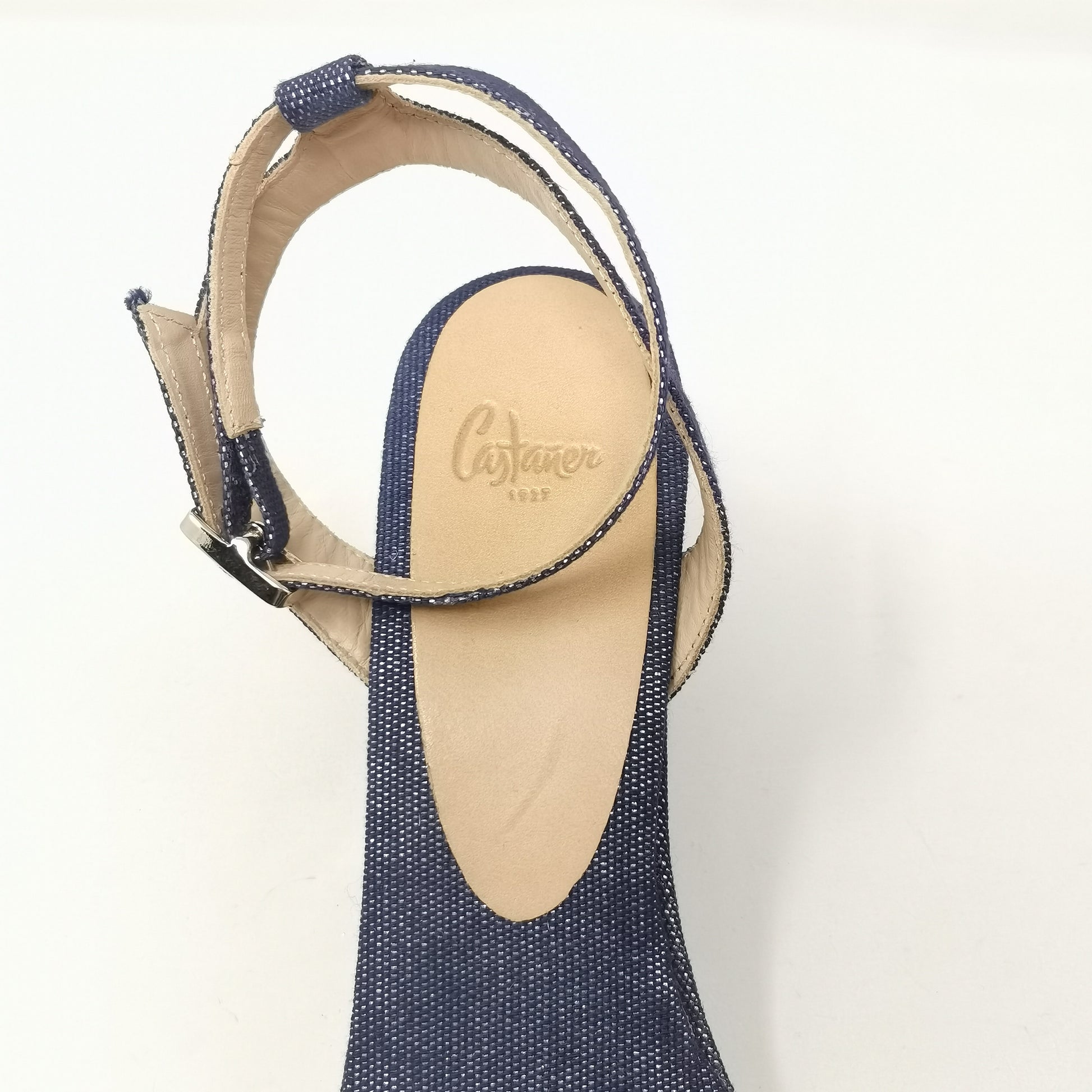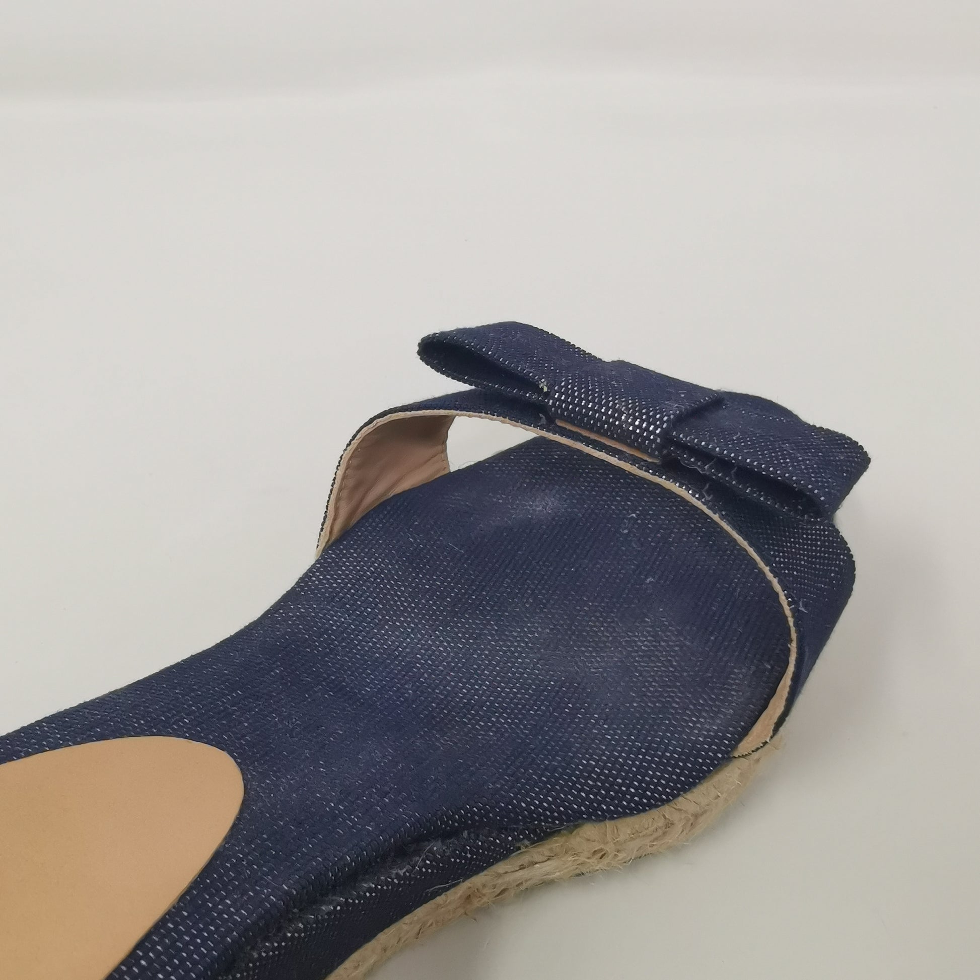 Denim-like canvas wedges 7.5 cm high and 1.5 cm platform. Internal sole in fabric and external rubber. Adjustable ankle strap, some light halos on the insole, excellent condition, complete with original box. Size 40 EU.