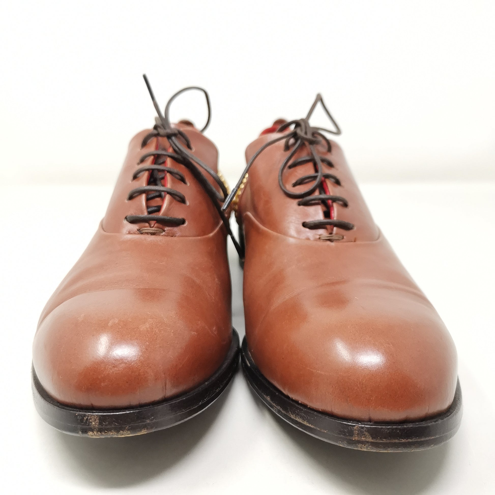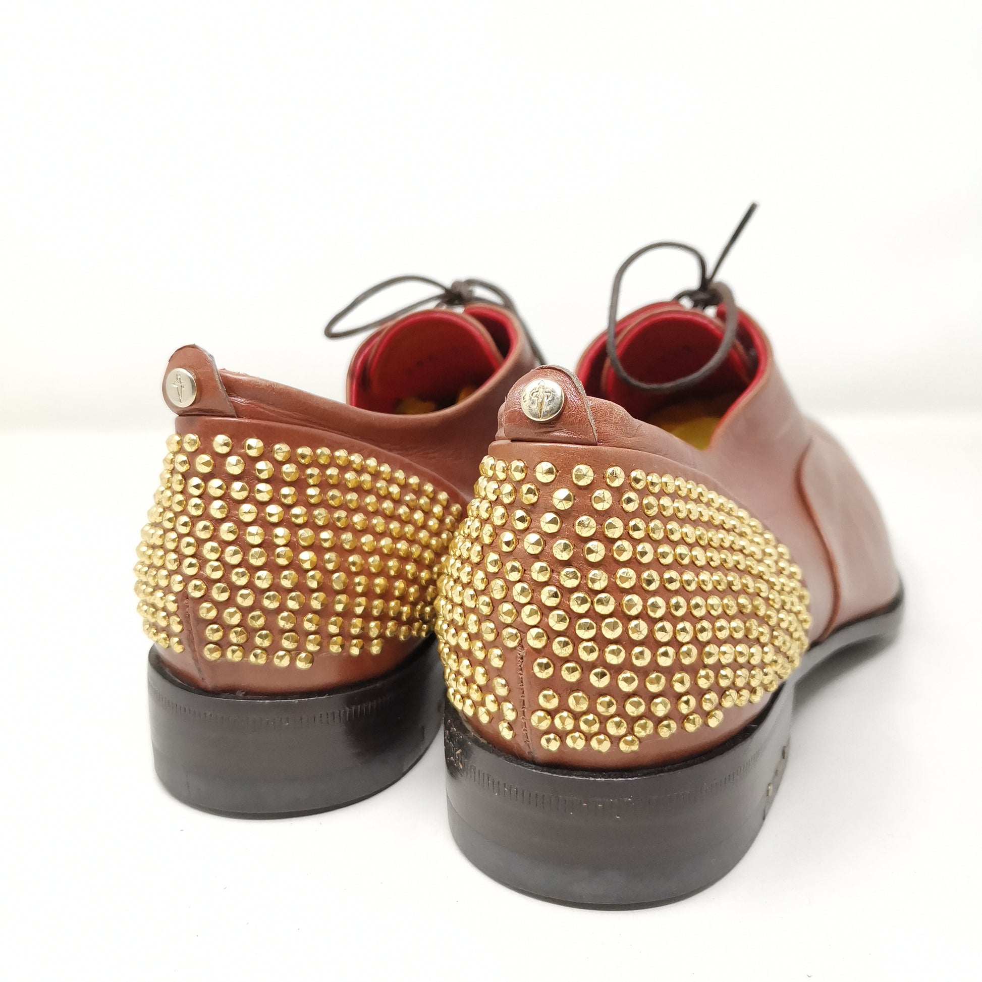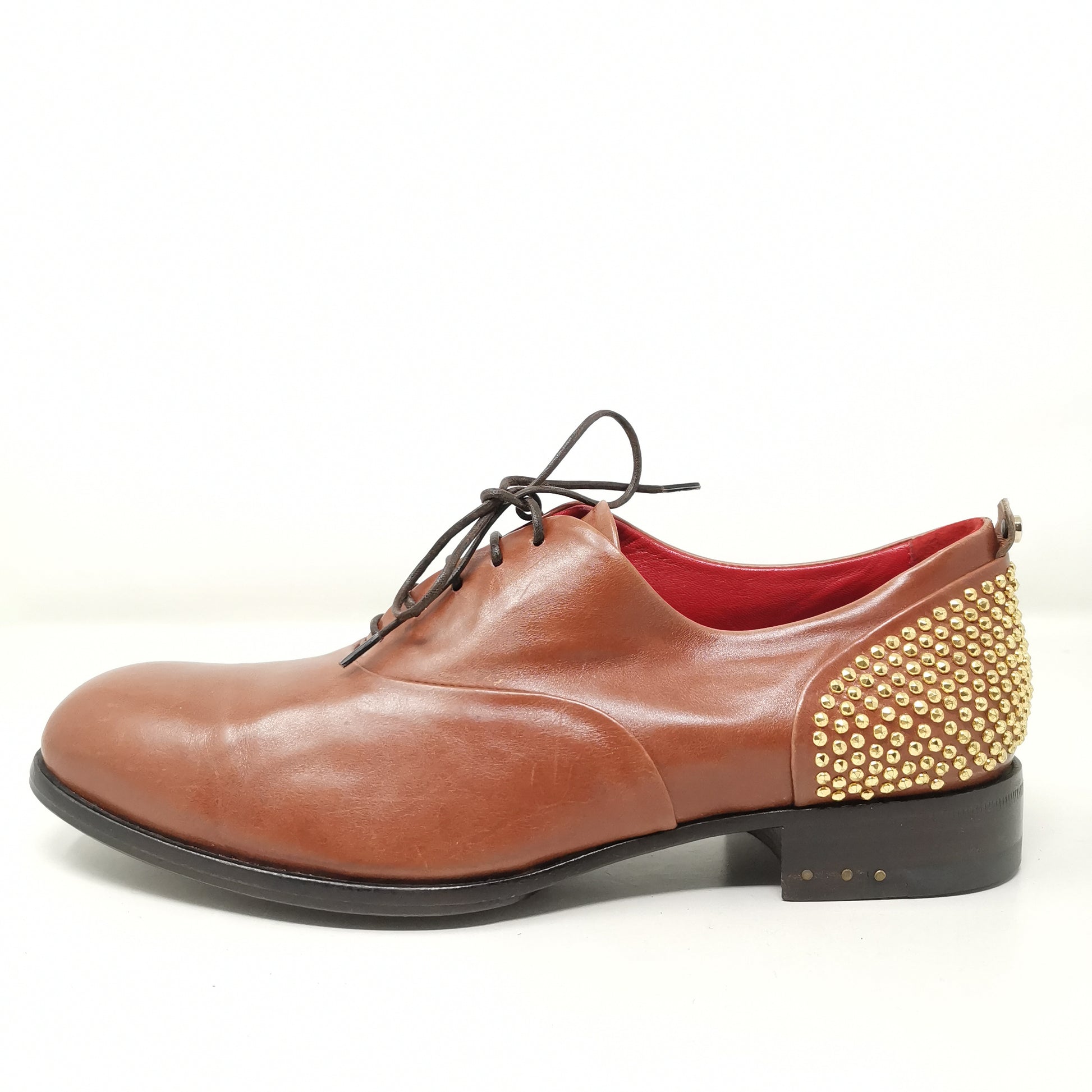 Light brown leather lace-up shoes with 2 cm high heel, leather insole and leather outsole, small gold studs on the heel area. A few small marks on the soles and toes, very soft leather, the inside of the sole measures 24cm. Size 37 EU.