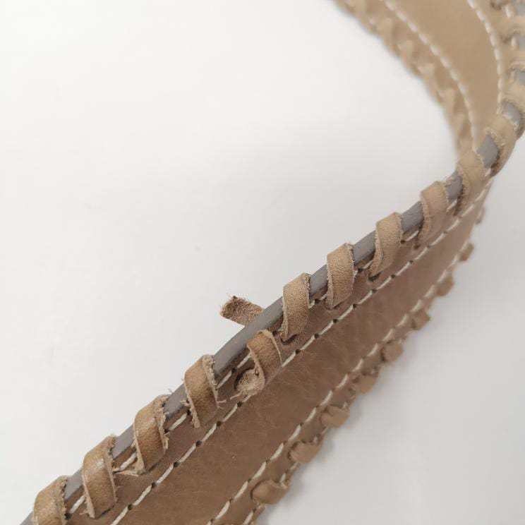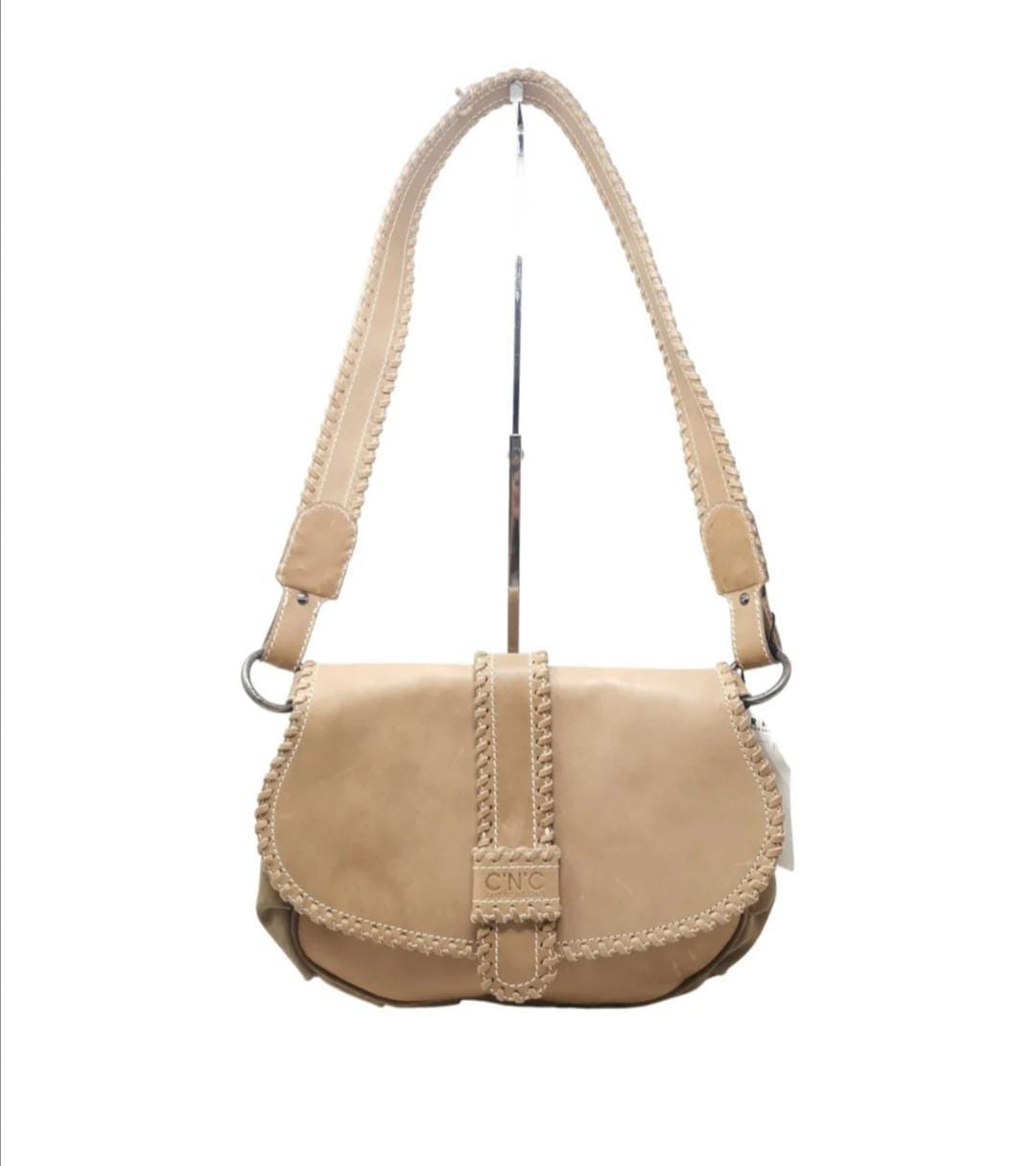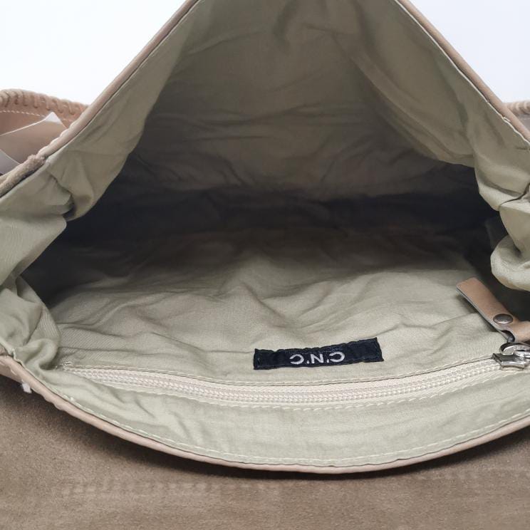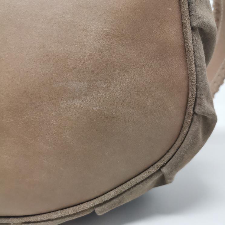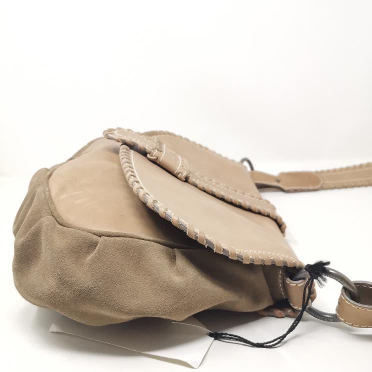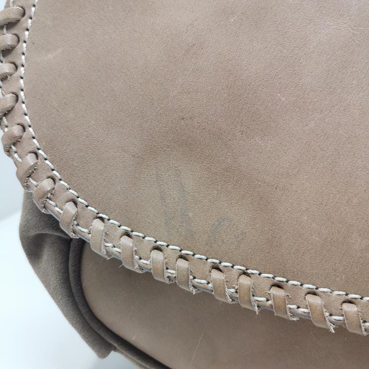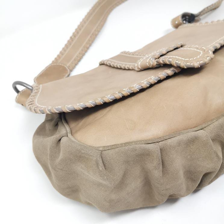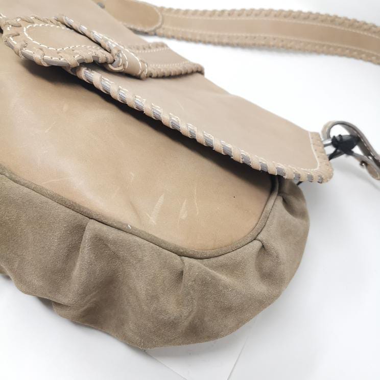 Beige leather and suede bag with shoulder strap.