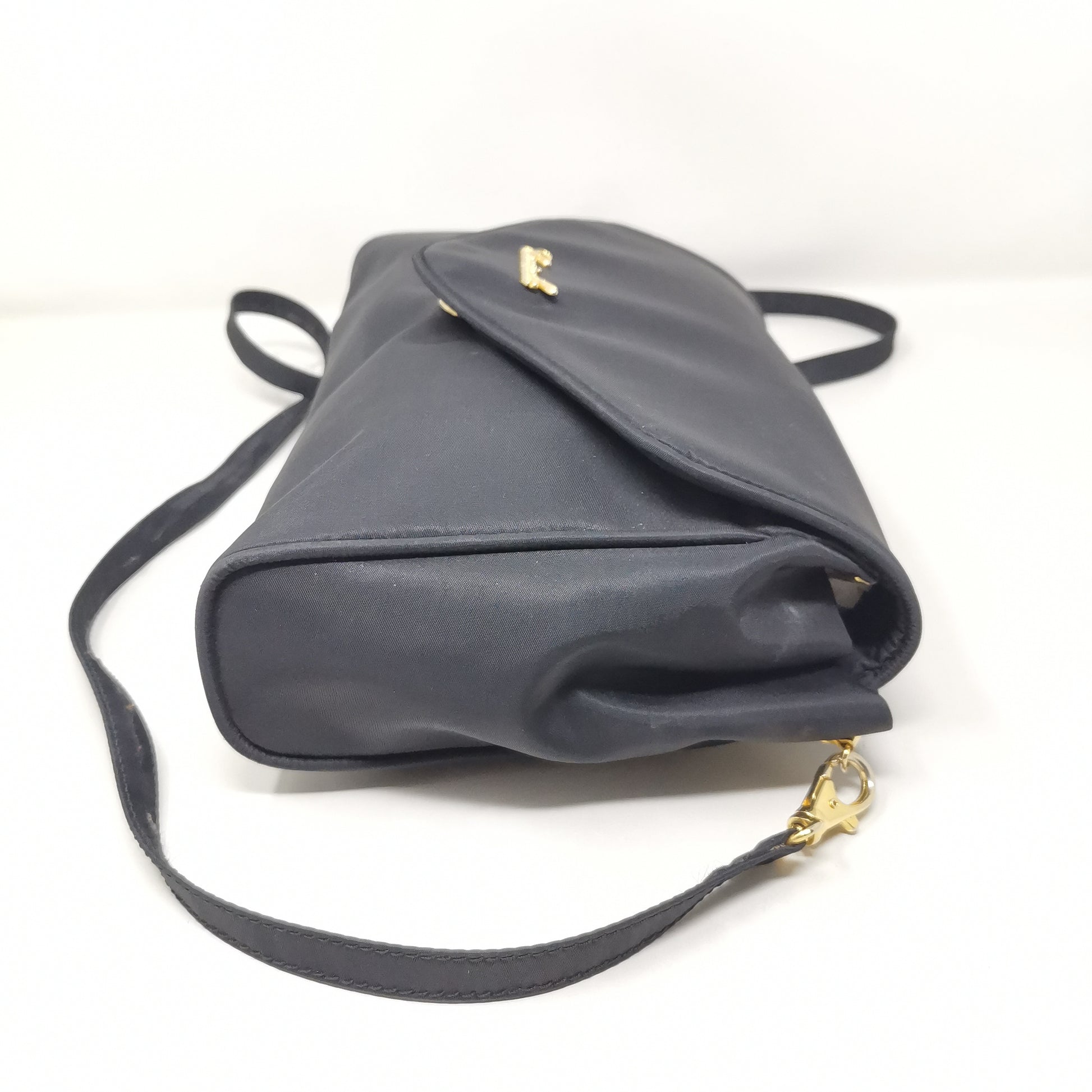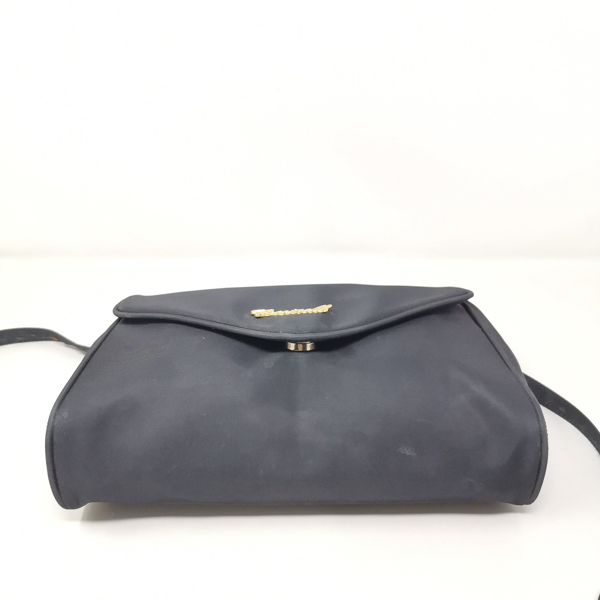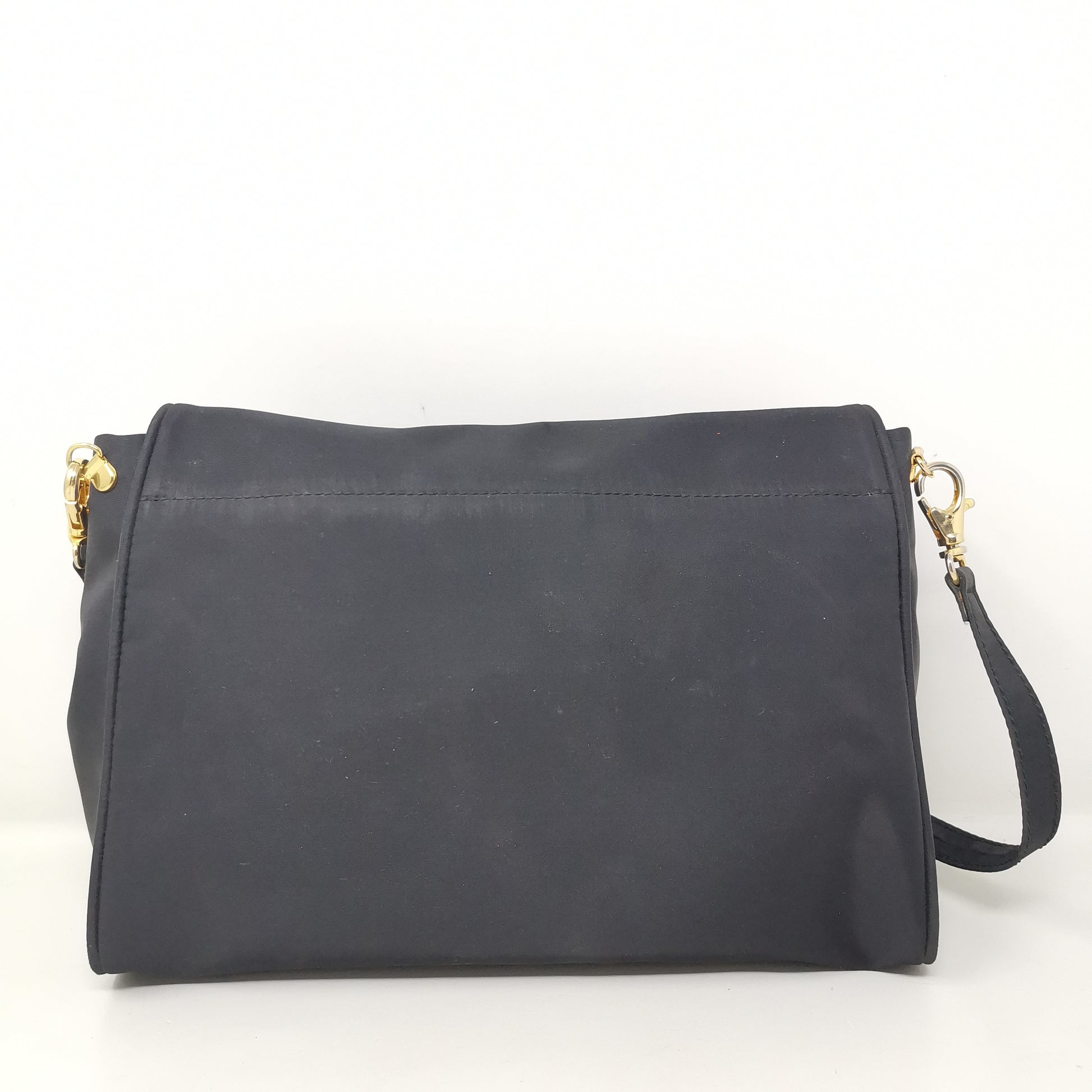 Crossbody bag in black synthetic with removable shoulder strap, opening with internal metal and leather button. Gold colored hardware, some small halos and marks on the corners. Width 26cm, height 19cm, depth 6cm. The shoulder strap is 120 cm long.