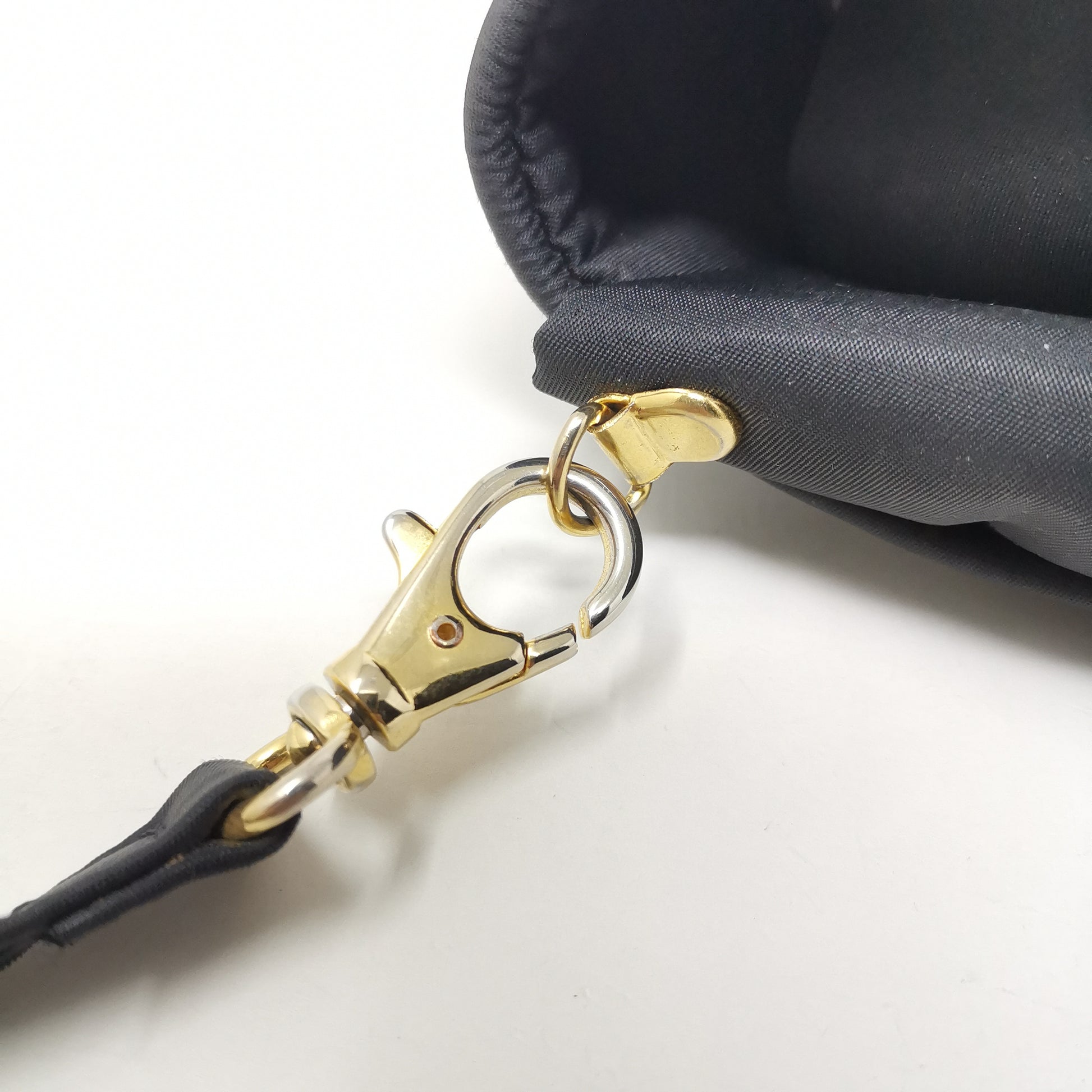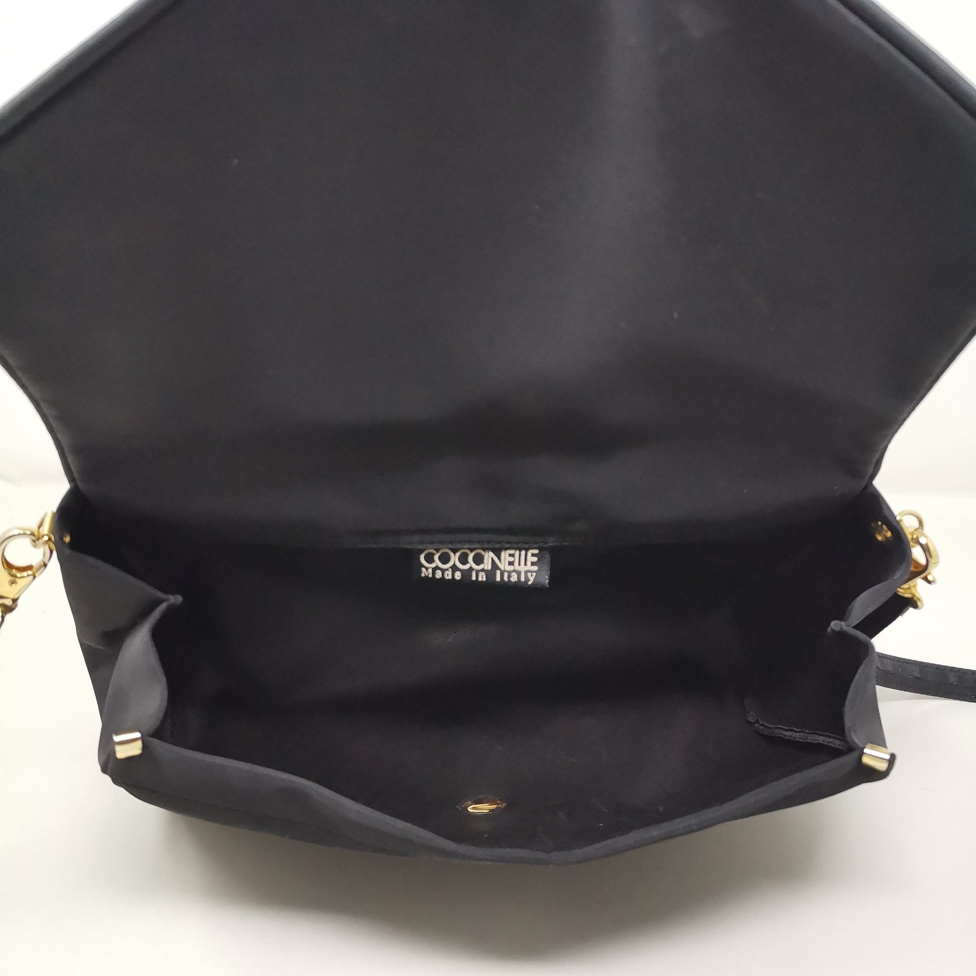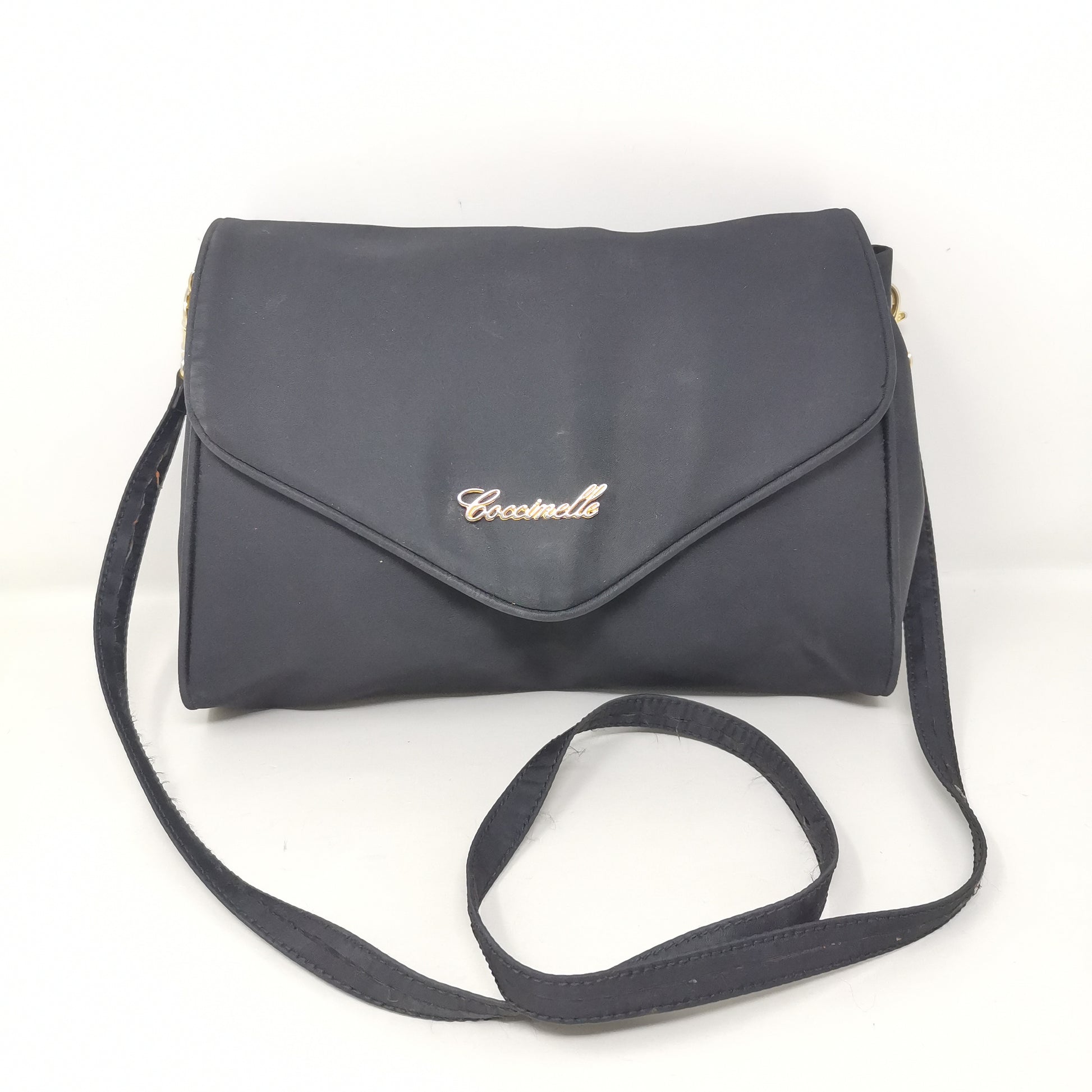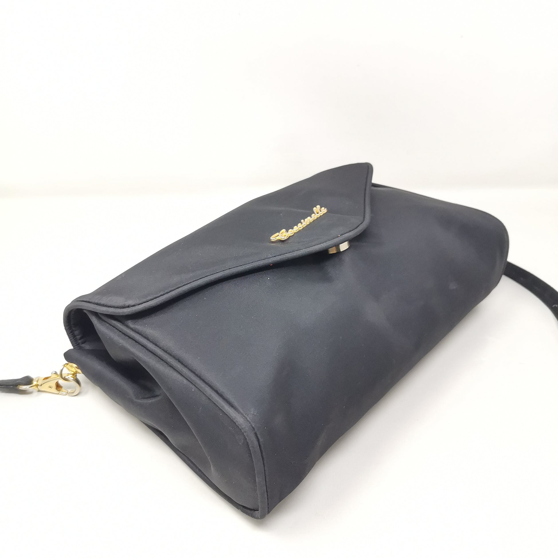 Crossbody bag in black synthetic with removable shoulder strap, opening with internal metal and leather button. Gold colored hardware, some small halos and marks on the corners. Width 26cm, height 19cm, depth 6cm. The shoulder strap is 120 cm long.