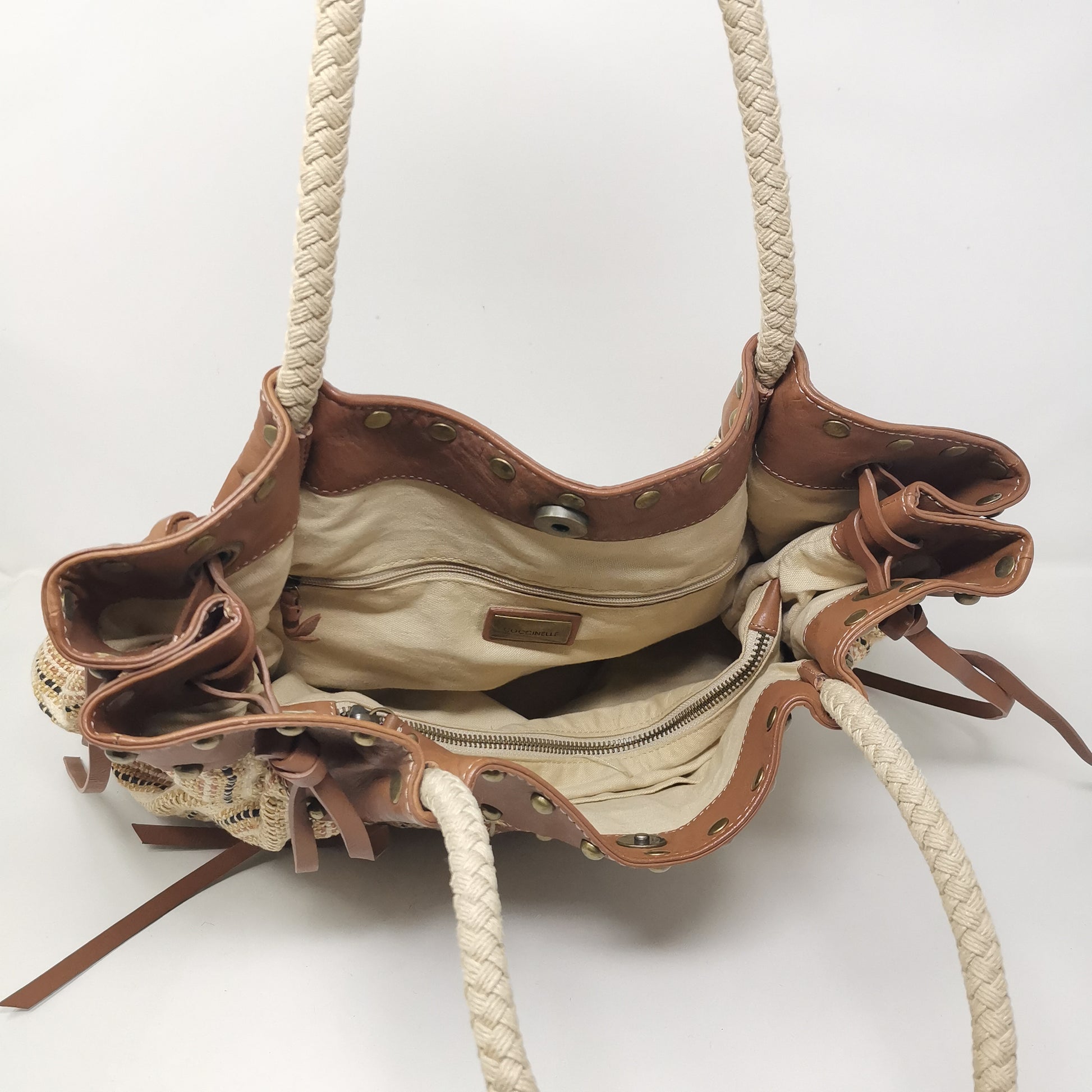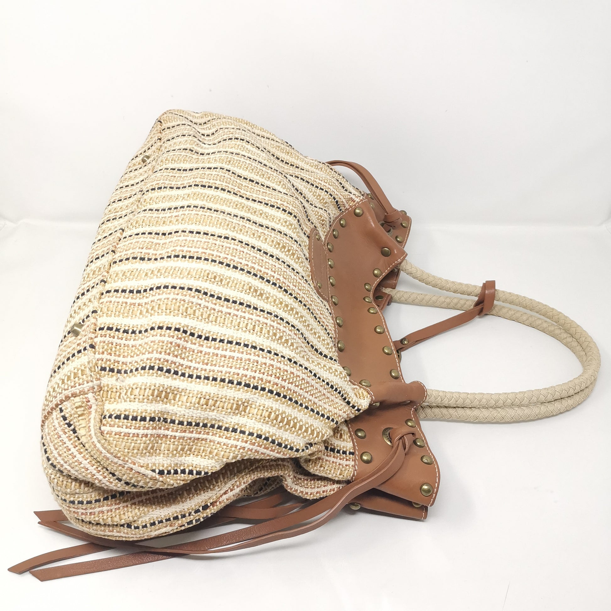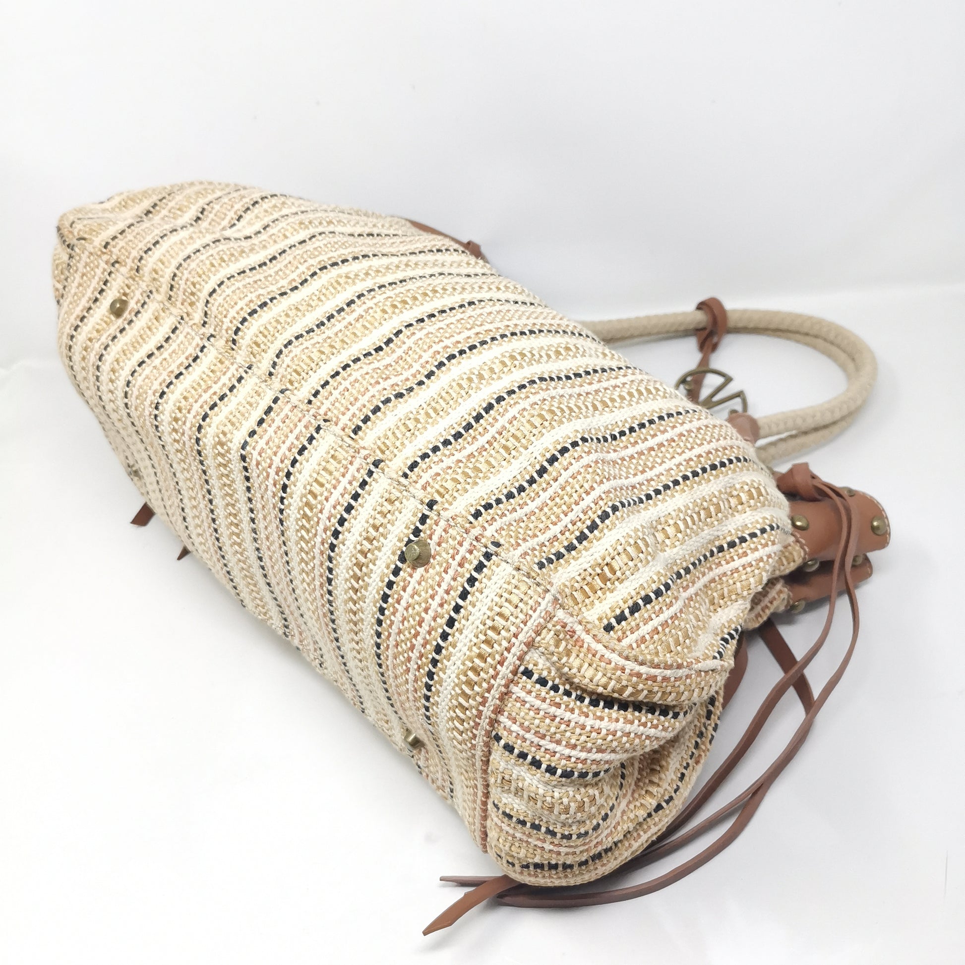 Beige canvas and brown leather bag with double rope handles, metal button closure and interior with two compartments and lining with pockets.