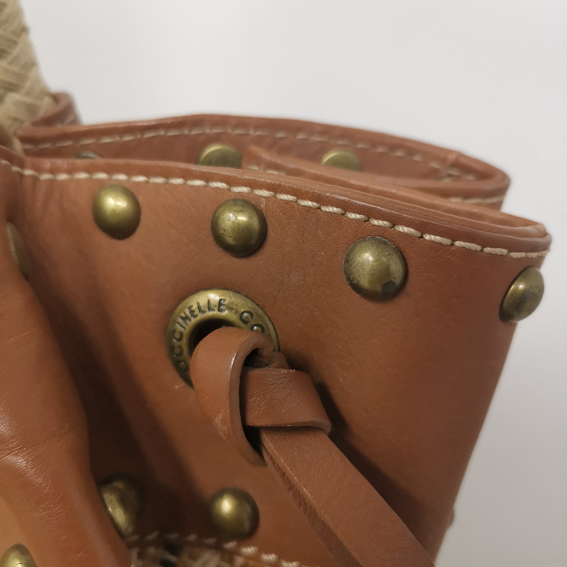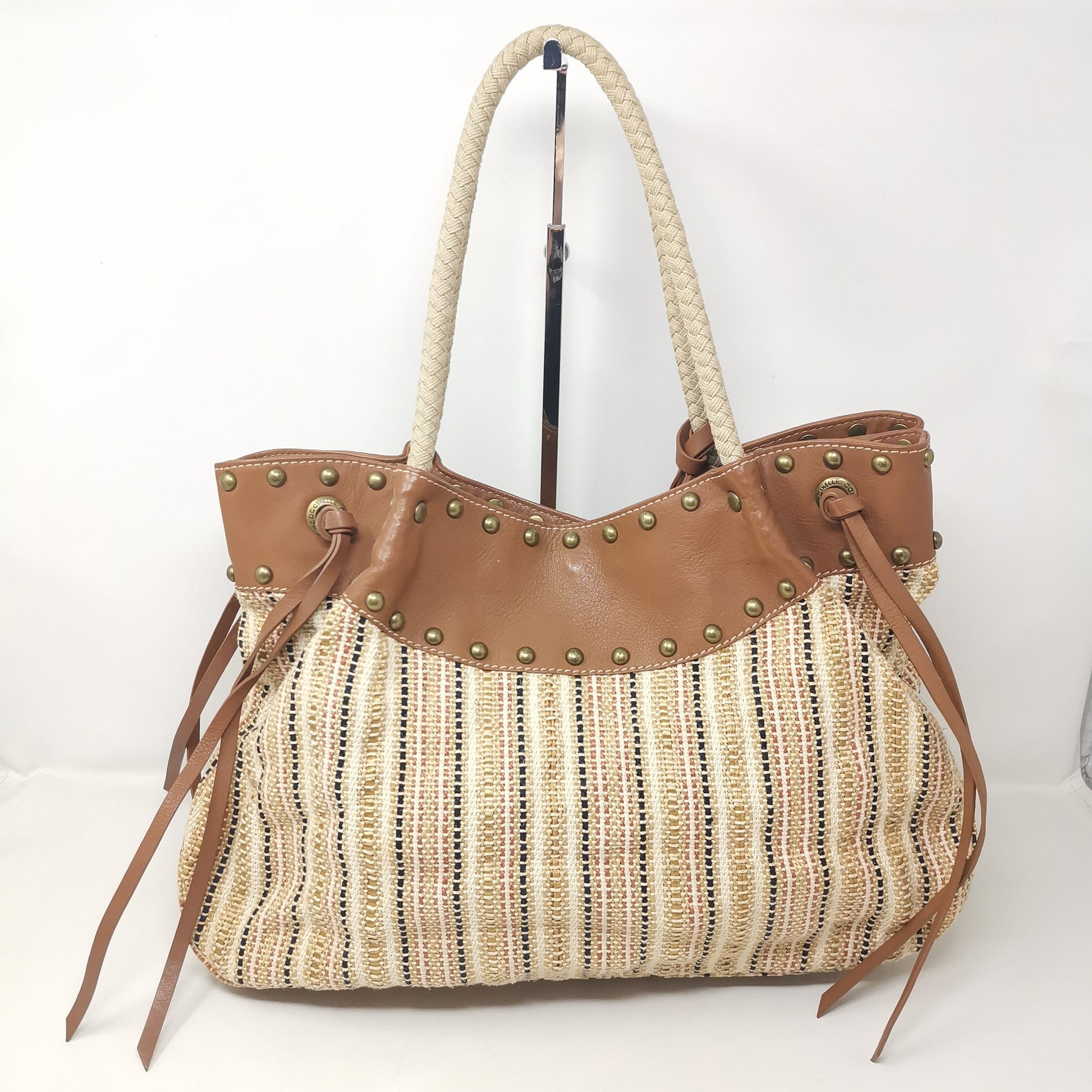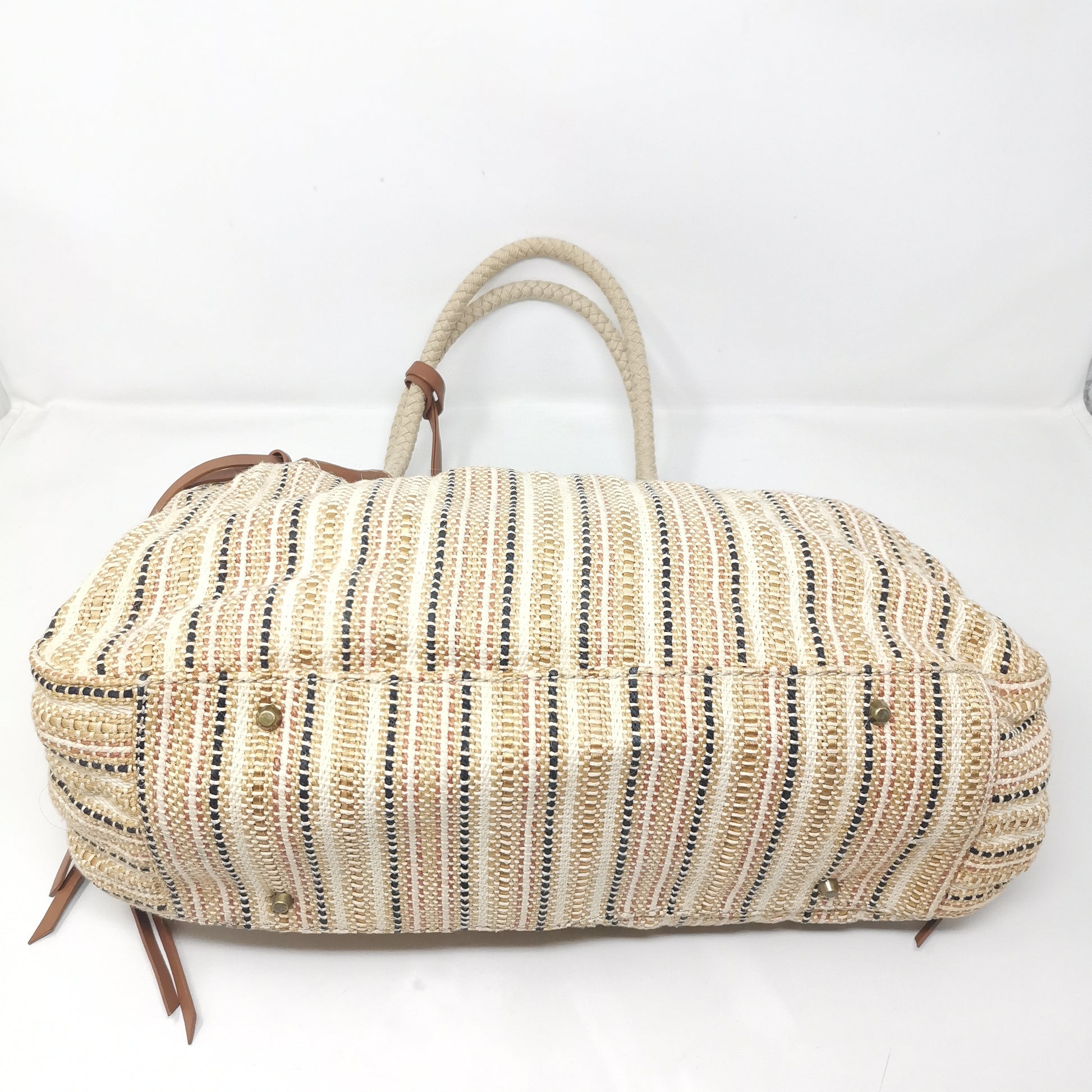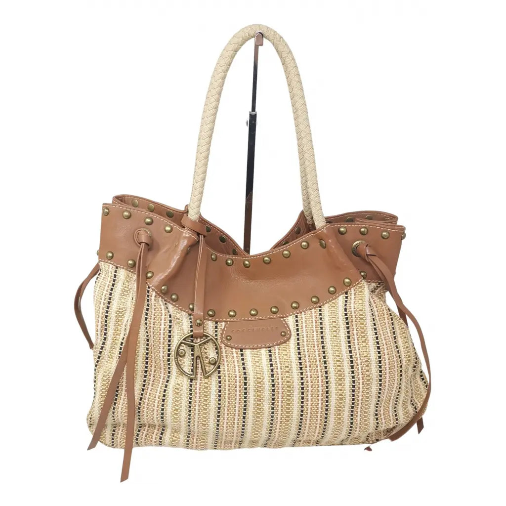 Beige canvas and brown leather bag with double rope handles, metal button closure and interior with two compartments and lining with pockets.