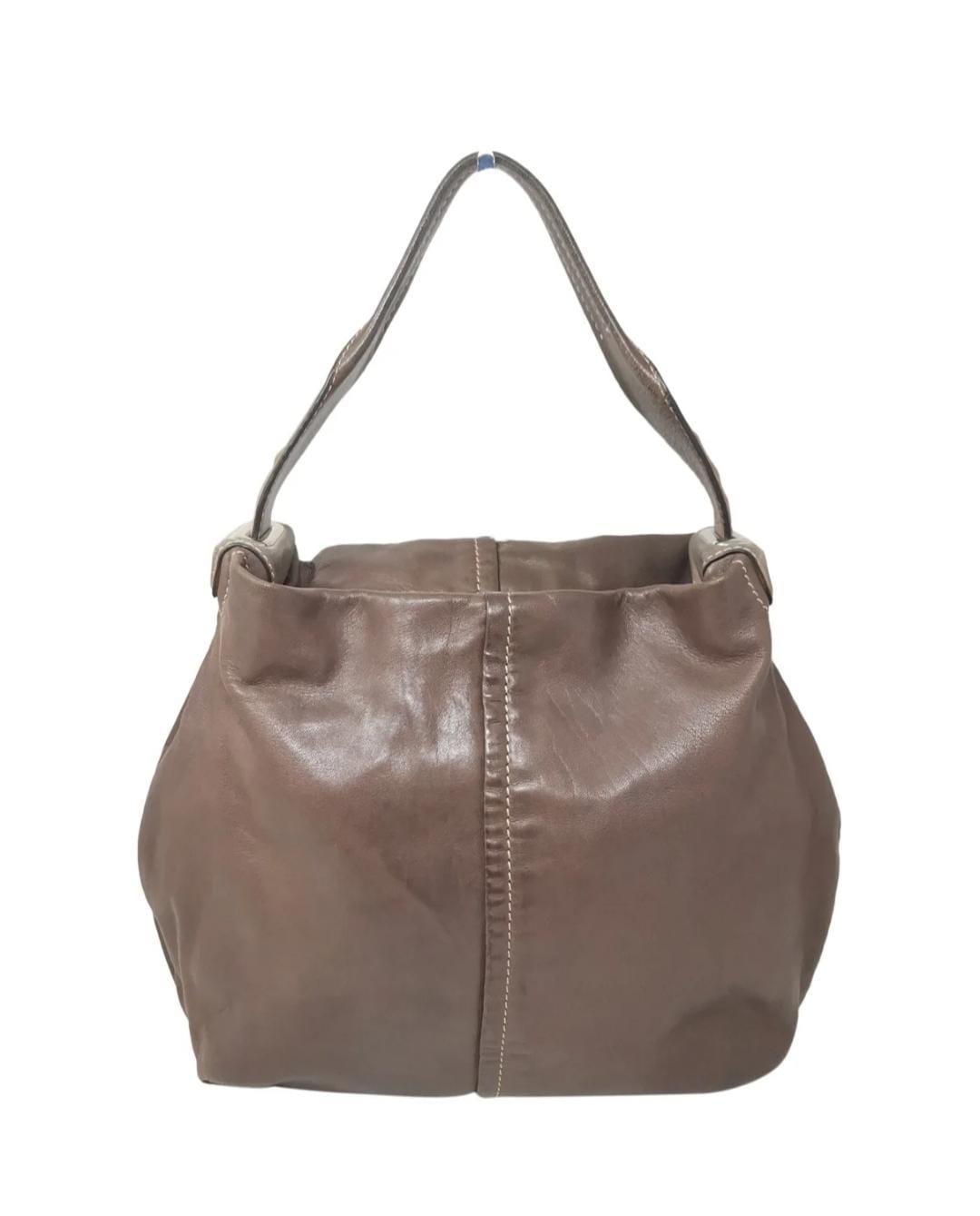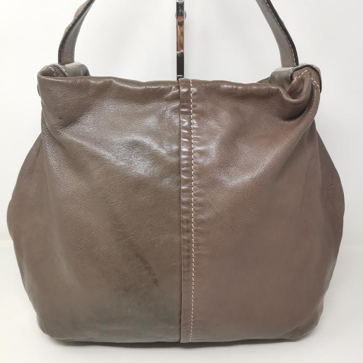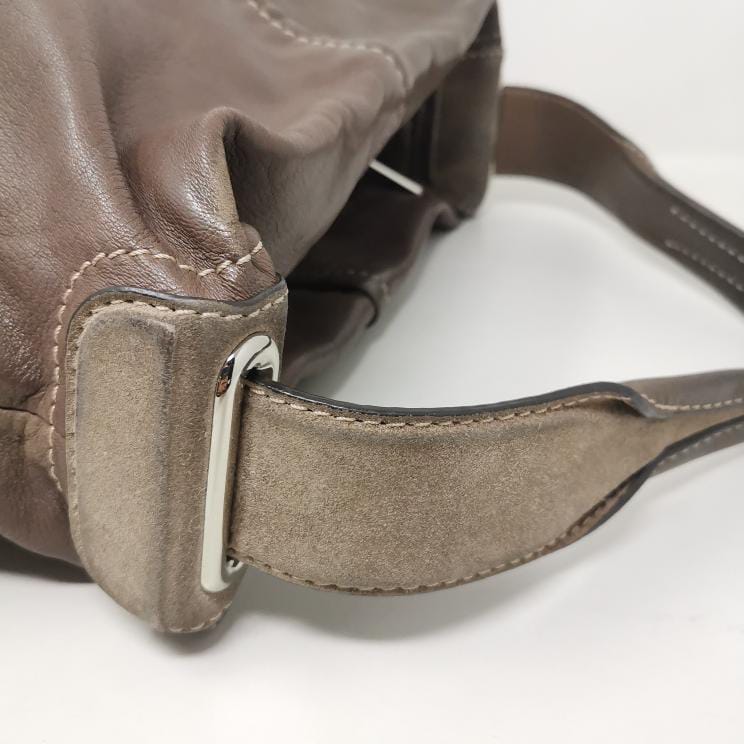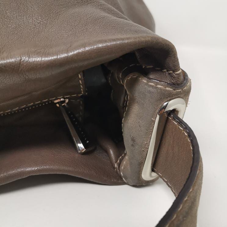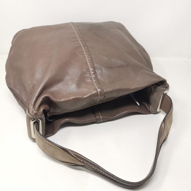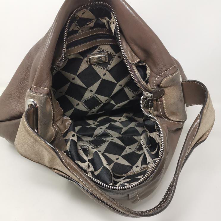 Brown leather shoulder bag with beige suede and leather single handle, zip opening and fabric interior with pocket. White contrast stitching, silver-coloured metal hardware. Some marks and haloes on the leather part, bottom and suede with signs of wear.