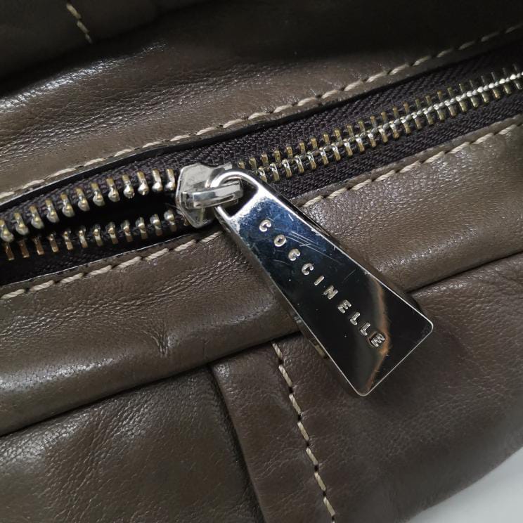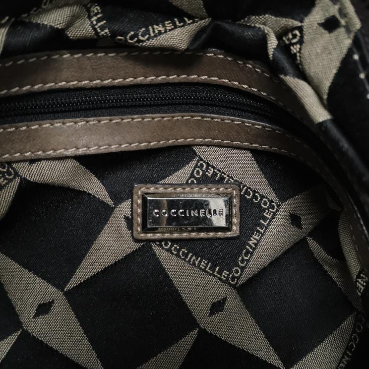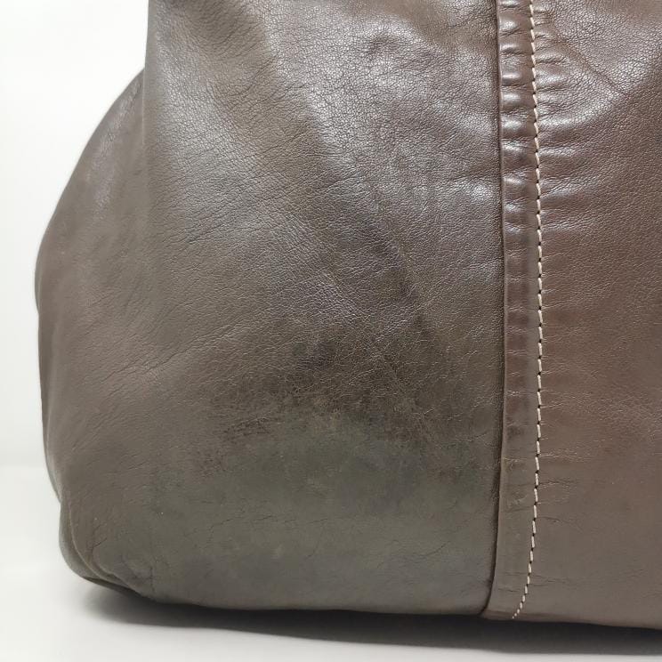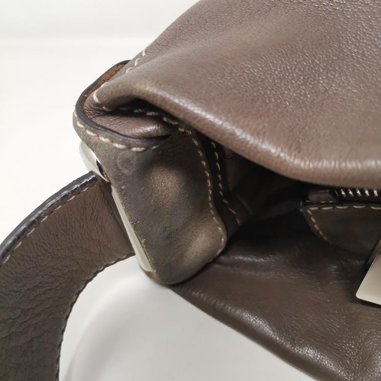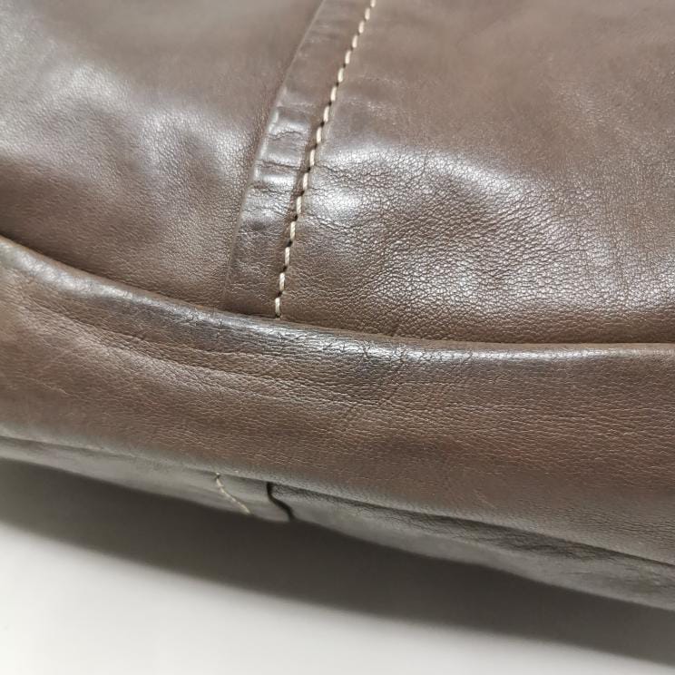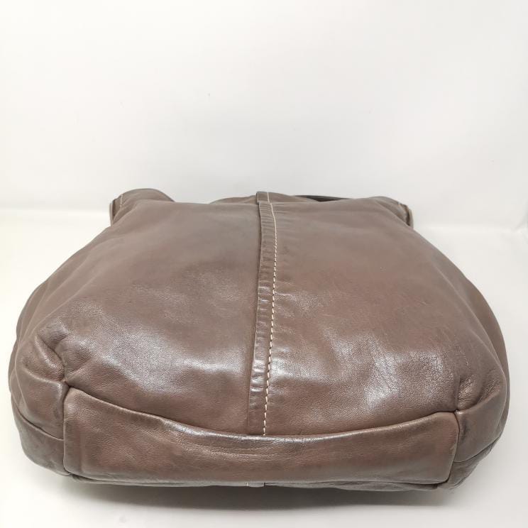 Brown leather shoulder bag with beige suede and leather single handle, zip opening and fabric interior with pocket. White contrast stitching, silver-coloured metal hardware. Some marks and haloes on the leather part, bottom and suede with signs of wear.