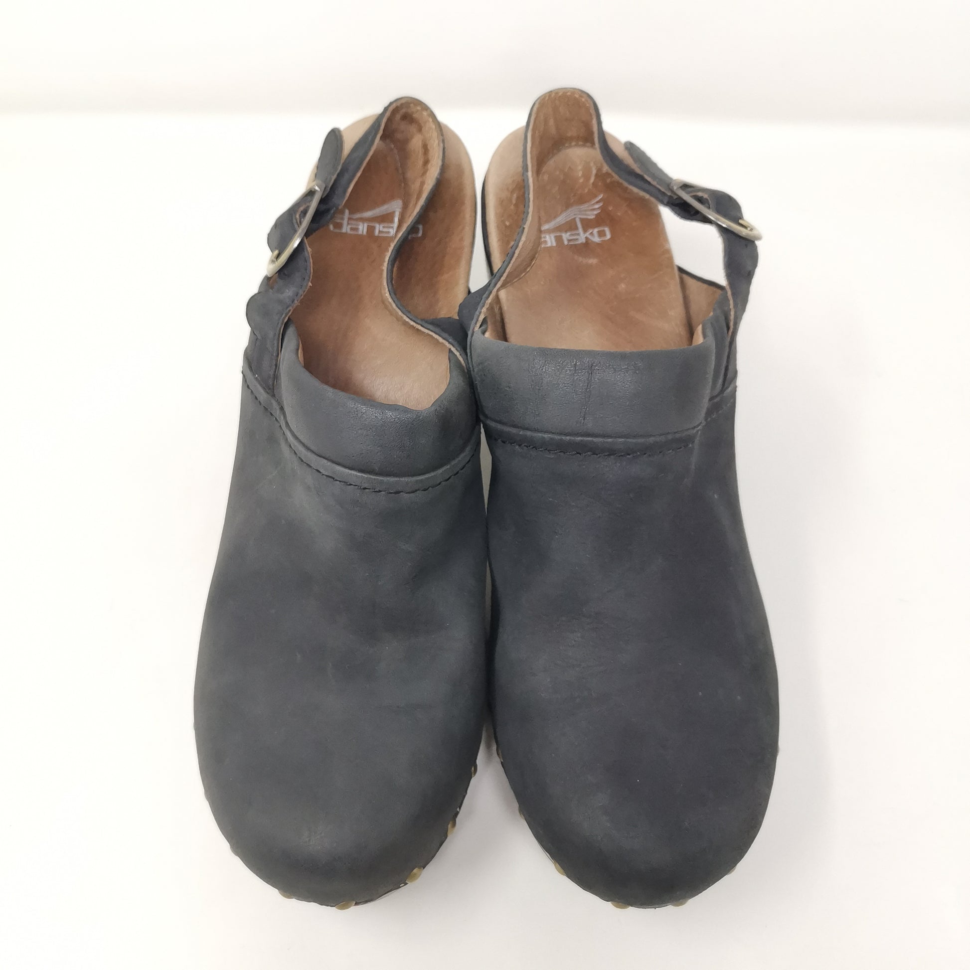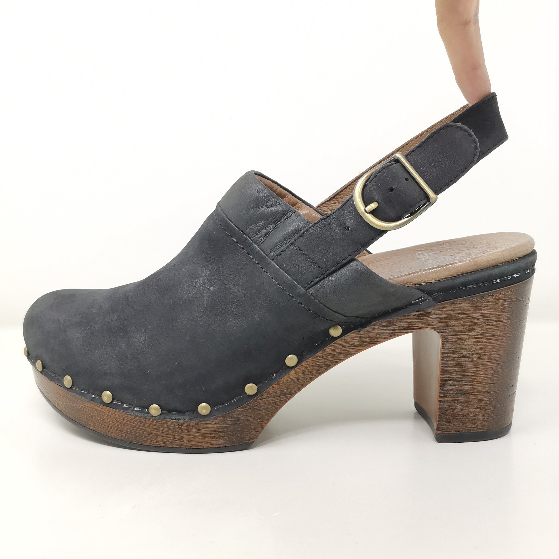 Clogs in black suede with adjustable strap, 8 cm high heel and 3 cm platform. The leather insole measures 27 cm, rubber outer sole, some small marks on the suede part and insoles.