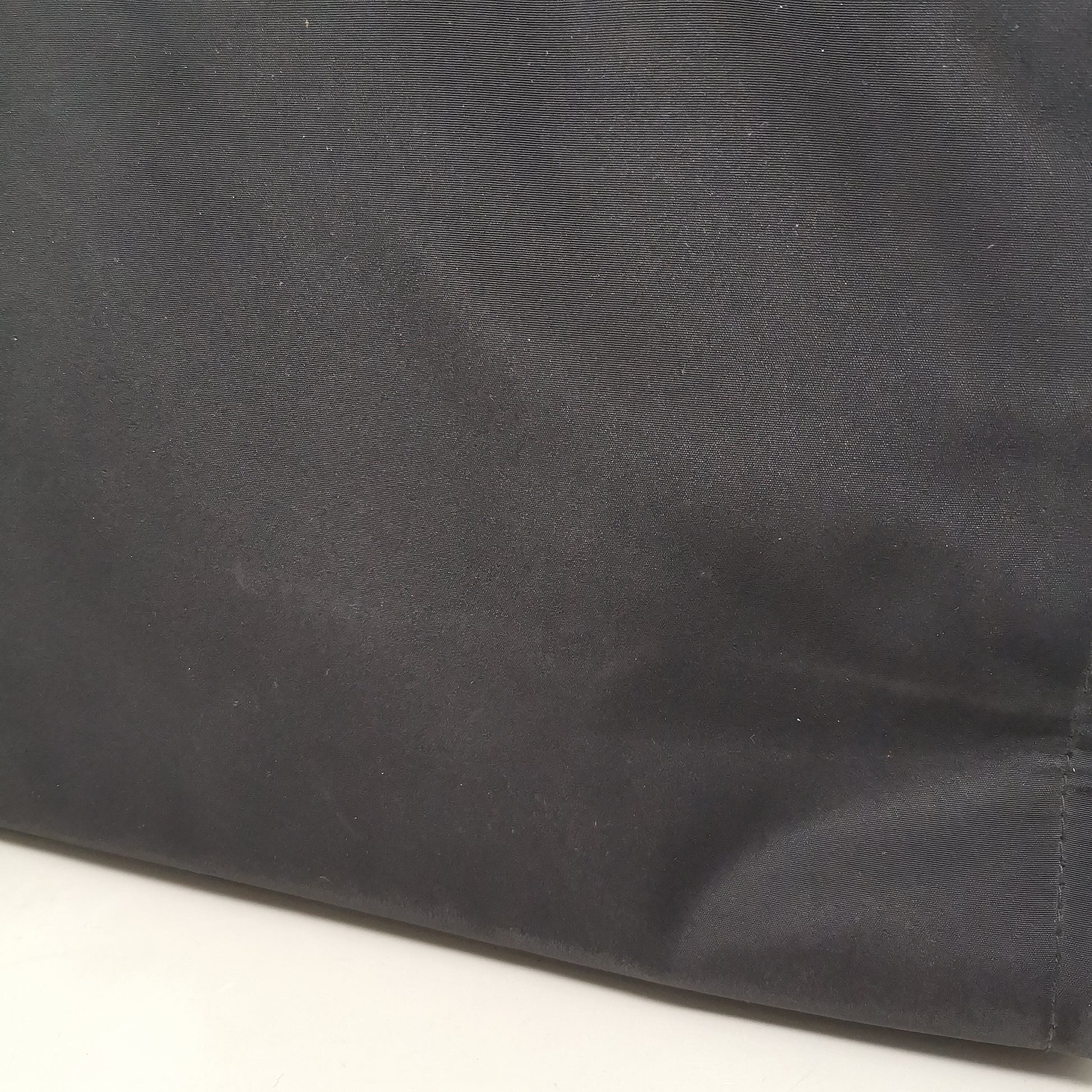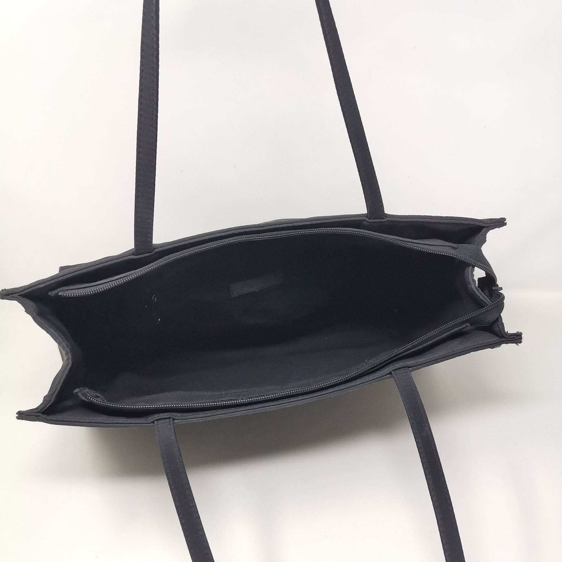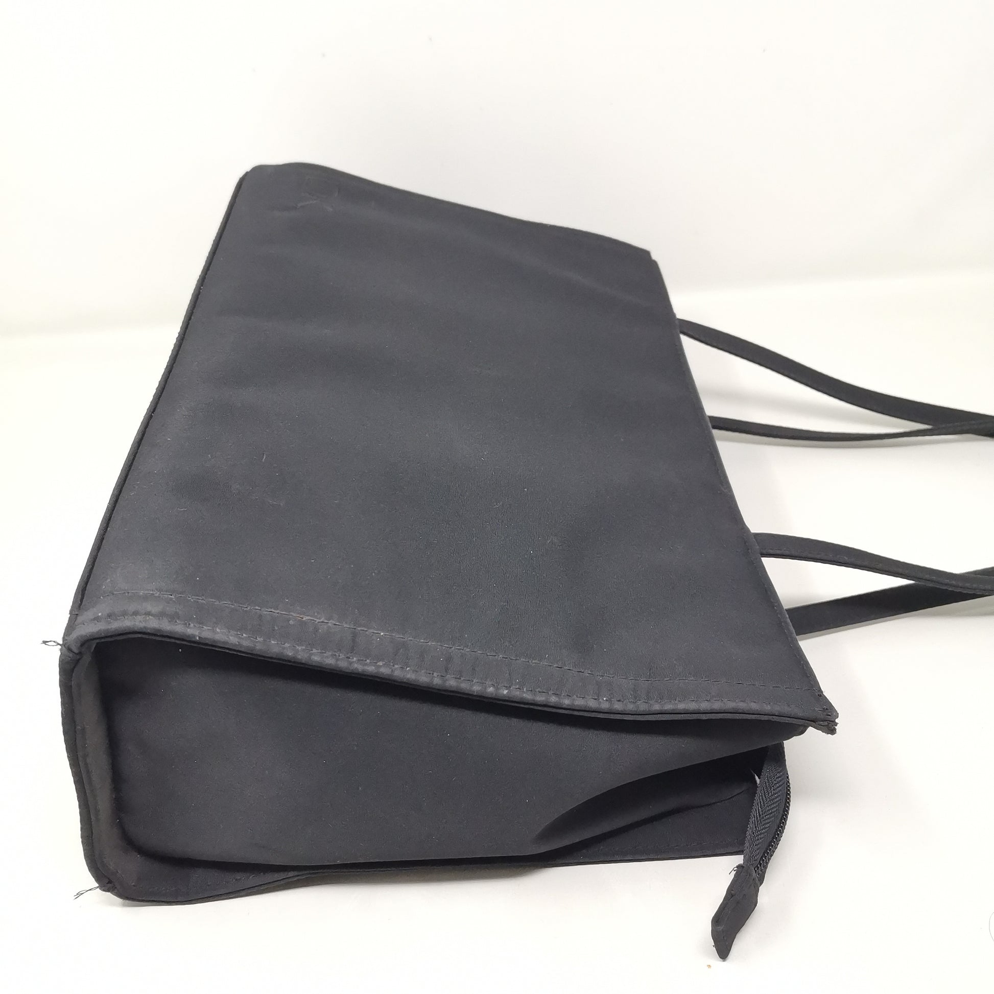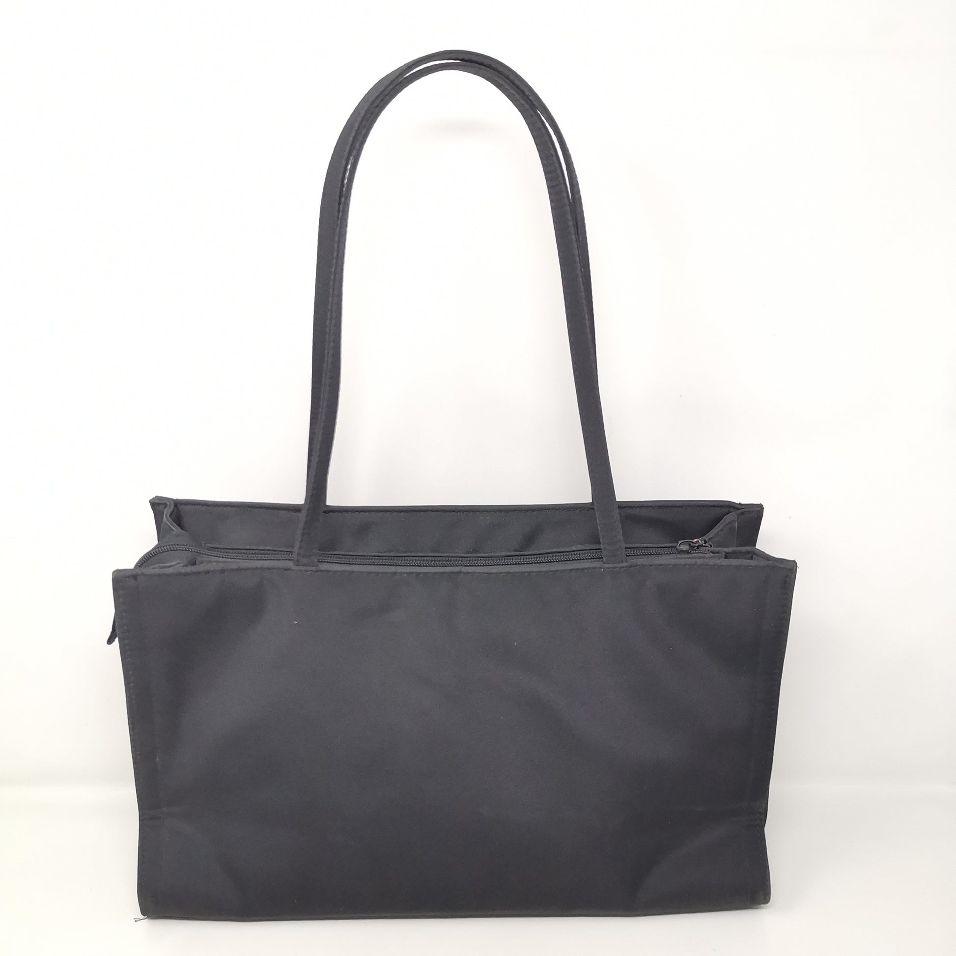 Black synthetic fabric bag with double handles, zip opening and fabric interior with pocket. Comfortable to carry even on the shoulder, with some small marks. Width 36.5cm, height 23cm, depth 12cm, handle height 25cm.