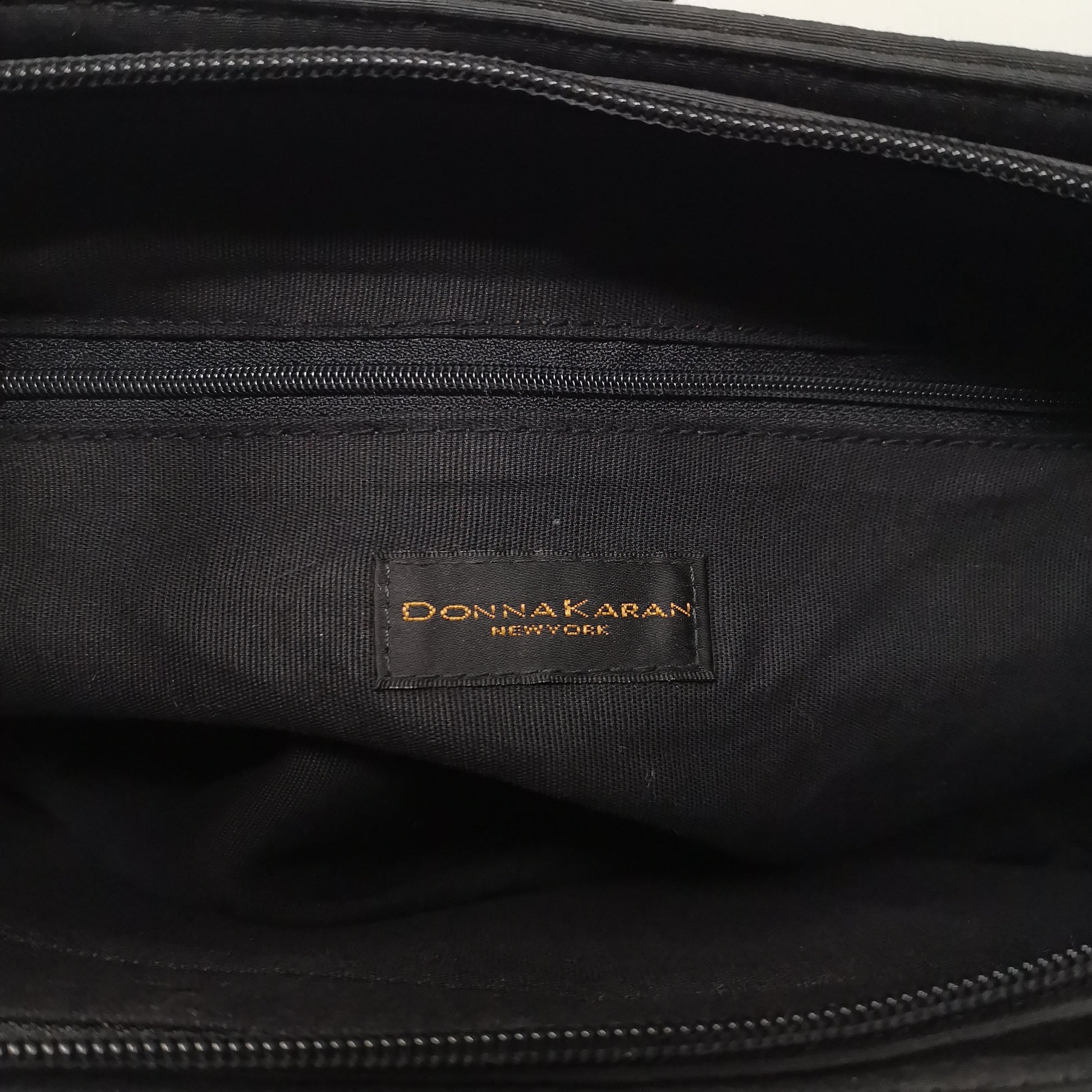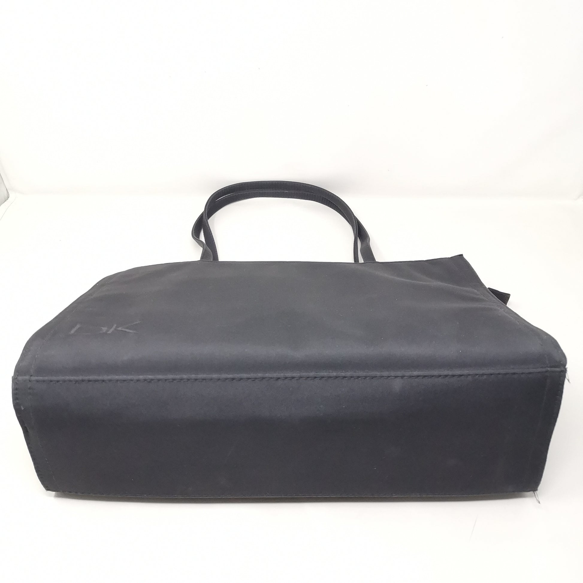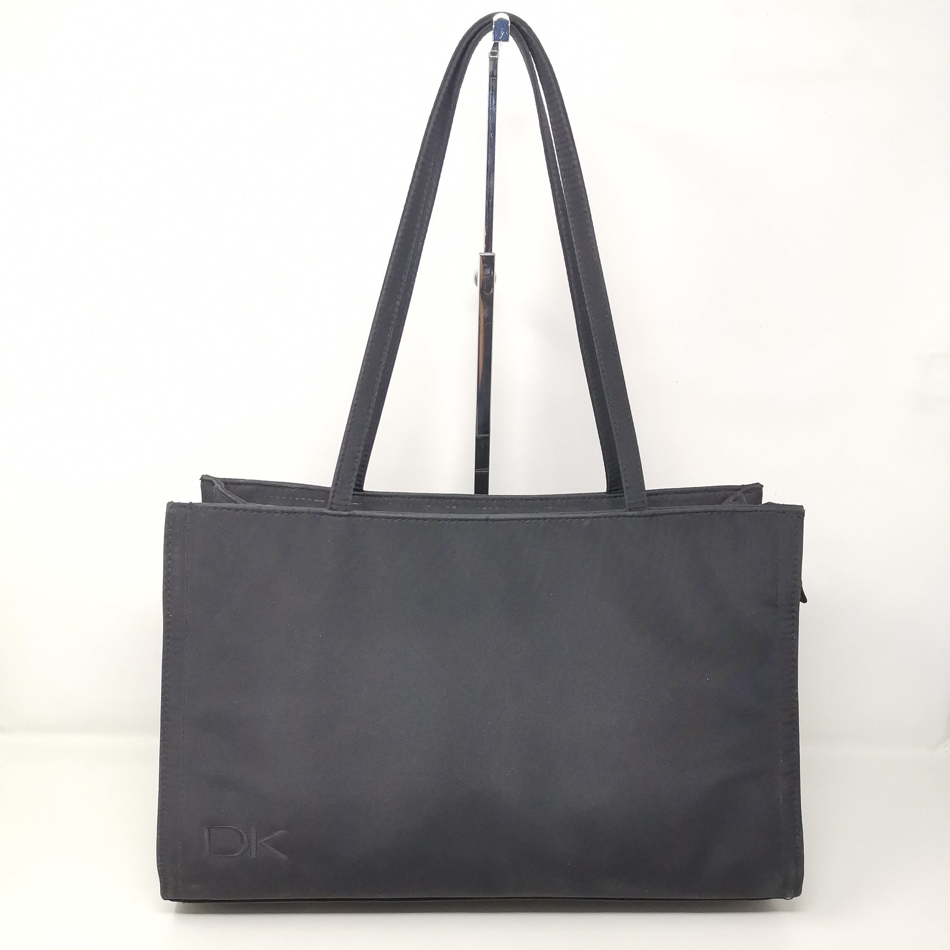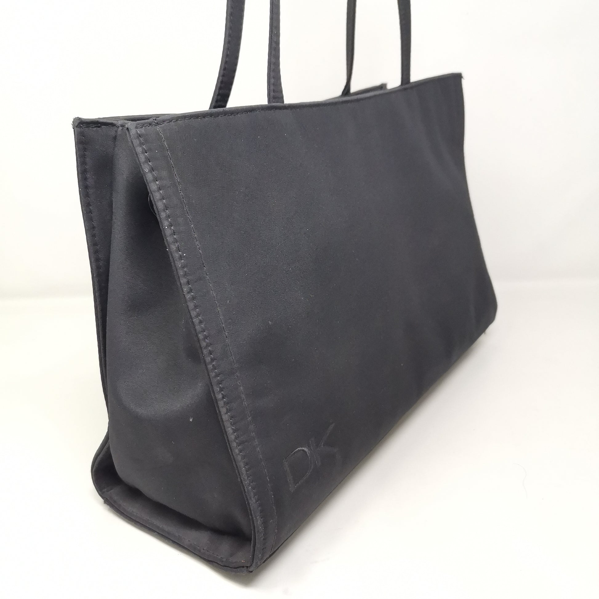 Black synthetic fabric bag with double handles, zip opening and fabric interior with pocket. Comfortable to carry even on the shoulder, with some small marks. Width 36.5cm, height 23cm, depth 12cm, handle height 25cm.