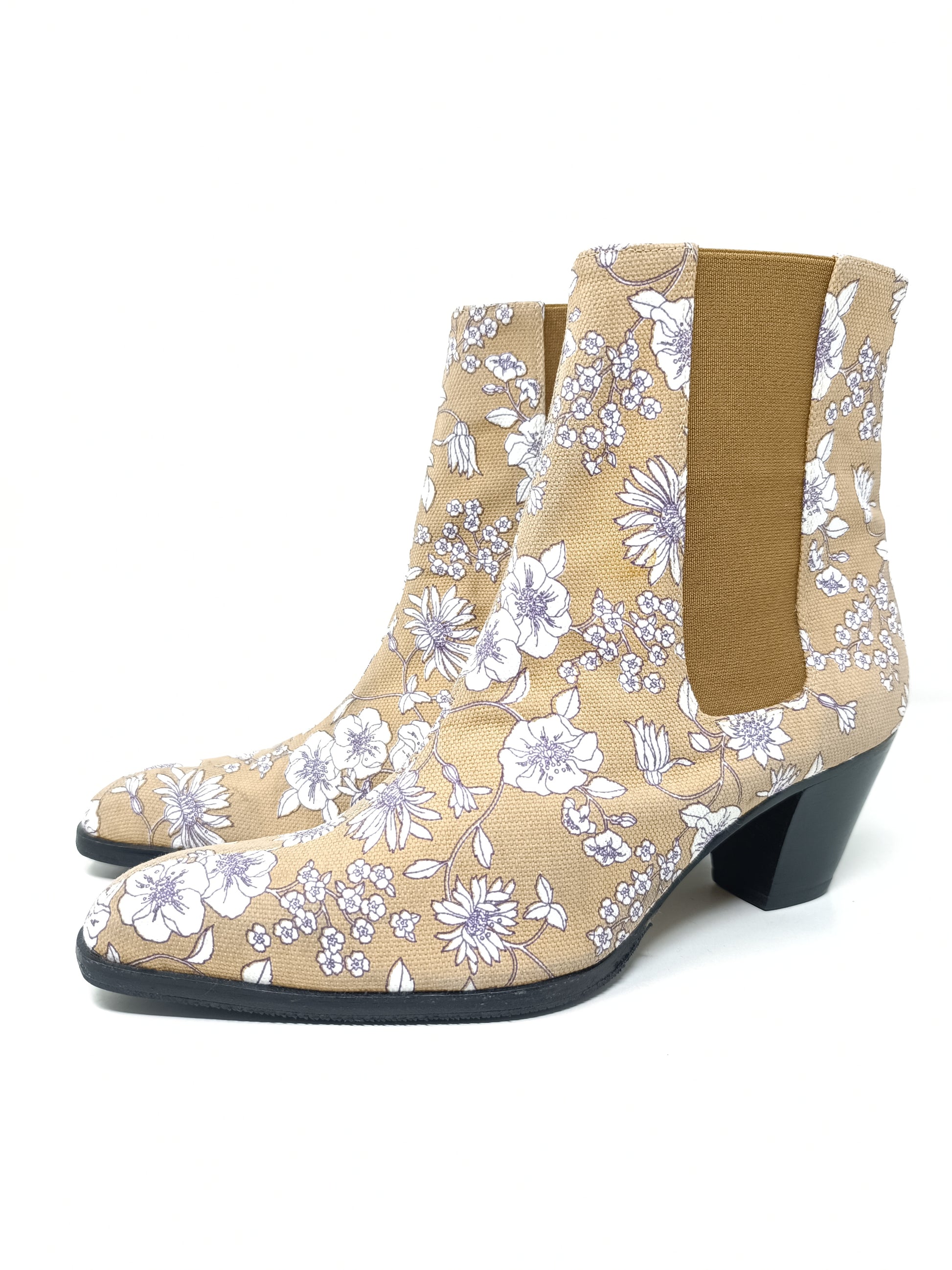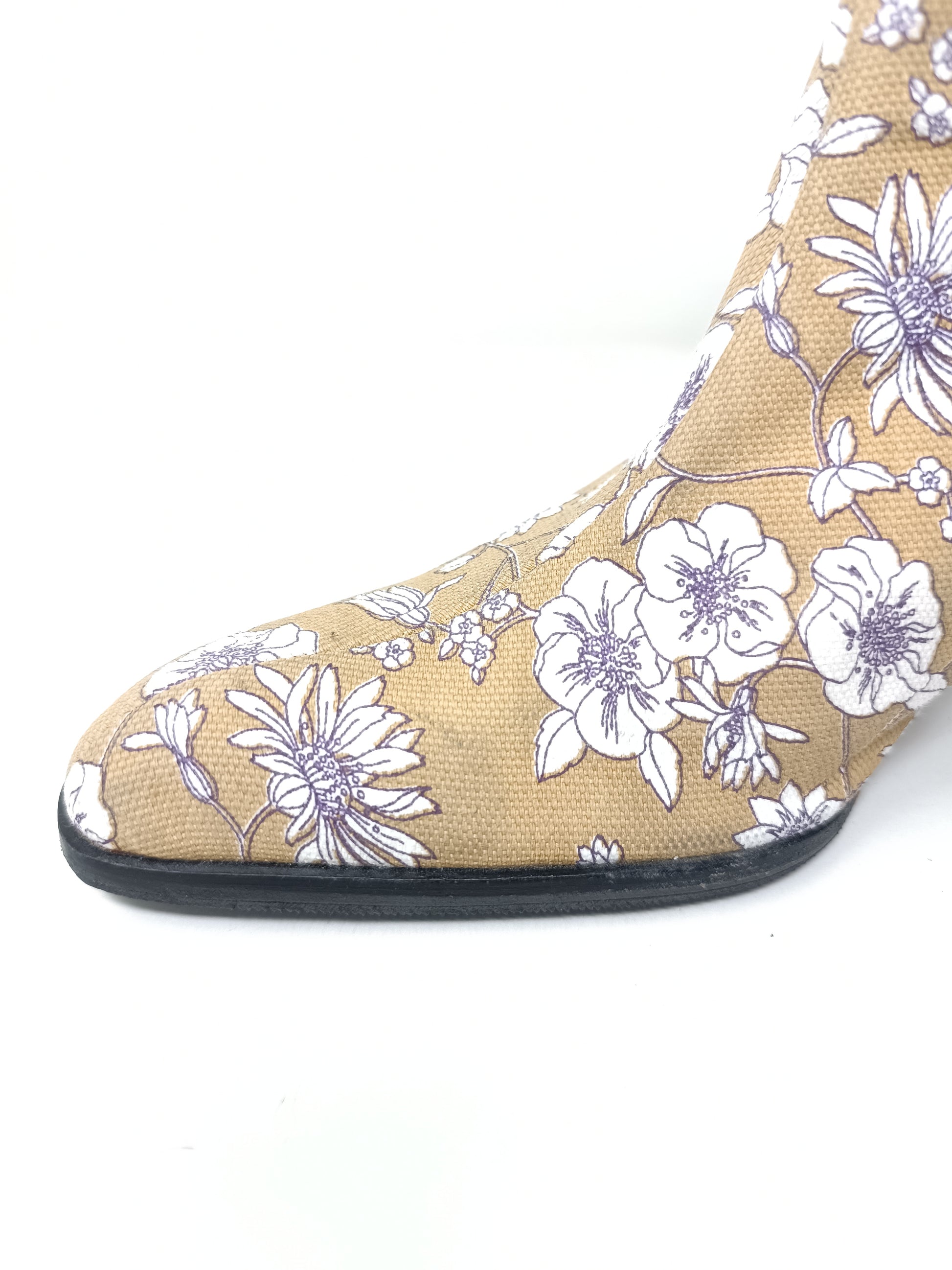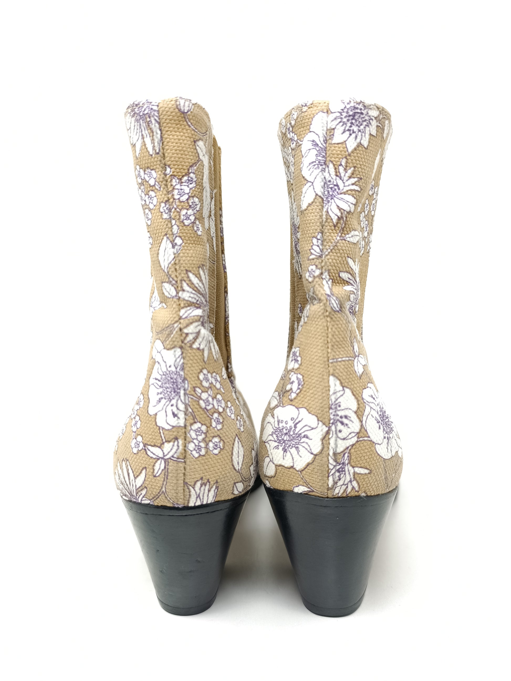 DPV Texan boots in beige, white and lilac floral patterned canvas. Gold-colored leather interior, 6.5 cm high heel, side elastic bands. Outer sole in leather covered in vibram rubber. A little halo. Never used, size 38 EU.