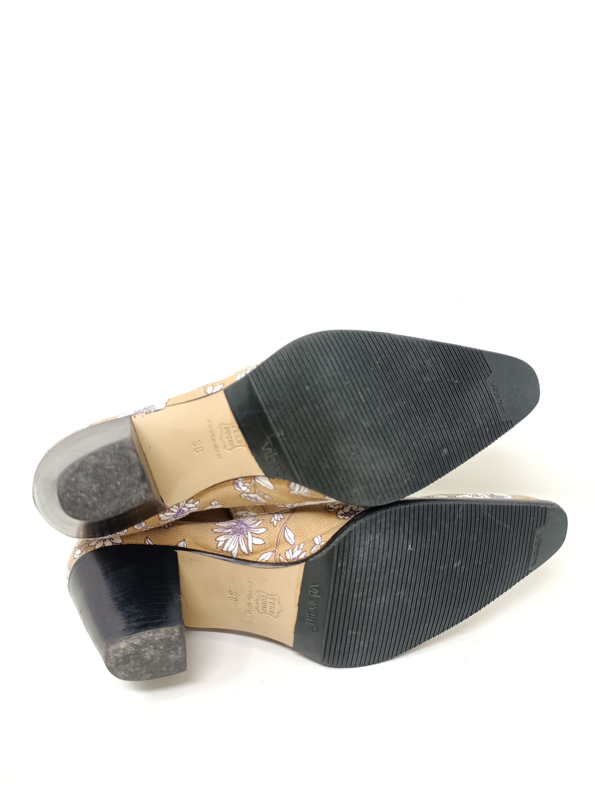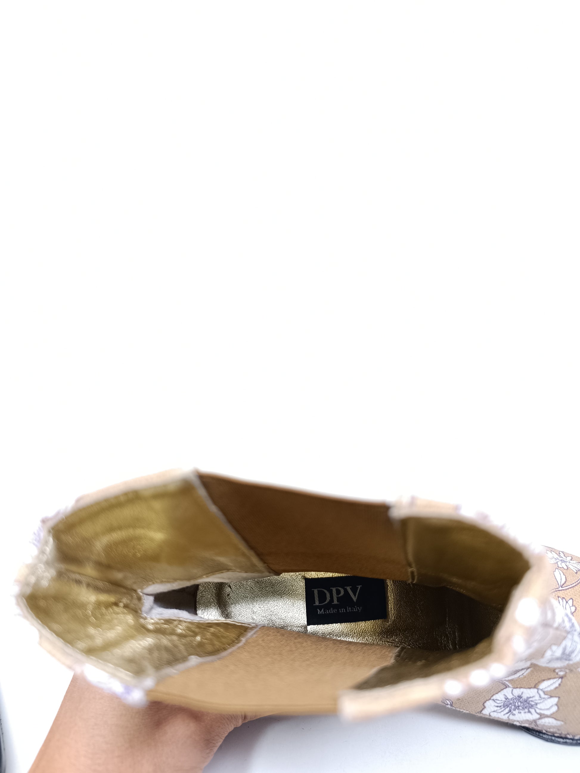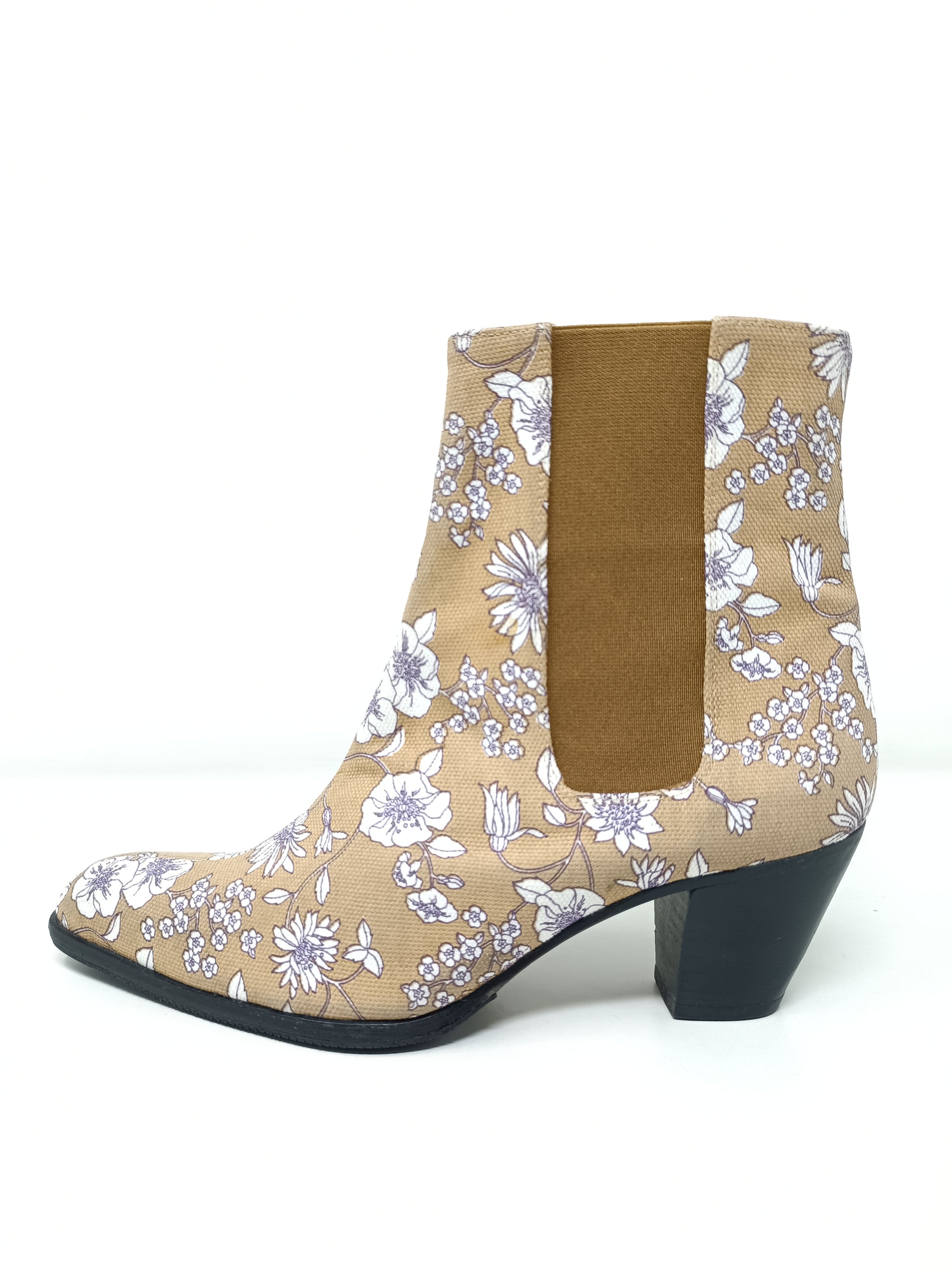 DPV Texan boots in beige, white and lilac floral patterned canvas. Gold-colored leather interior, 6.5 cm high heel, side elastic bands. Outer sole in leather covered in vibram rubber. A little halo. Never used, size 38 EU.