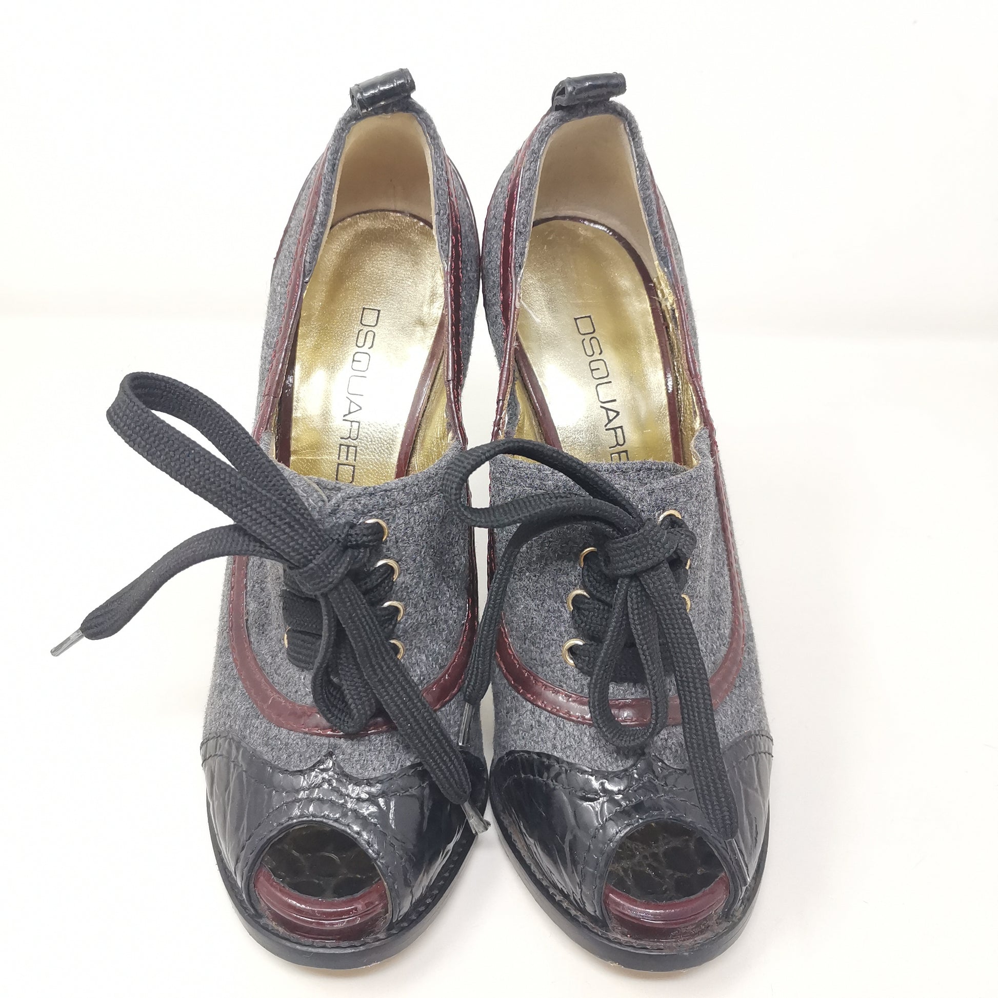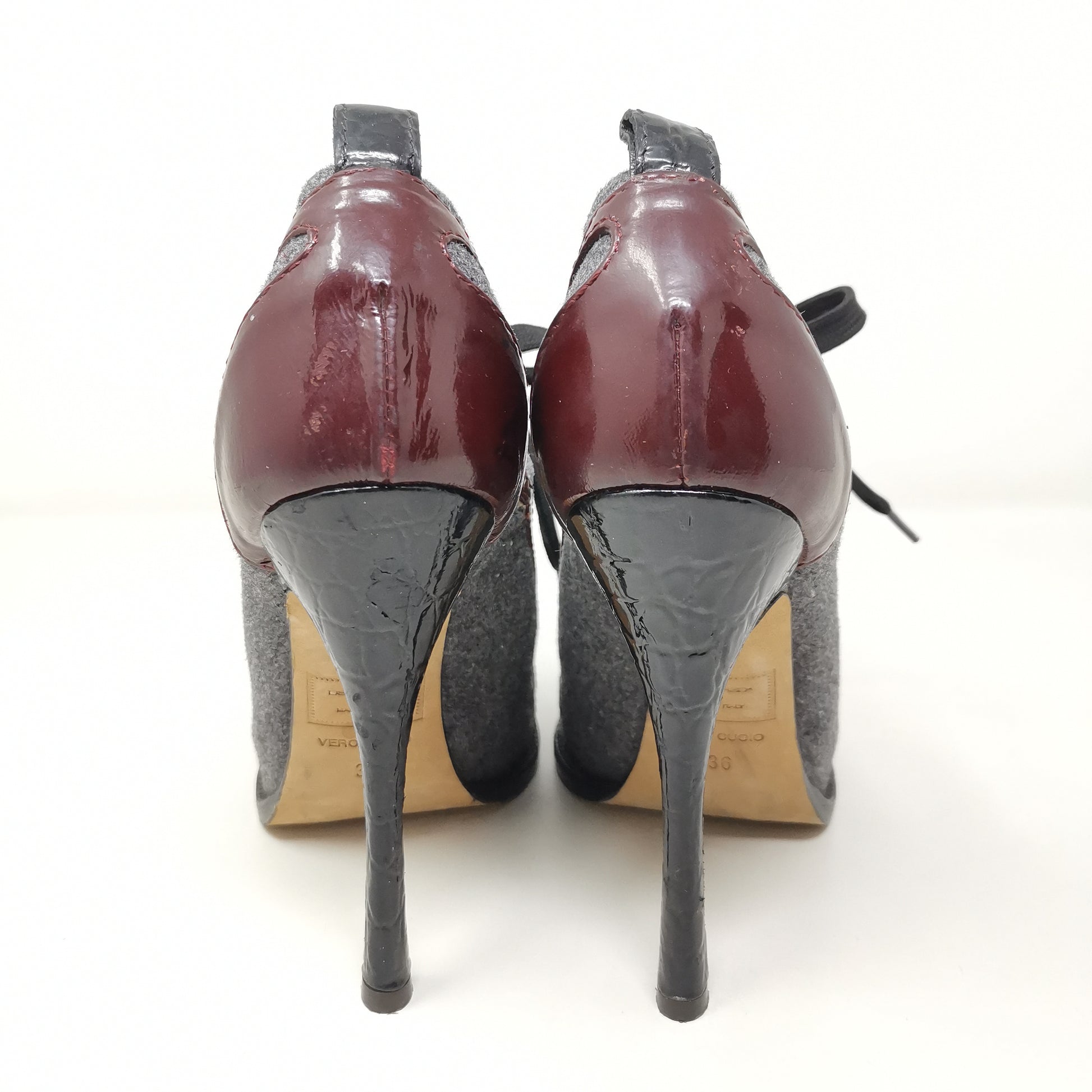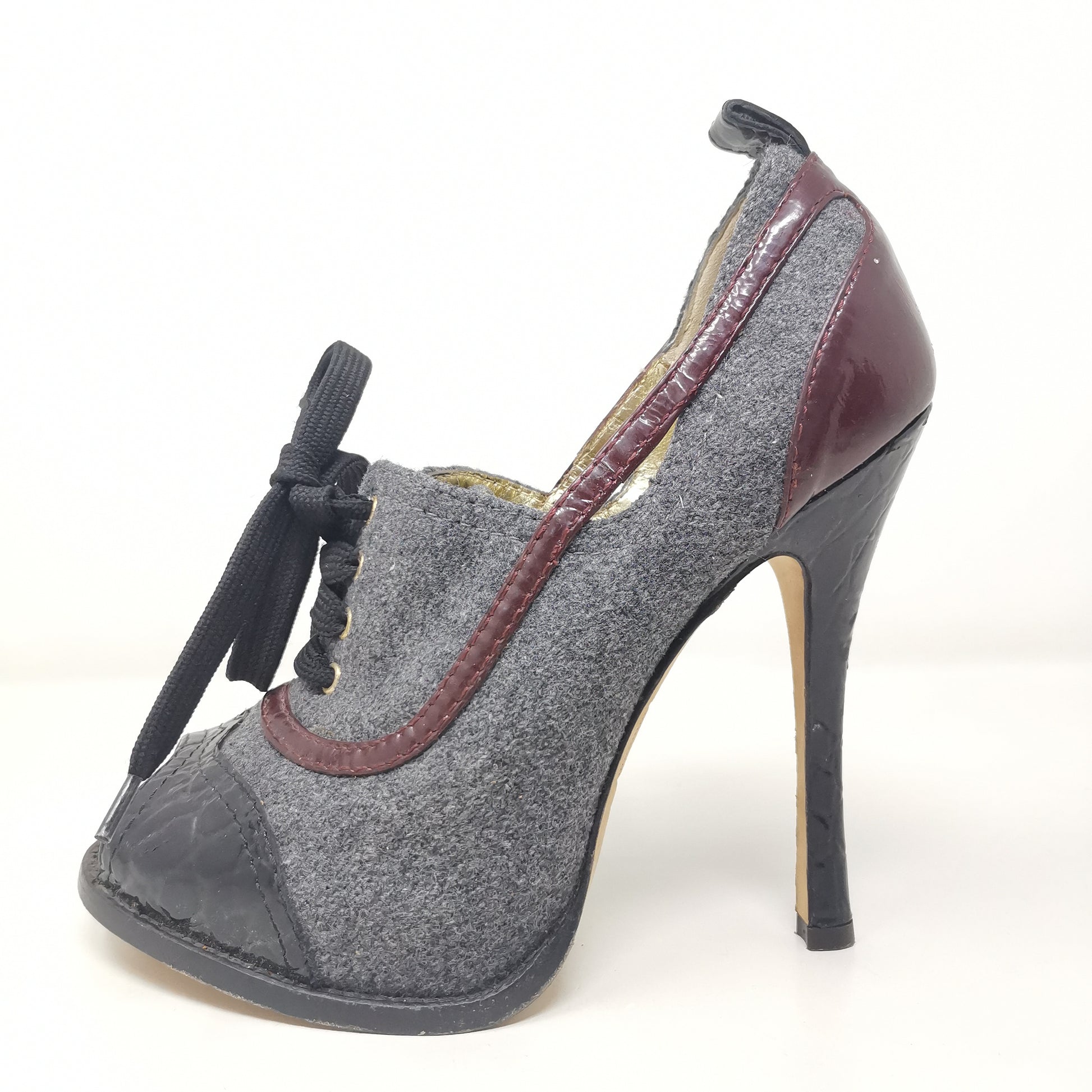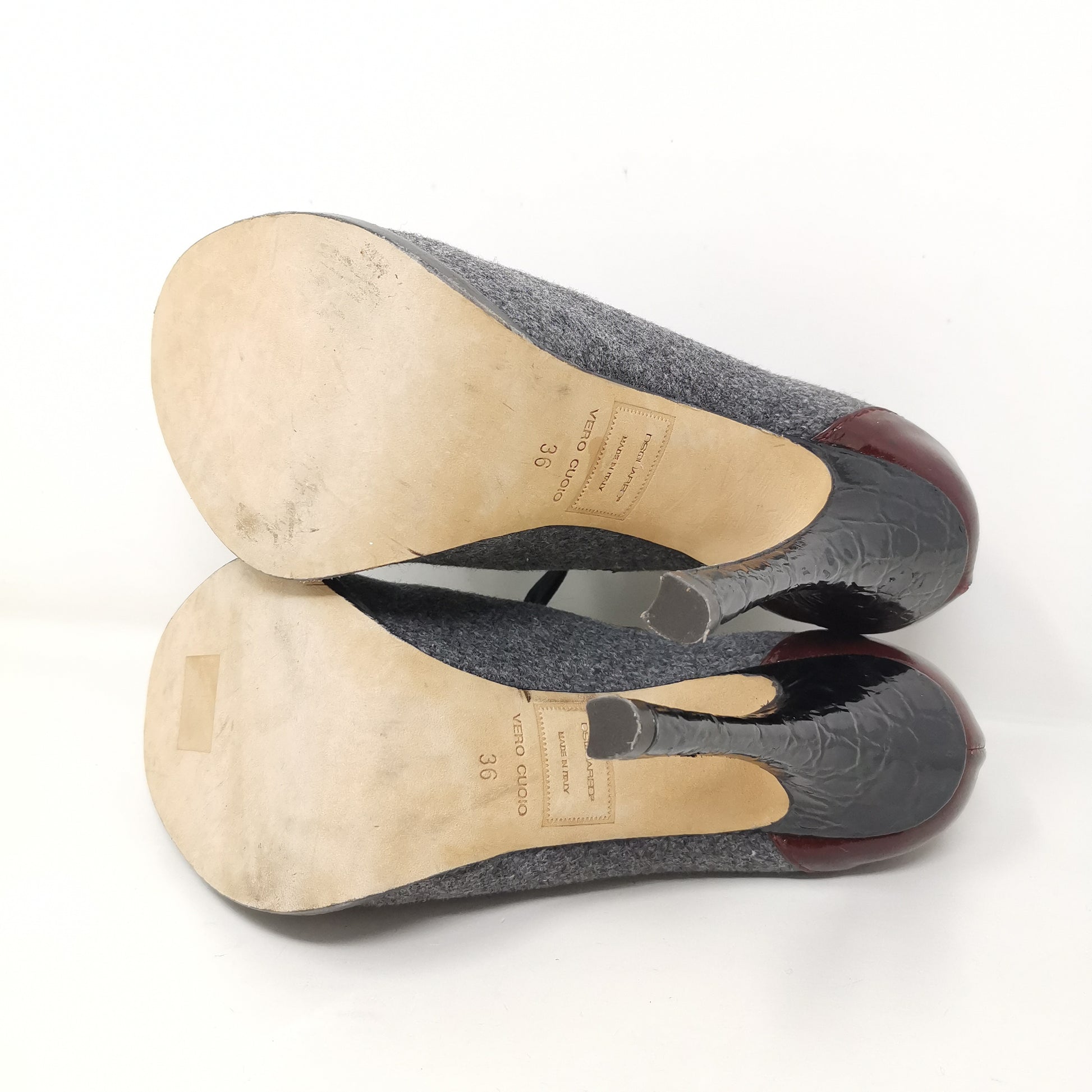 Open toe leather pumps covered in gray fabric with slightly marked black patent leather heel 12.5 cm high and 2 cm platform. Inner sole in leather and outer sole in leather, details in burgundy-colored leather on the heel with some small signs. Size 36 EU.