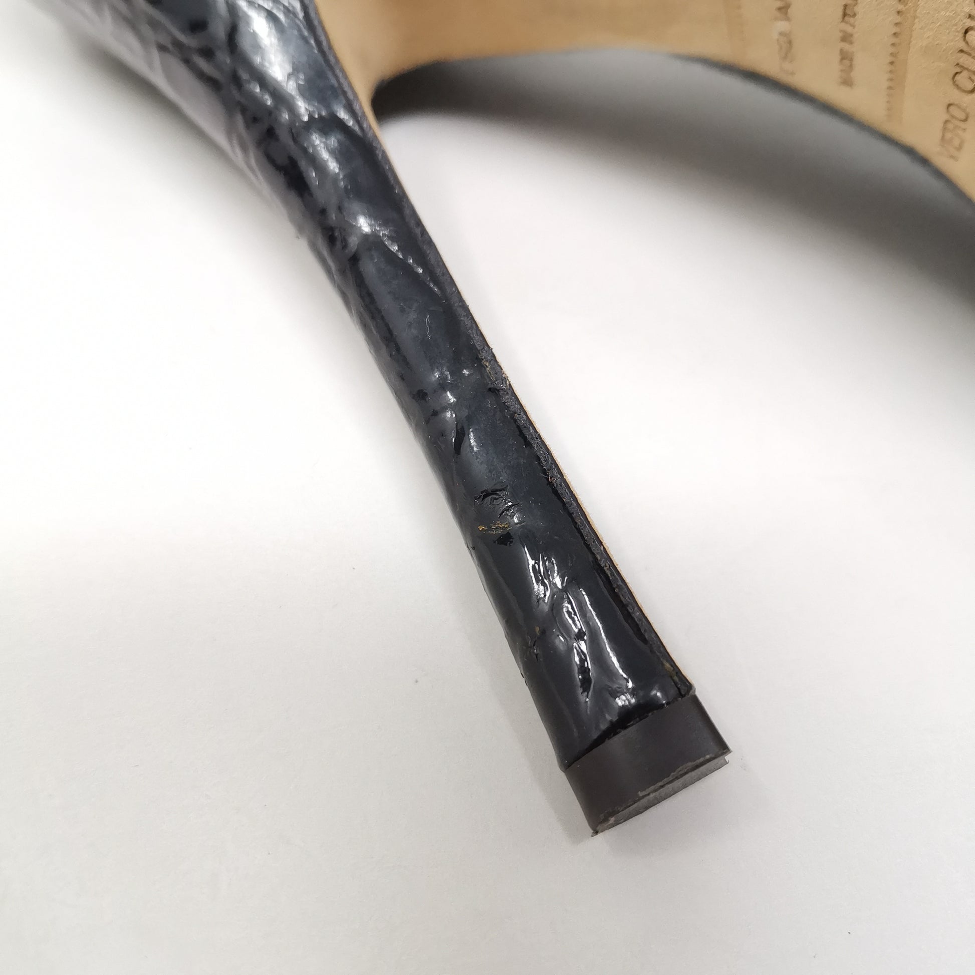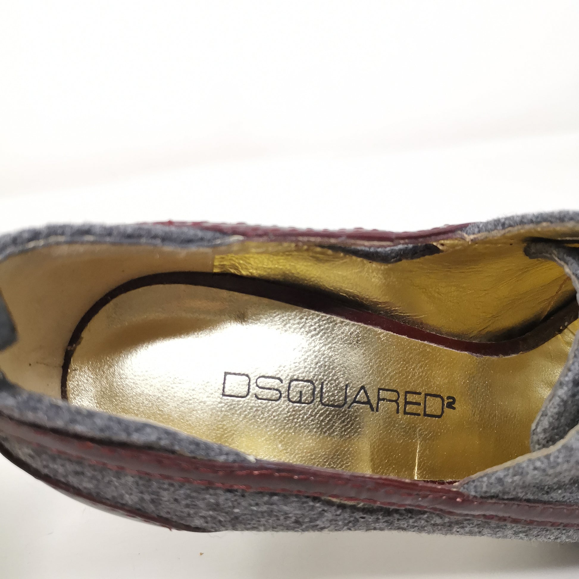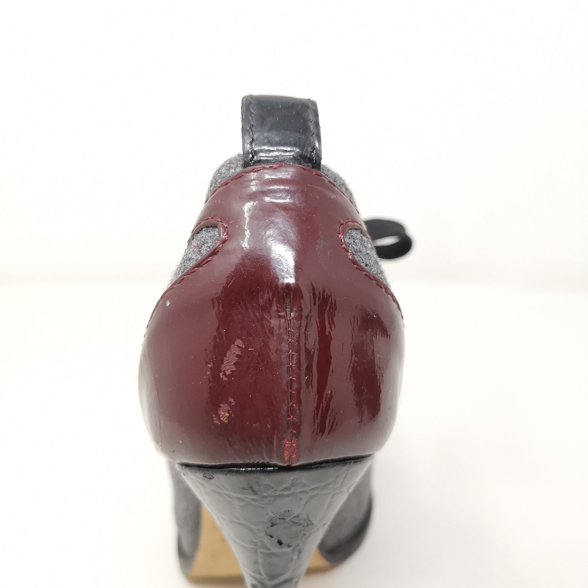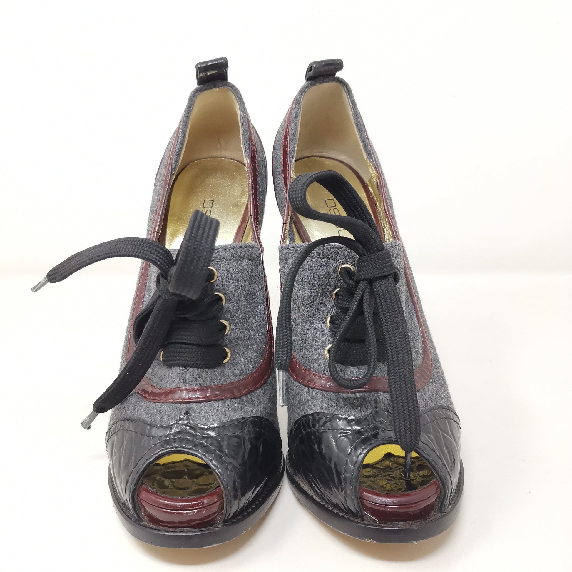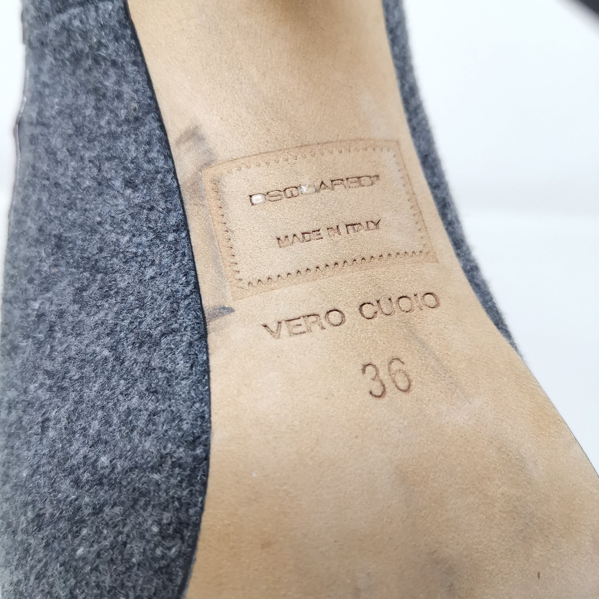 Open toe leather pumps covered in gray fabric with slightly marked black patent leather heel 12.5 cm high and 2 cm platform. Inner sole in leather and outer sole in leather, details in burgundy-colored leather on the heel with some small signs. Size 36 EU.