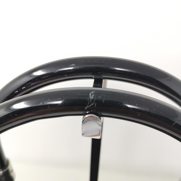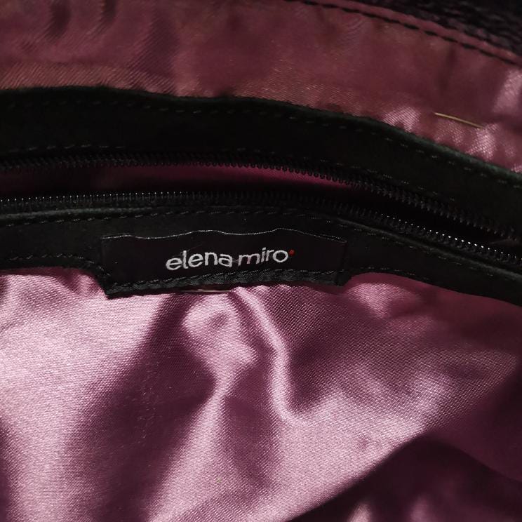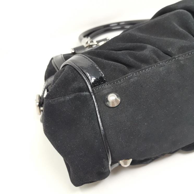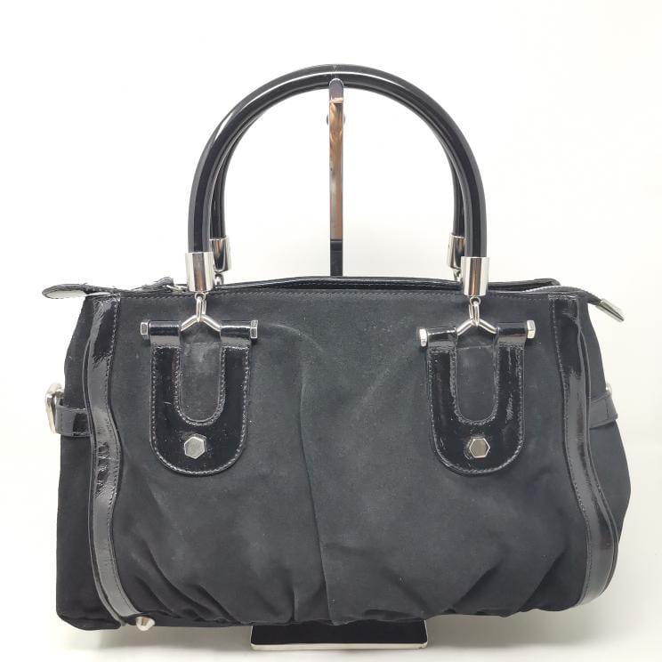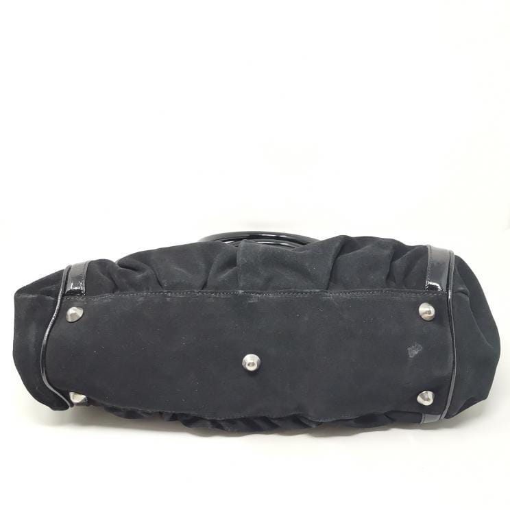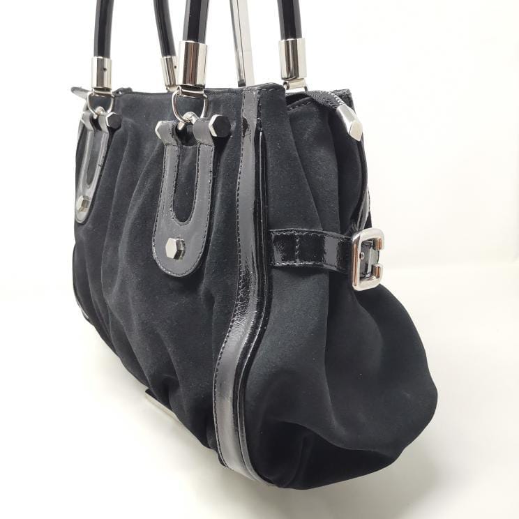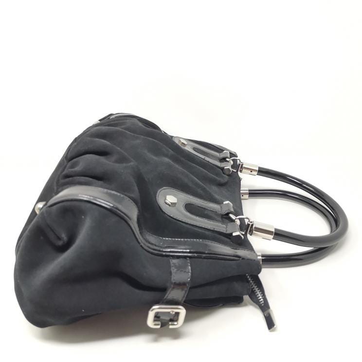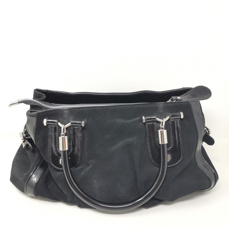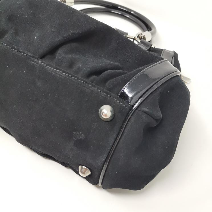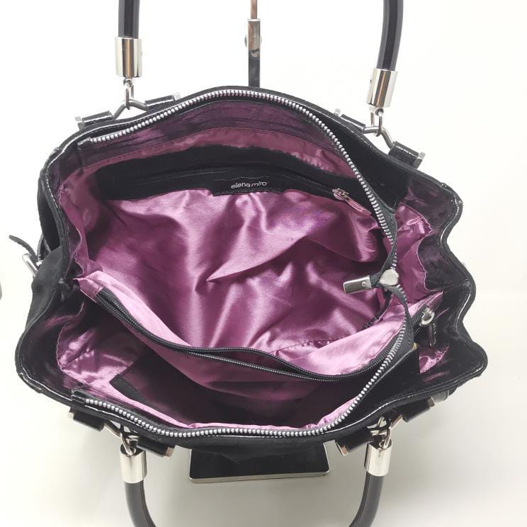 Black faux suede bag with double rigid handles, zipped opening and fabric interior with pockets and zipped divider. Silver-coloured metal hardware and protective metal feet on the bottom, black patent leather details.