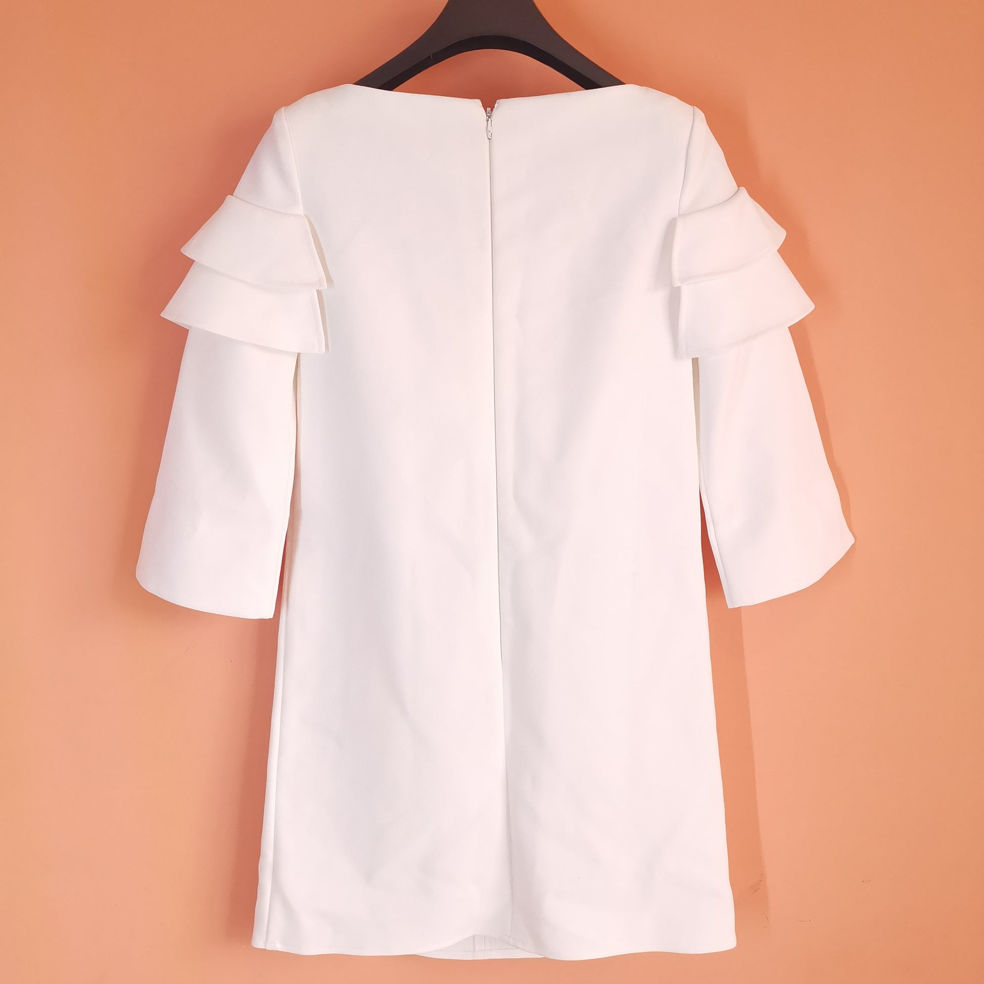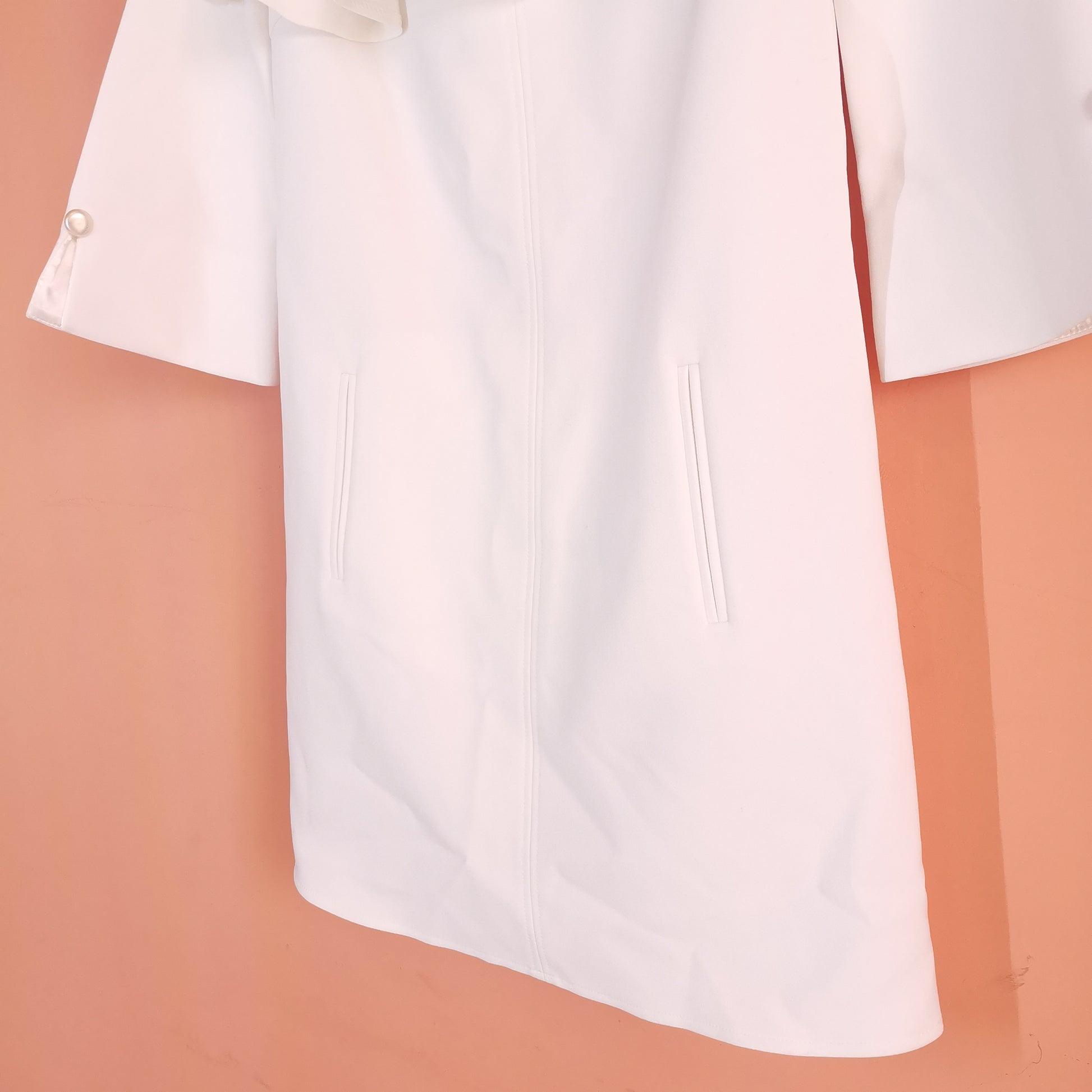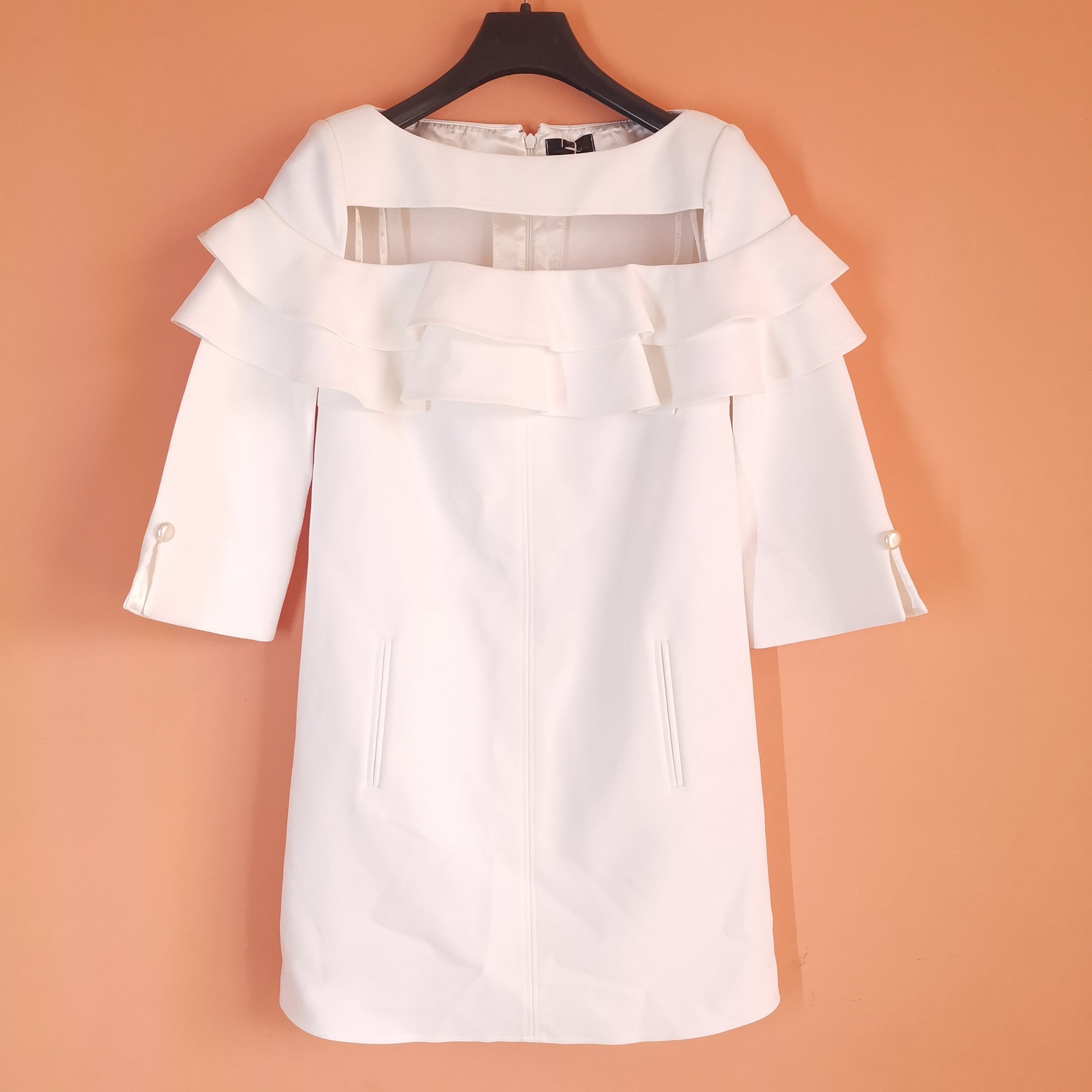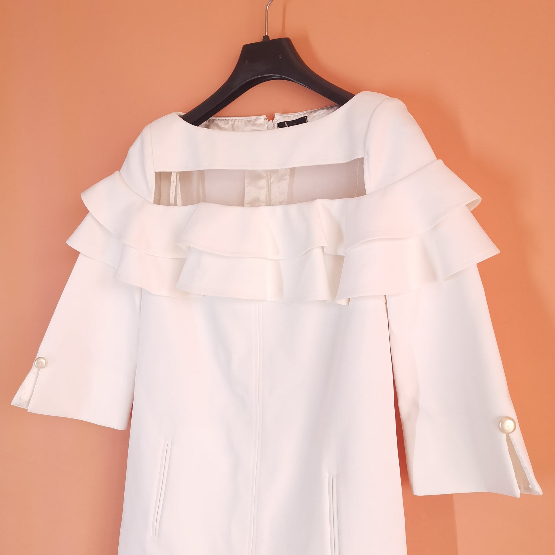 White dress made of synthetic fabric, 3/4 sleeves with pearl button, tulle decoration on chest ruffles on chest and sleeves. total length 80 cm, chest width 43 cm, shoulder width 34 cm, sleeve length 43 cm.