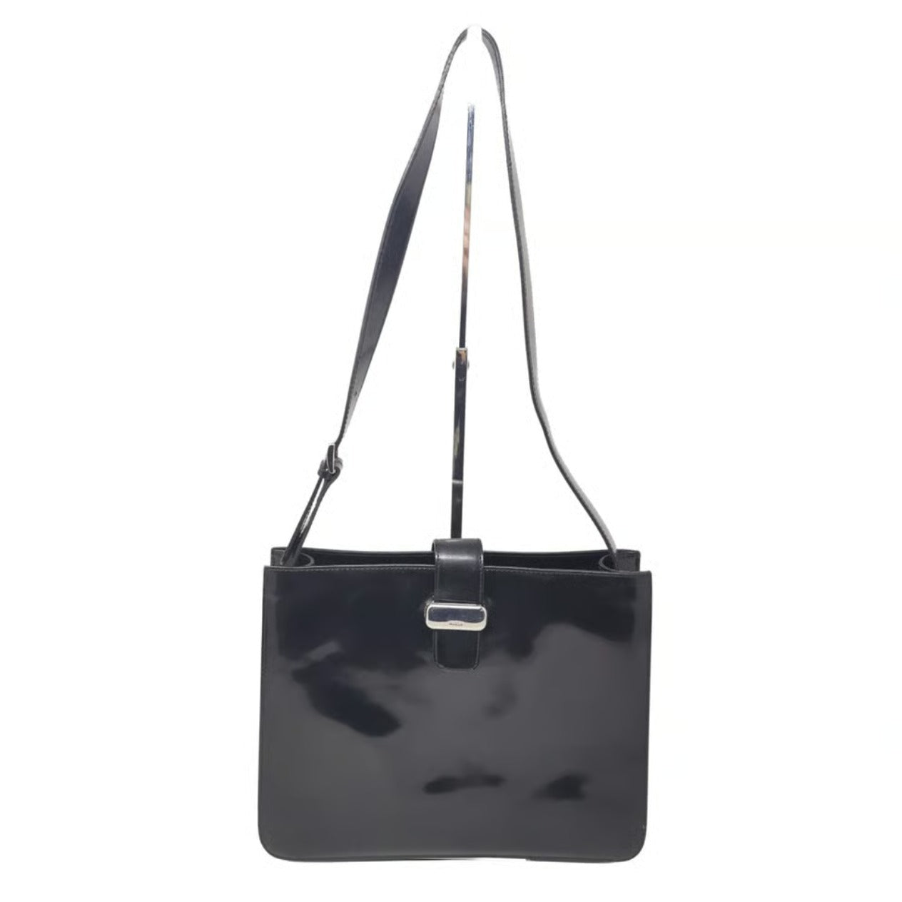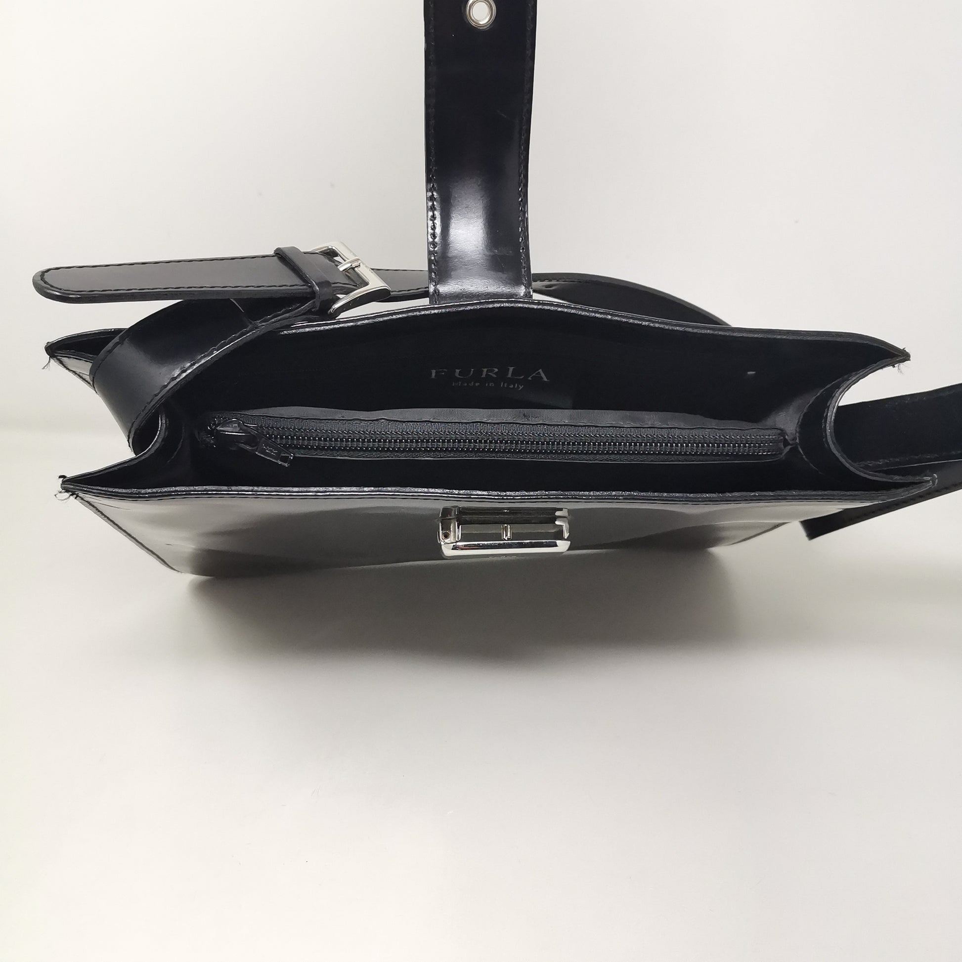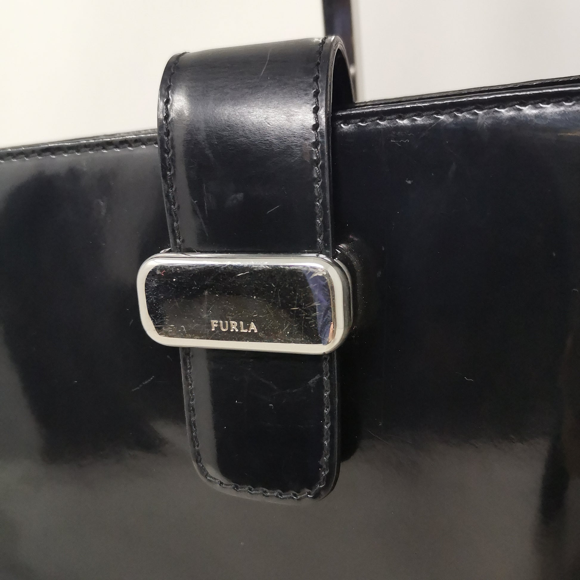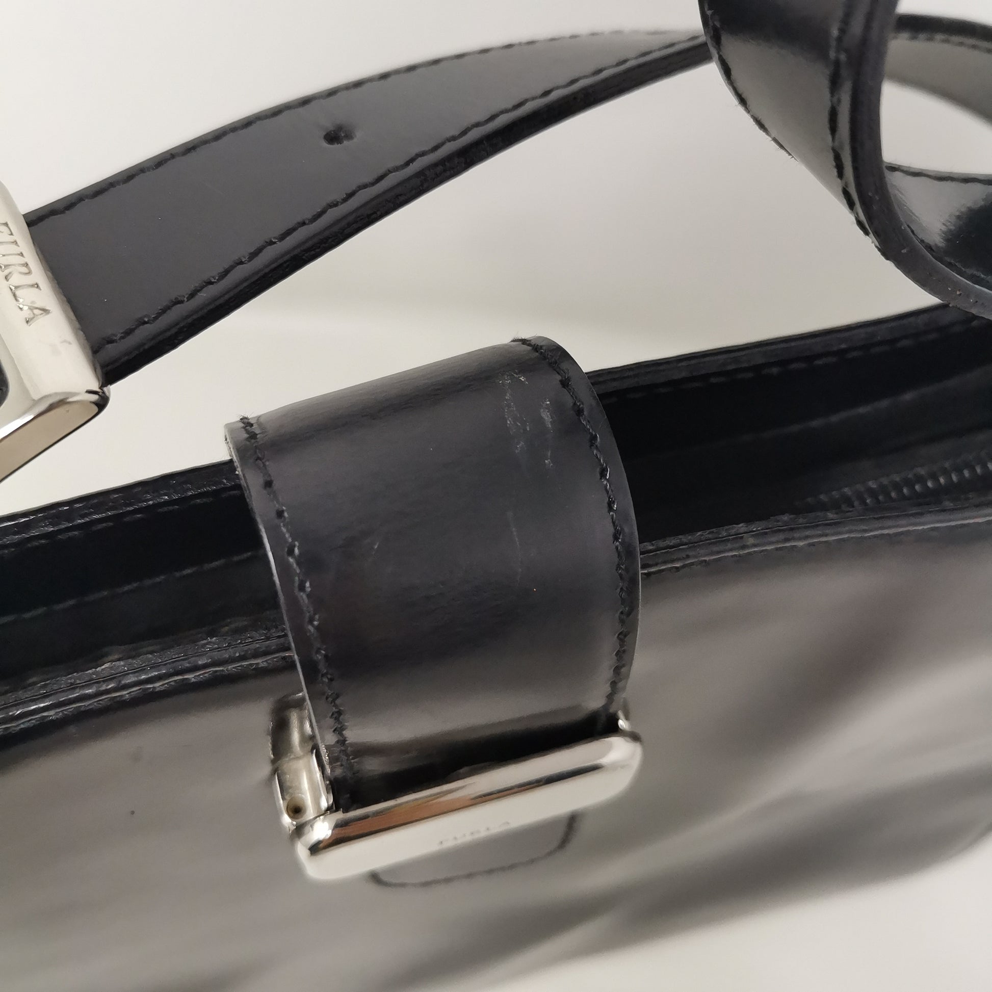 Black leather bag with single handle, fabric interior with maxi pocket that creates two compartments, closure with silver-colored metal plate. There are some marks on the leather part in general, adjustable handle. Width 29cm, height 22.5cm, depth 8cm, handle height 36cm.