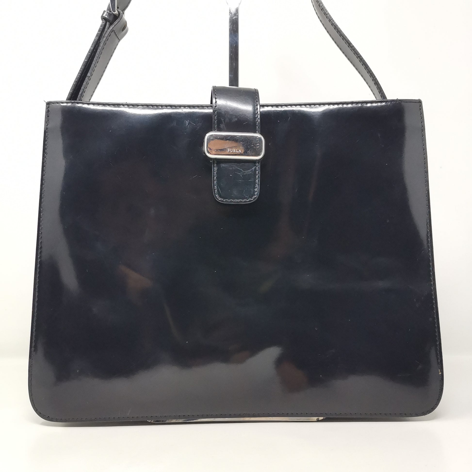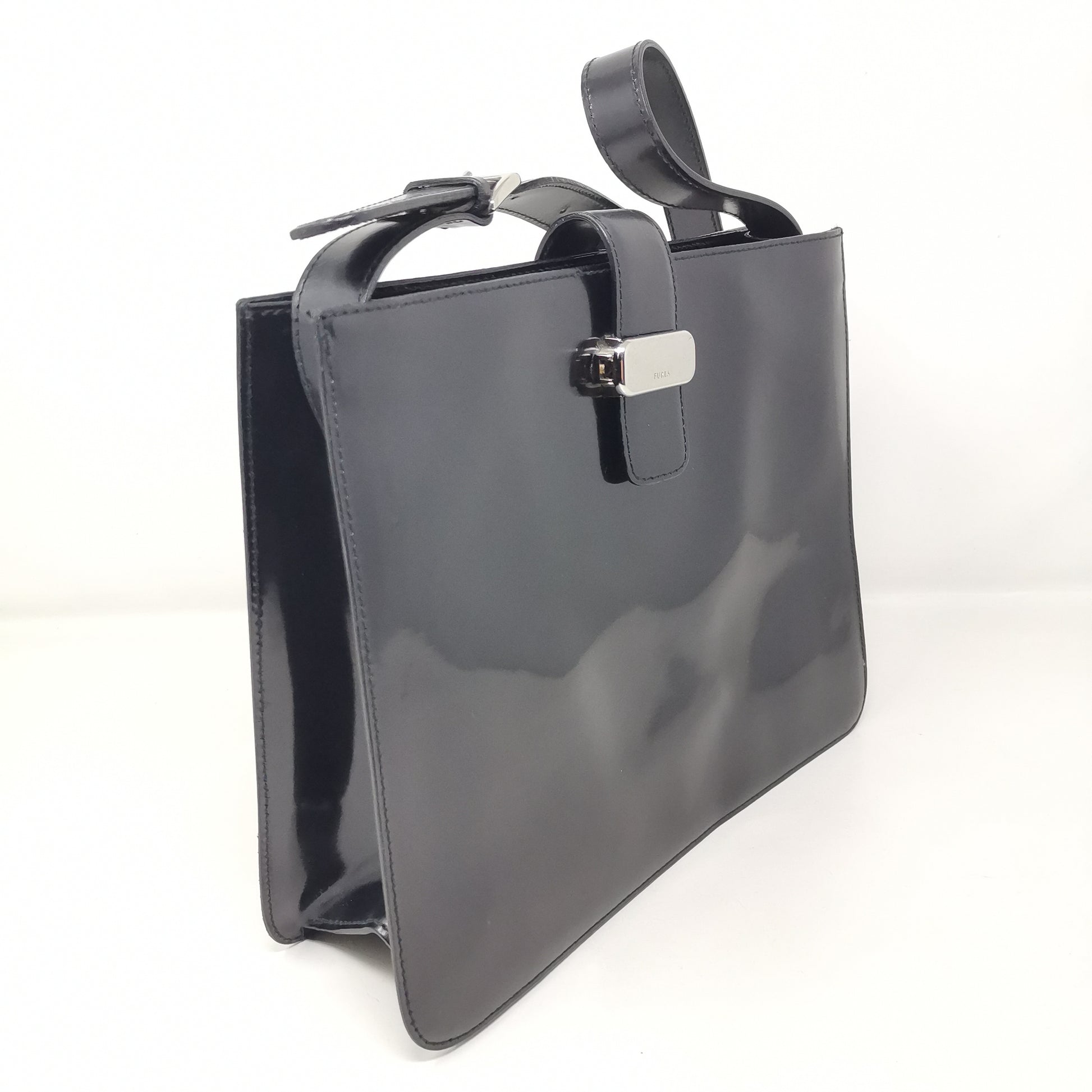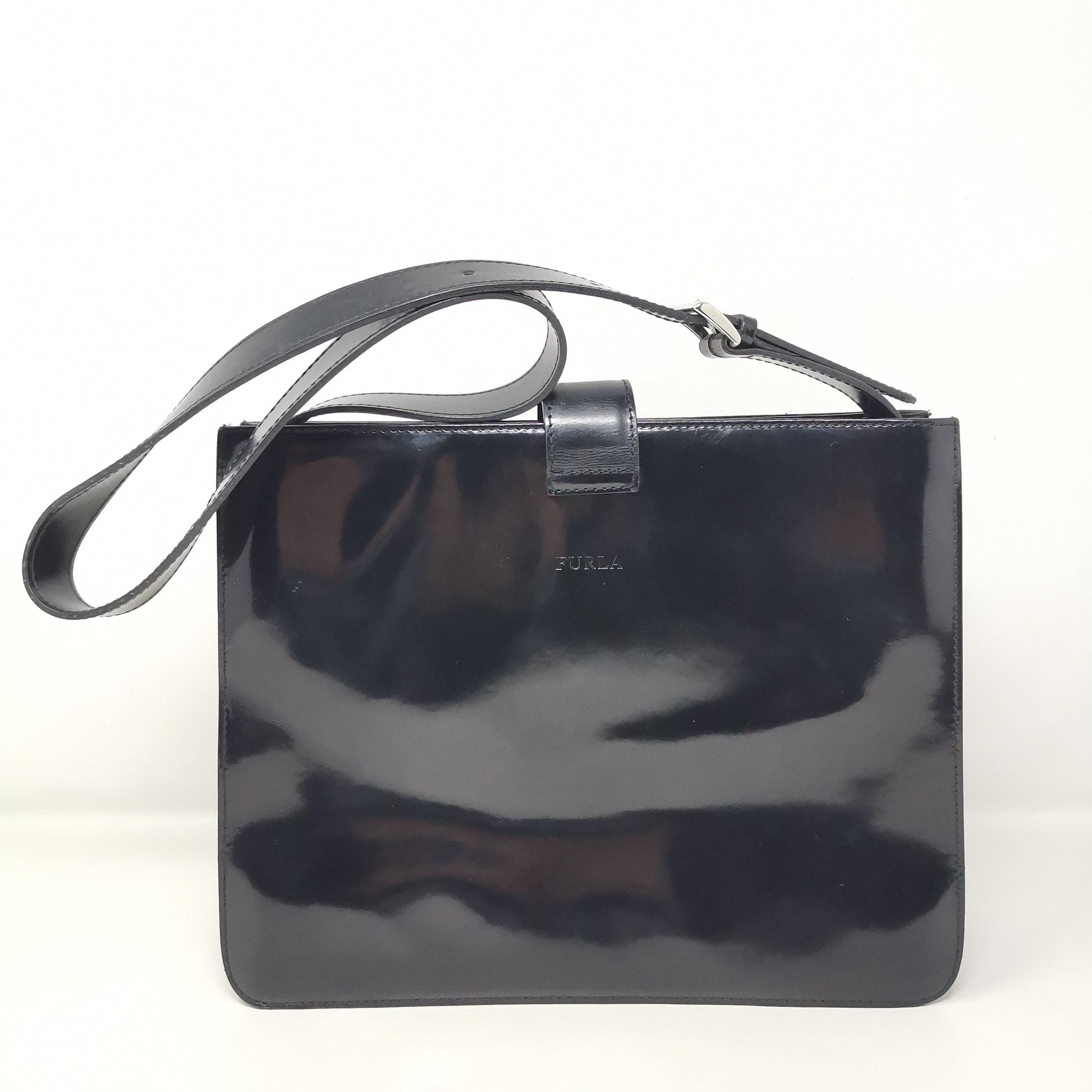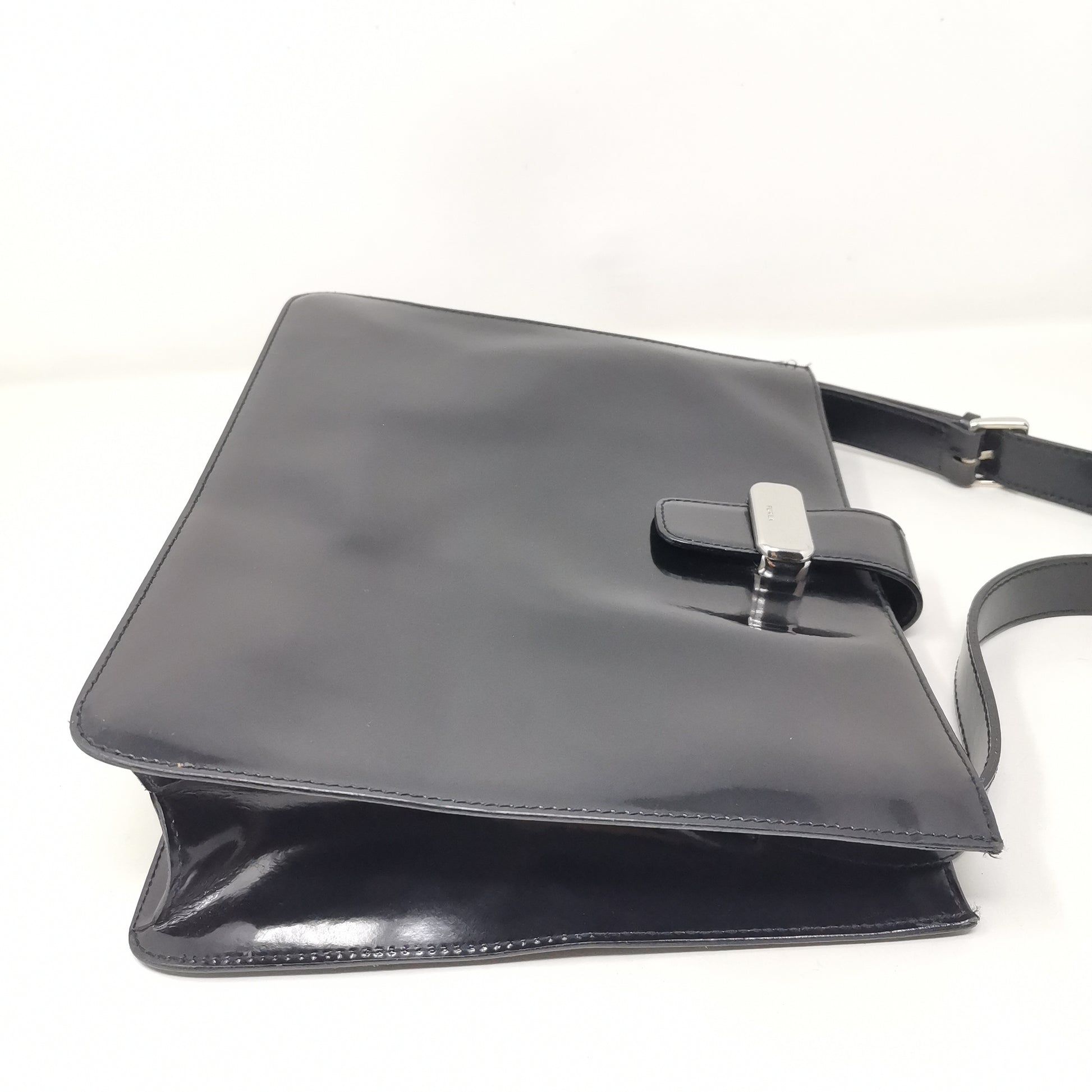 Black leather bag with single handle, fabric interior with maxi pocket that creates two compartments, closure with silver-colored metal plate. There are some marks on the leather part in general, adjustable handle. Width 29cm, height 22.5cm, depth 8cm, handle height 36cm.