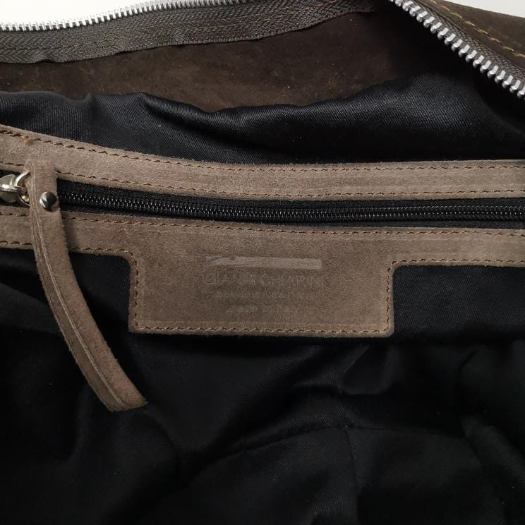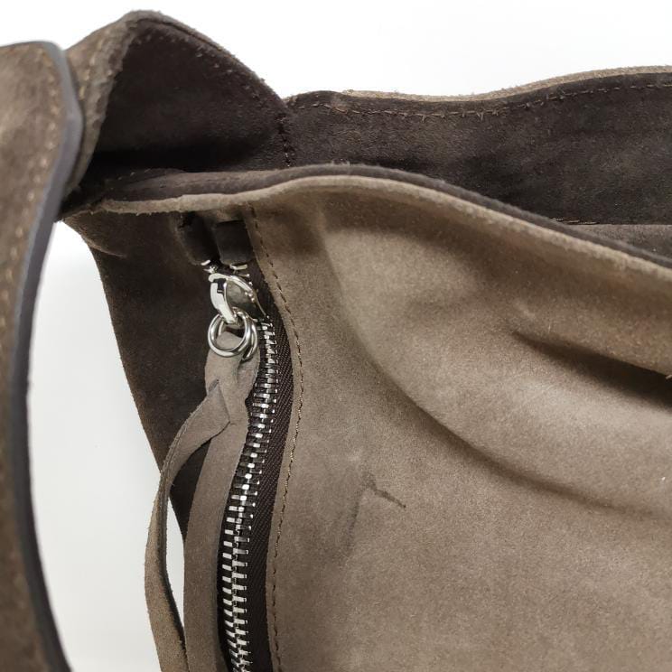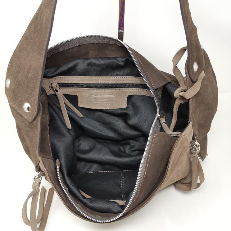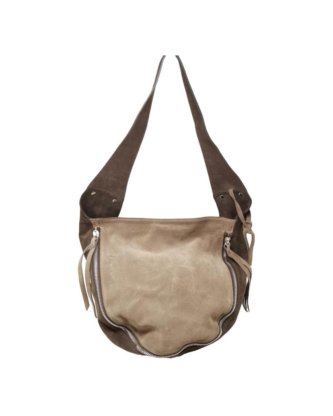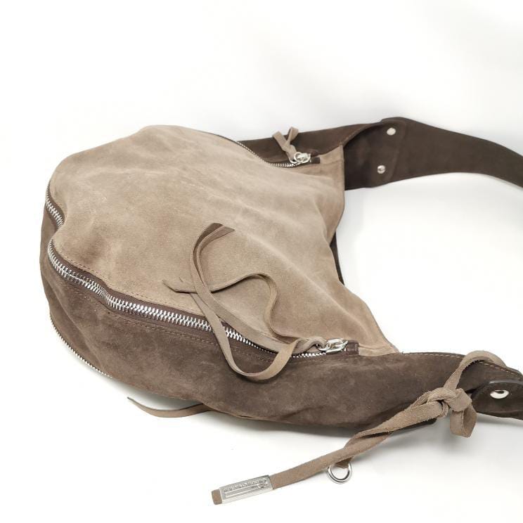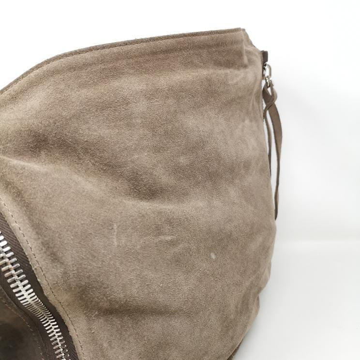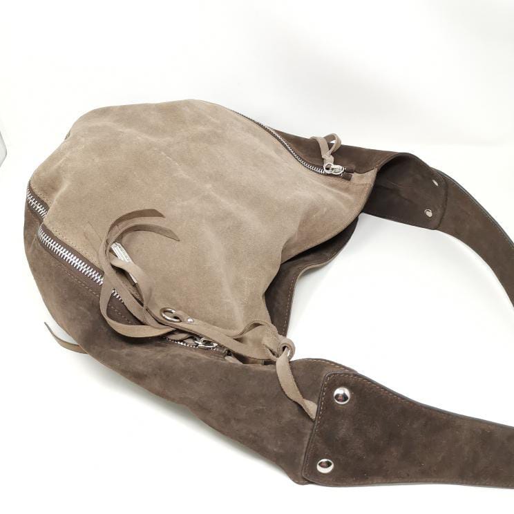 Brown and beige suede maxi shoulder bag. Silver-coloured metal hardware, zip opening and fabric interior with pocket. Oval shape on the bottom, very capacious. A few small marks and haloes present.