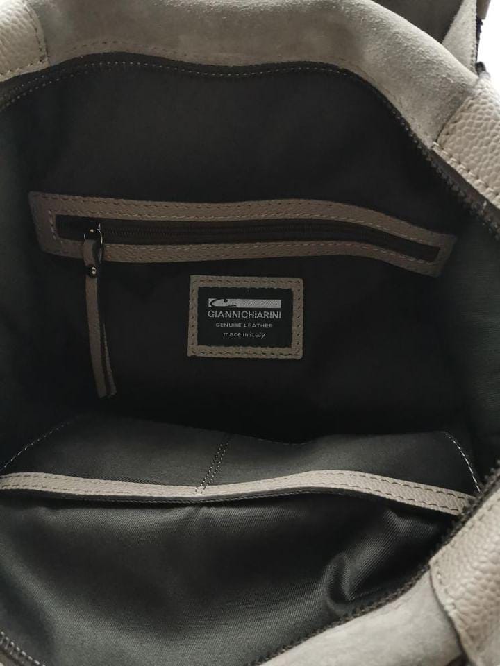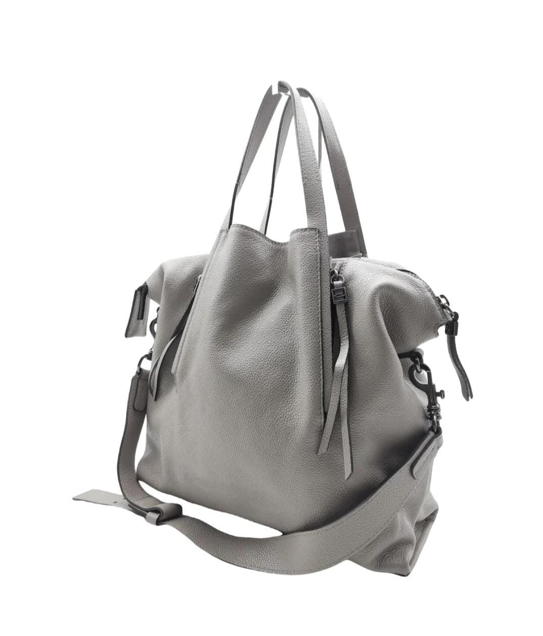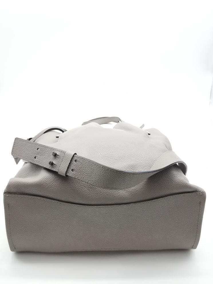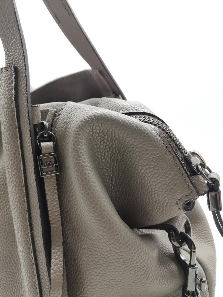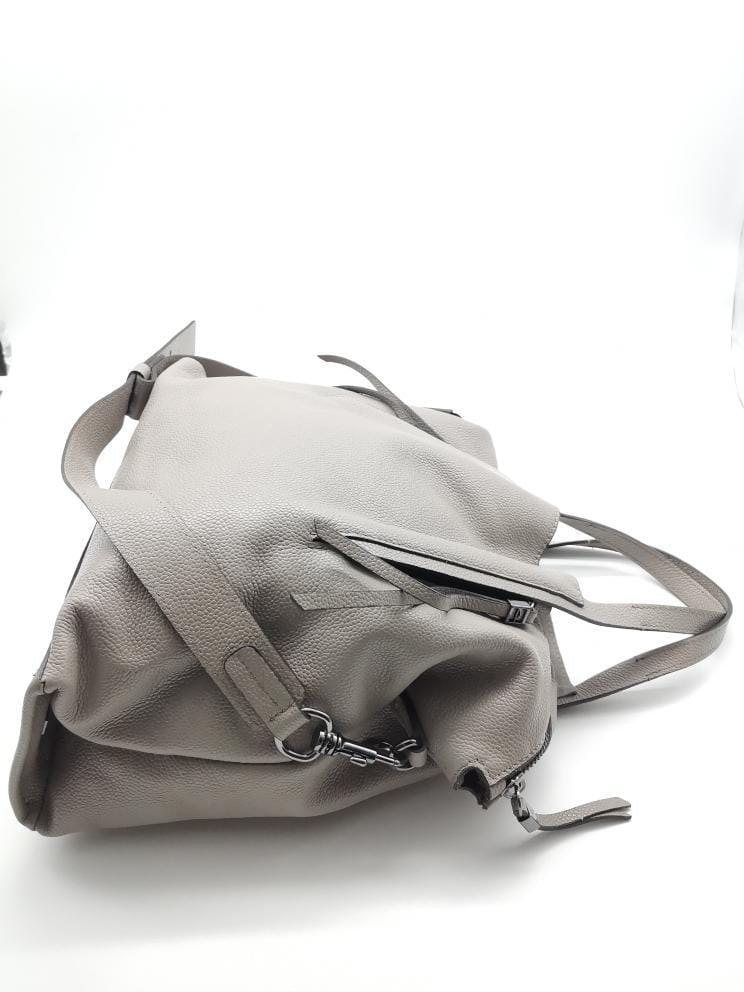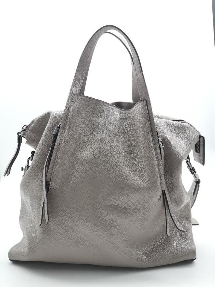 Gray leather bag with double handles and adjustable, removable shoulder strap. Zipper opening, fabric interior with pockets, silver-colored metal hardware. Perfect as handbag, shoulder bag or as crossbody bag with shoulder strap. Never used.