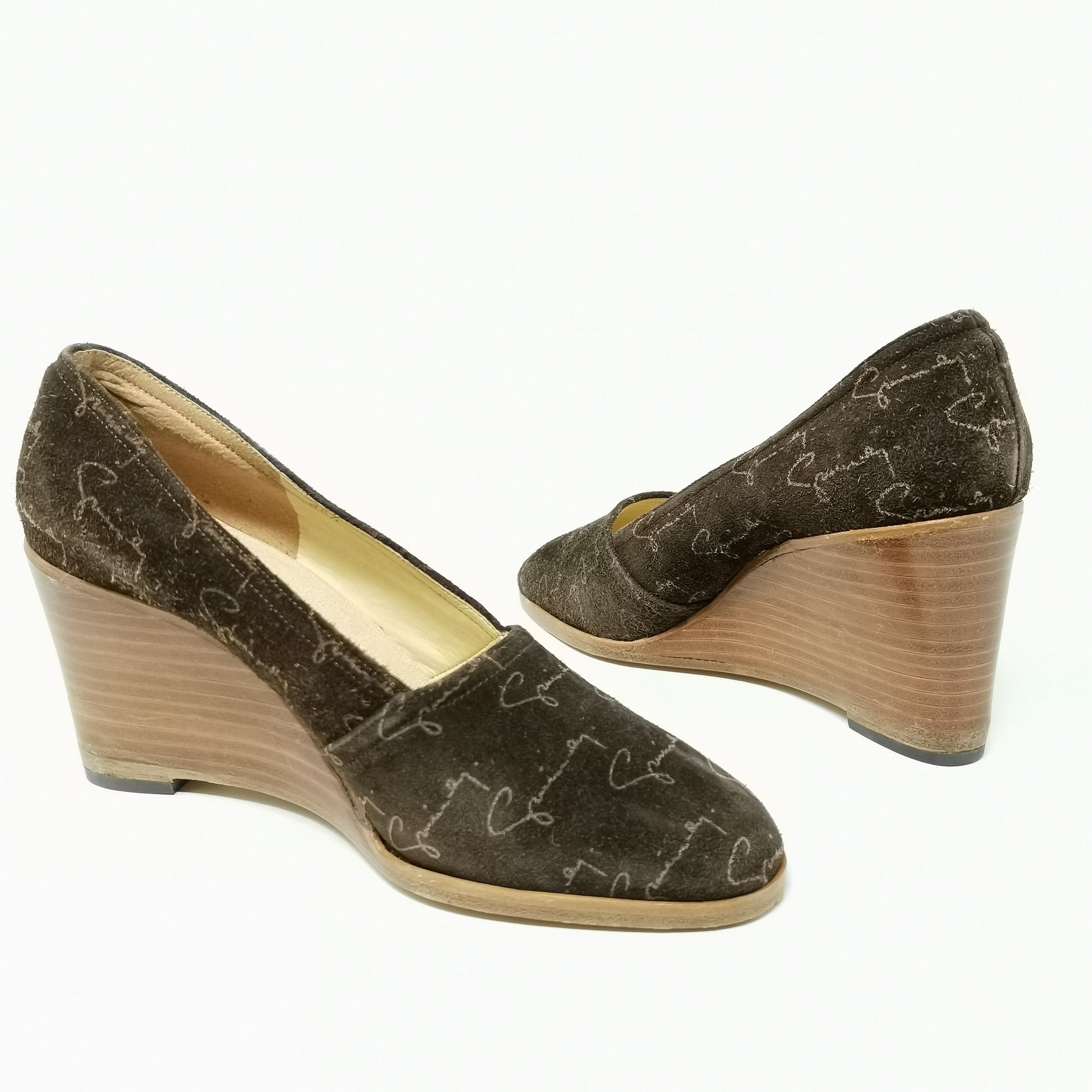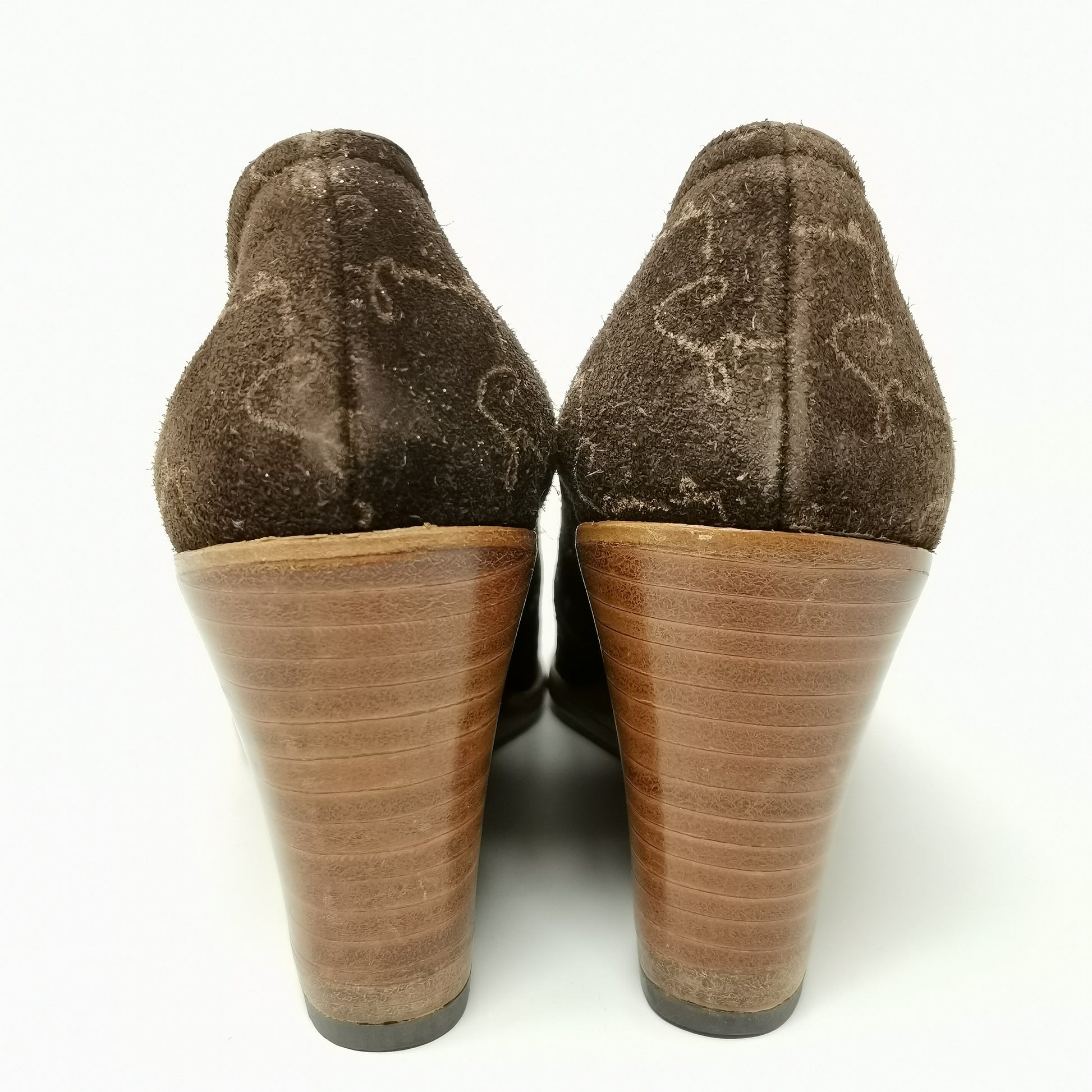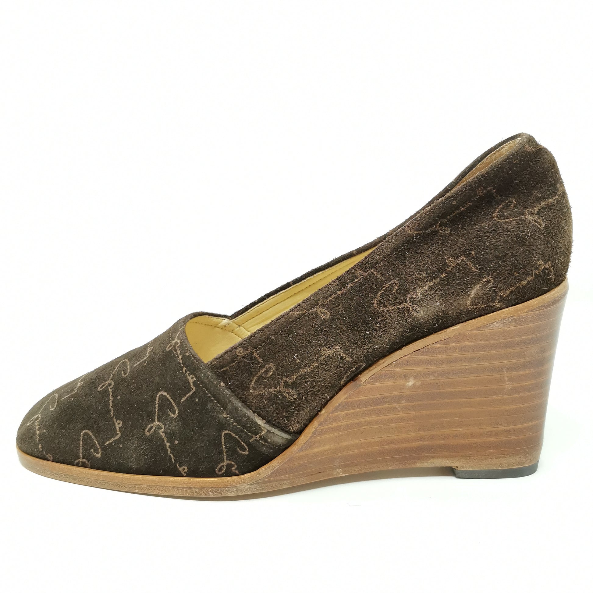 Brown suede shoes with contrasting brand name. 8 cm high wooden wedge with some marks, internal leather sole and external leather with some marks. The inner sole measures 23.5 cm. Size 36.5 EU.