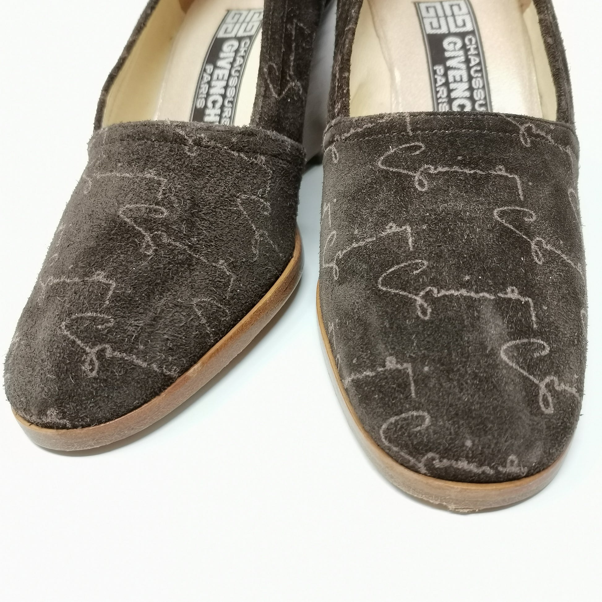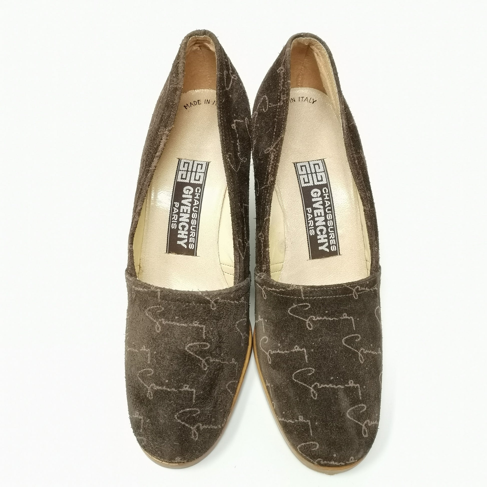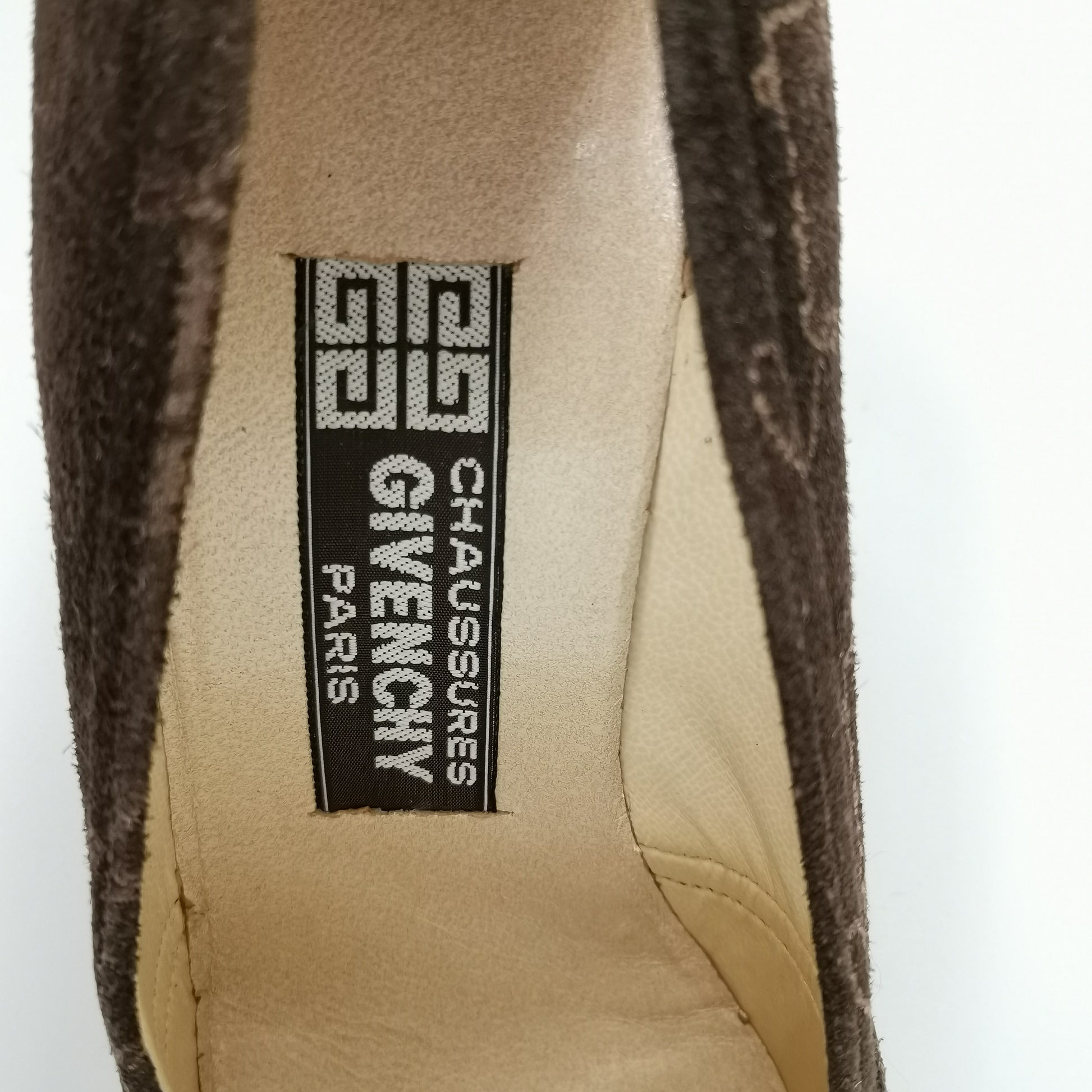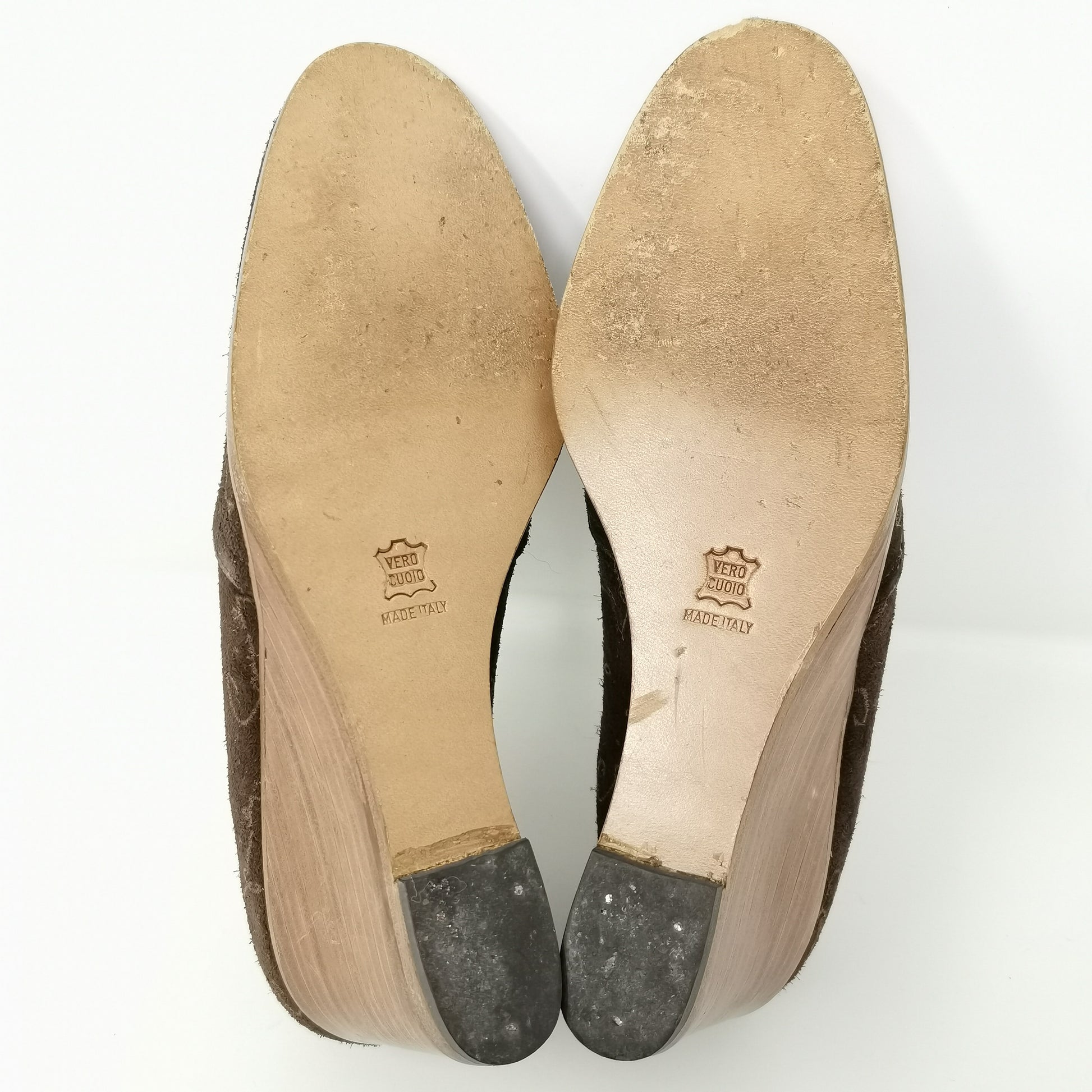 Brown suede shoes with contrasting brand name. 8 cm high wooden wedge with some marks, internal leather sole and external leather with some marks. The inner sole measures 23.5 cm. Size 36.5 EU.