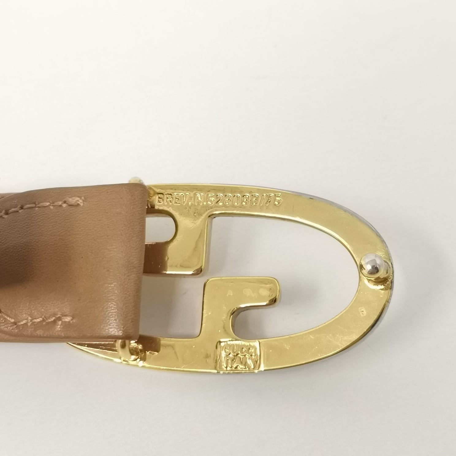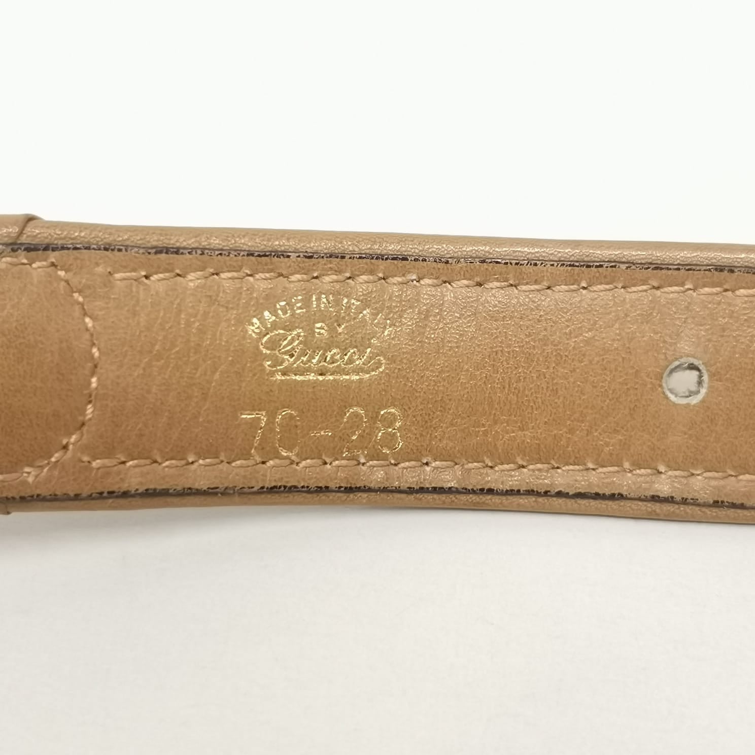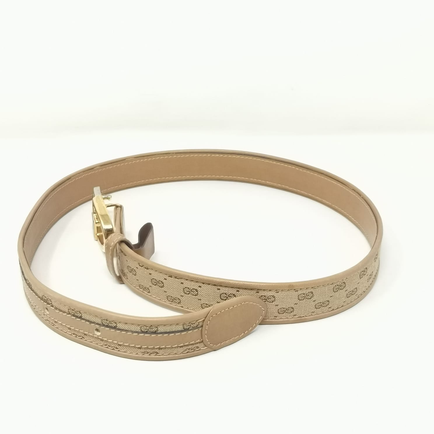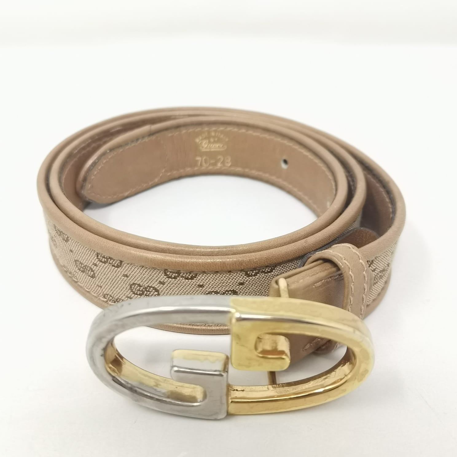 Belt in logo-print fabric and beige leather with slightly oxidized double G buckle in slightly oxidized silver and gold-colored metal. Total length excluding buckle 78 cm, thickness 2.4 cm, some small marks. Size 70.