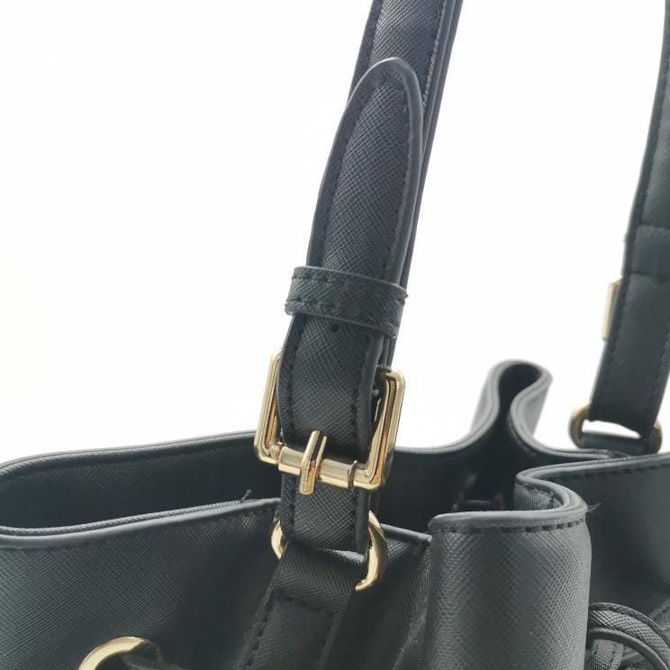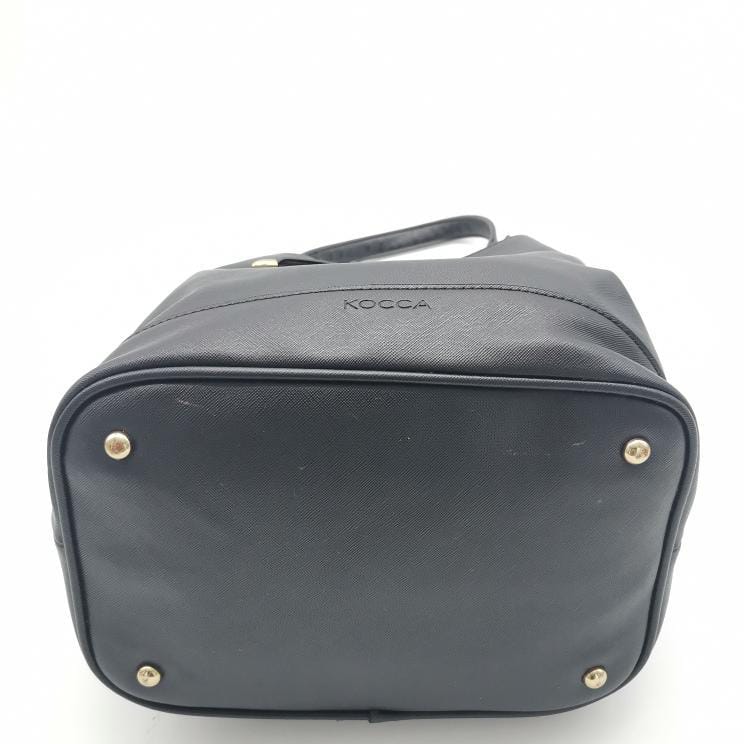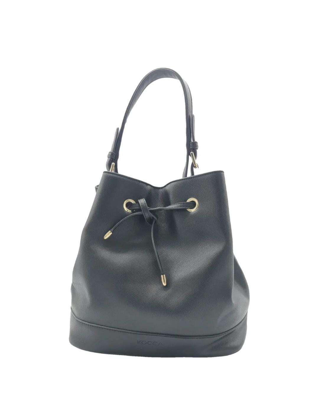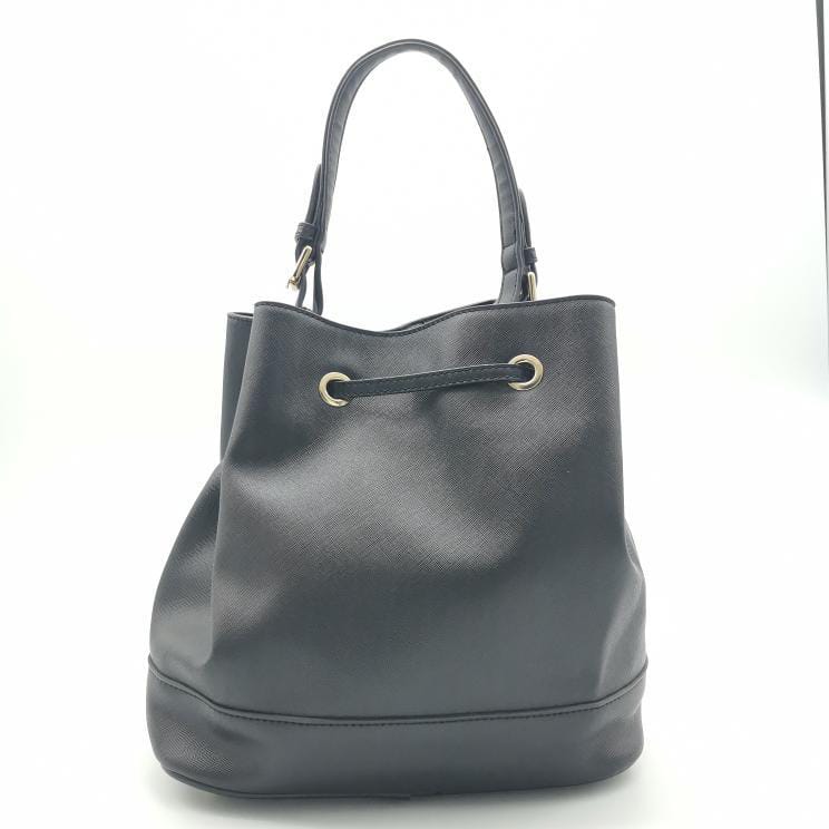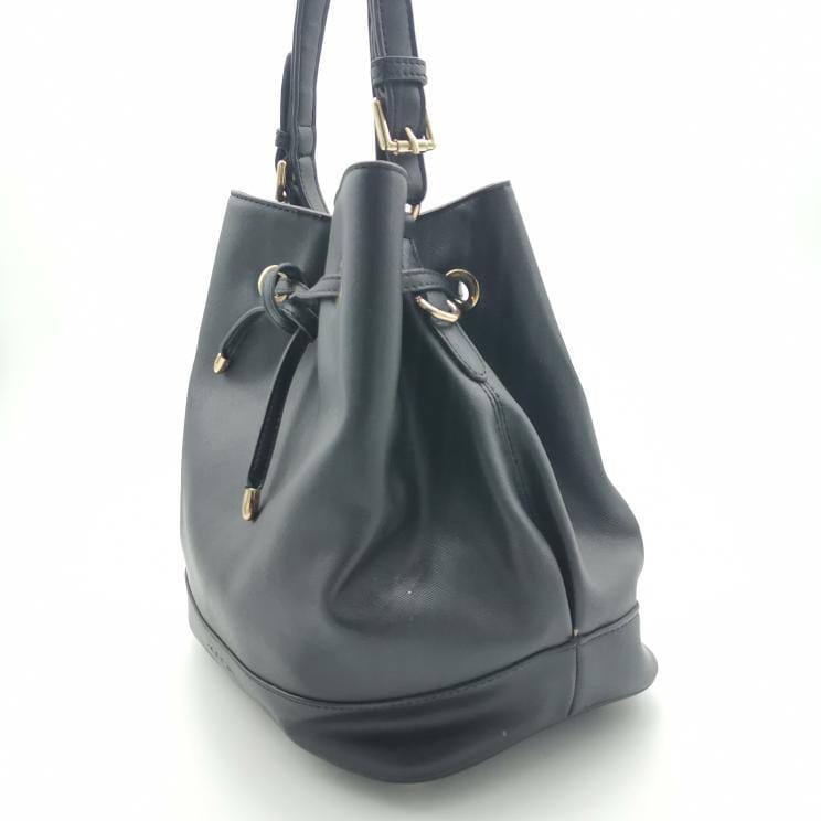Black polyurethane bucket bag with single handle and coulisse closure. Gold-coloured metal hardware, fabric interior with pockets and protective metal part on the bottom.
