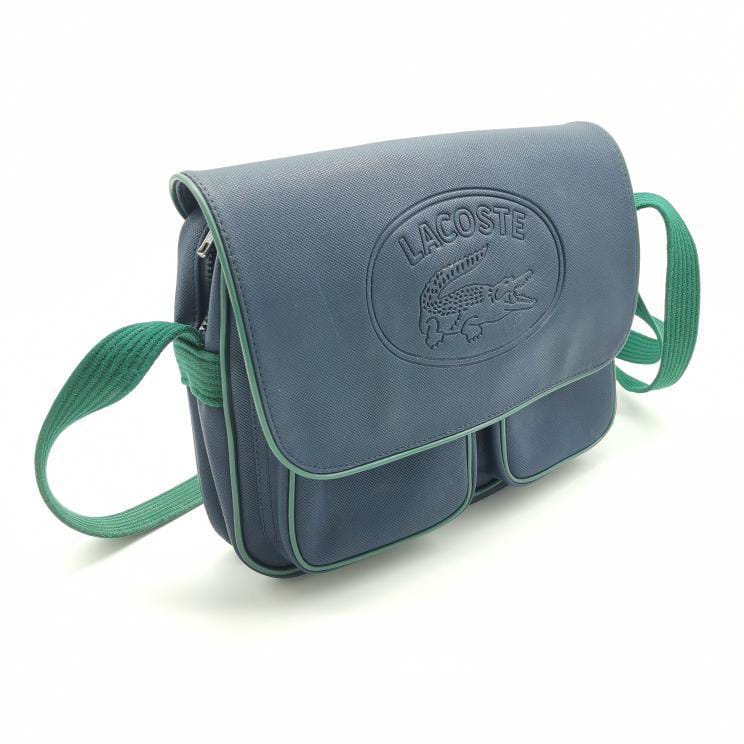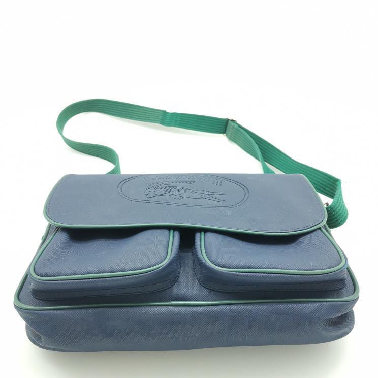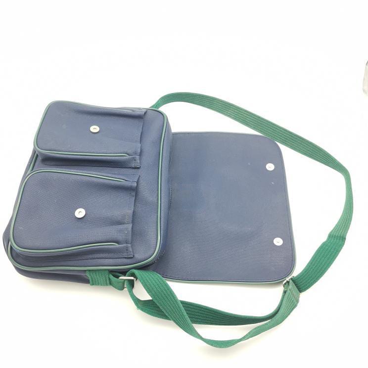 Vintage blue synthetic bag with adjustable green cotton shoulder strap. Flap and zip opening, interior with pockets, silver-coloured metal hardware, maxi external pocket on the back with zip and two external pockets under the flap, green piping. A few small marks.